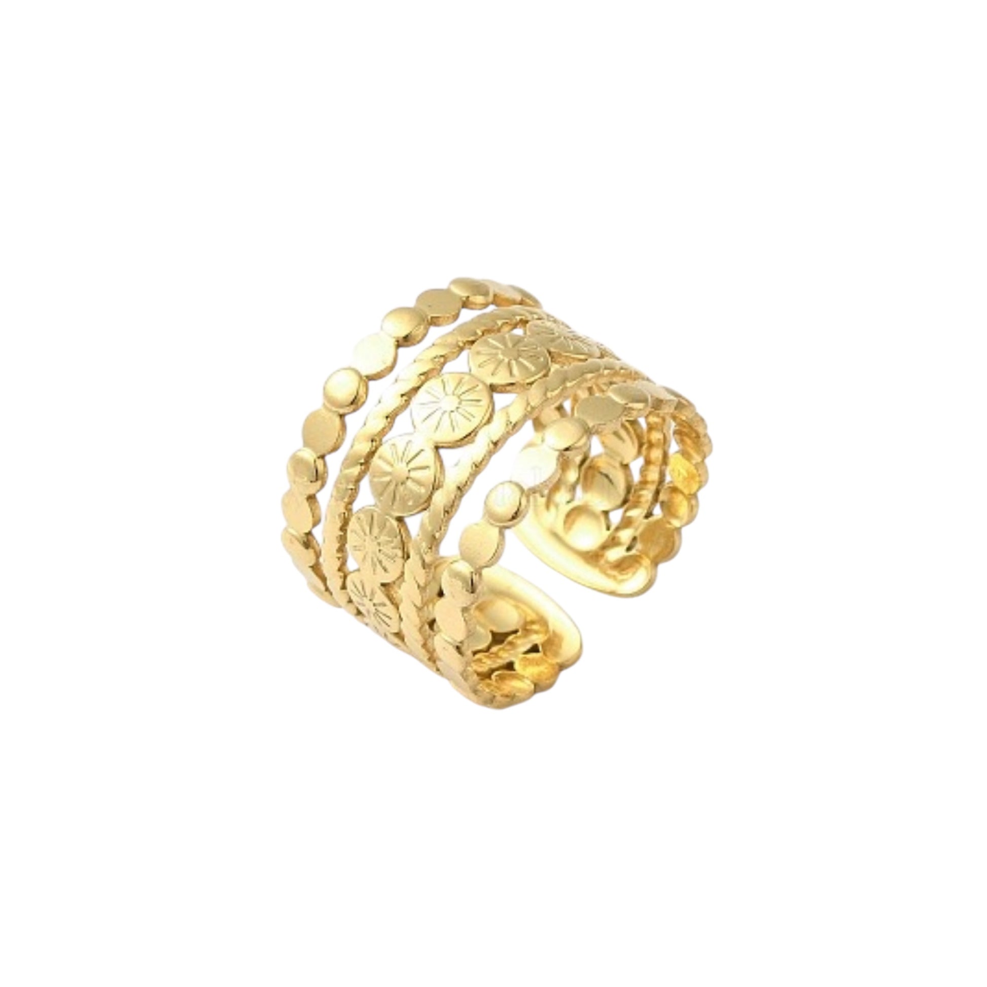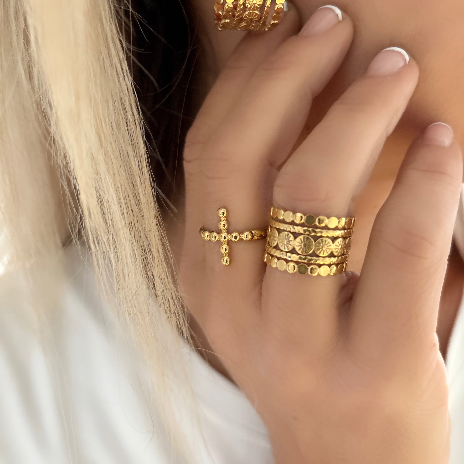 Laissez-vous tenter par l'élégance luxueuse de nos bagues HARMONY RINGS. Fabriquées en acier inoxydable et recouvertes d'un placage or éblouissant, ces bagues sont non seulement élégantes mais également réglables pour un ajustement parfait. L'anneau croisé et l'anneau de déclaration en filigrane ajoutent une touche de sophistication à n'importe quelle tenue. Complétez votre look et trouvez l'harmonie dans votre style avec ces superbes bagues.
