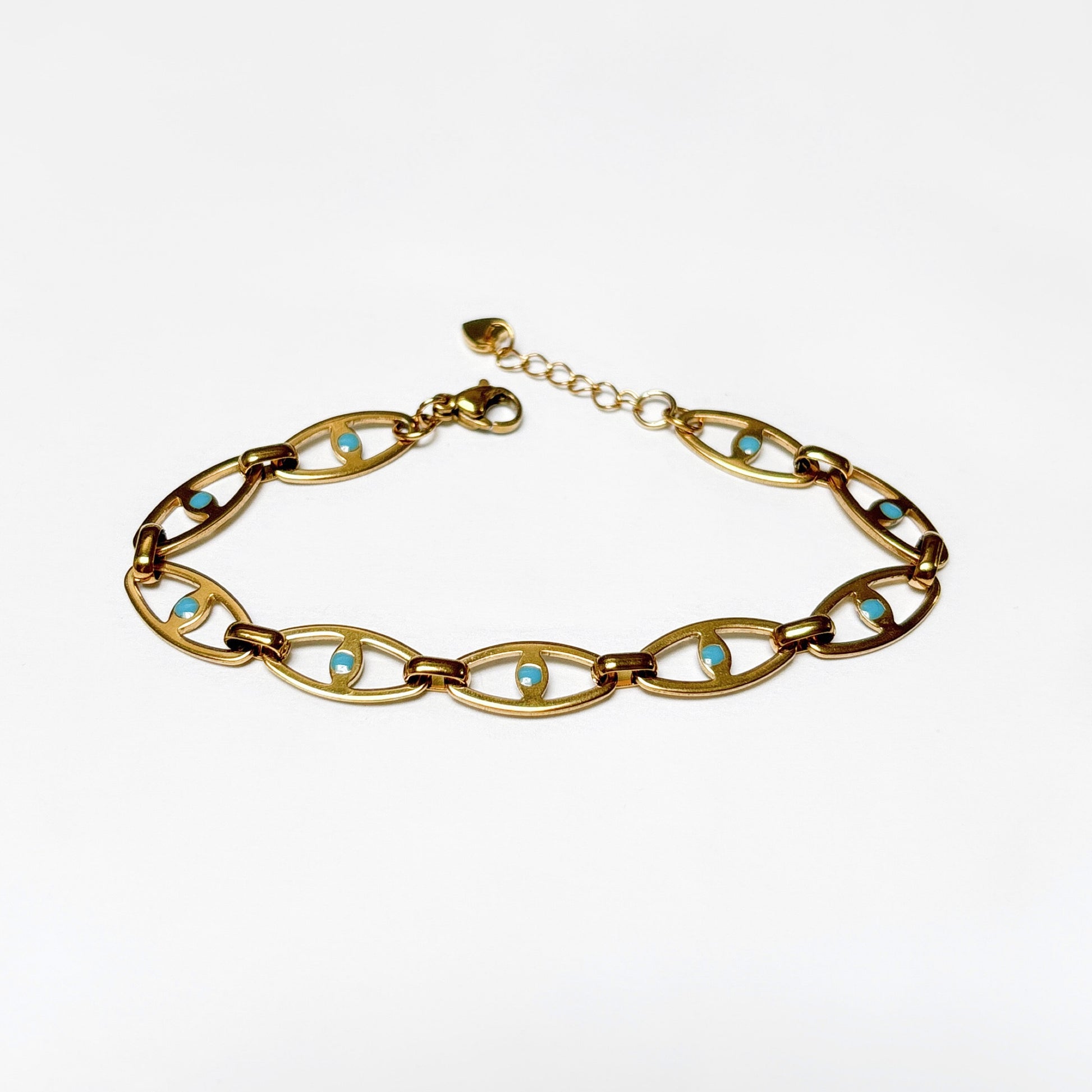 Ajoutez une touche de beauté grecque à votre style avec nos BRACELETS IKARIA. Cette collection comprend un superbe bracelet en perles cubiques turquoise, un bracelet triple chaîne en acier inoxydable plaqué or accrocheur et une chaîne unique en forme d'œil avec émail turquoise. Avec une touche d'ambiance grecque, ces bracelets rehausseront n'importe quelle tenue.