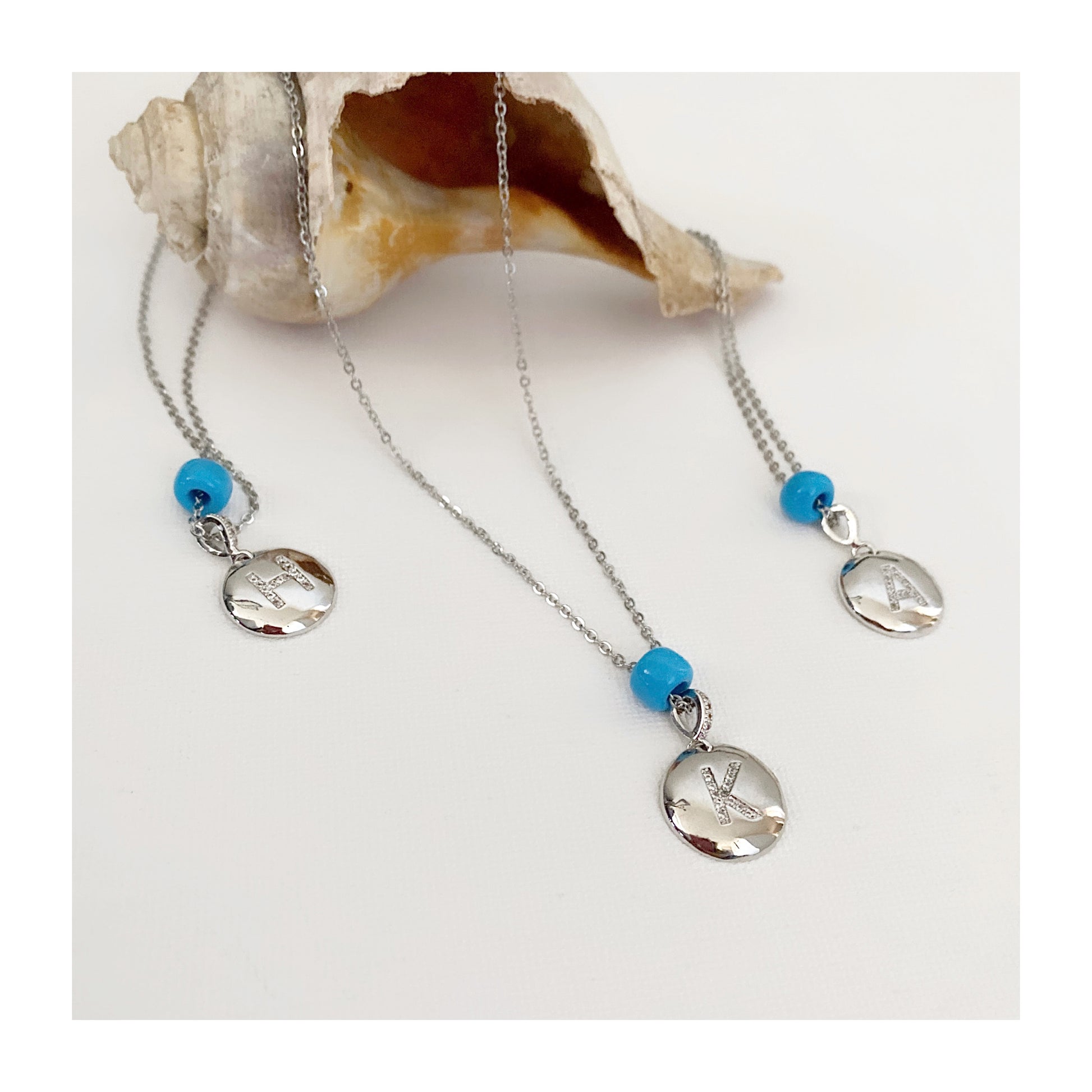 Jolis pendentifs initiales avec une petite perle bleue pour porter chance, un cadeau que toute fille apprécierait et adorerait. Un collier parfait à superposer avec d'autres colliers.