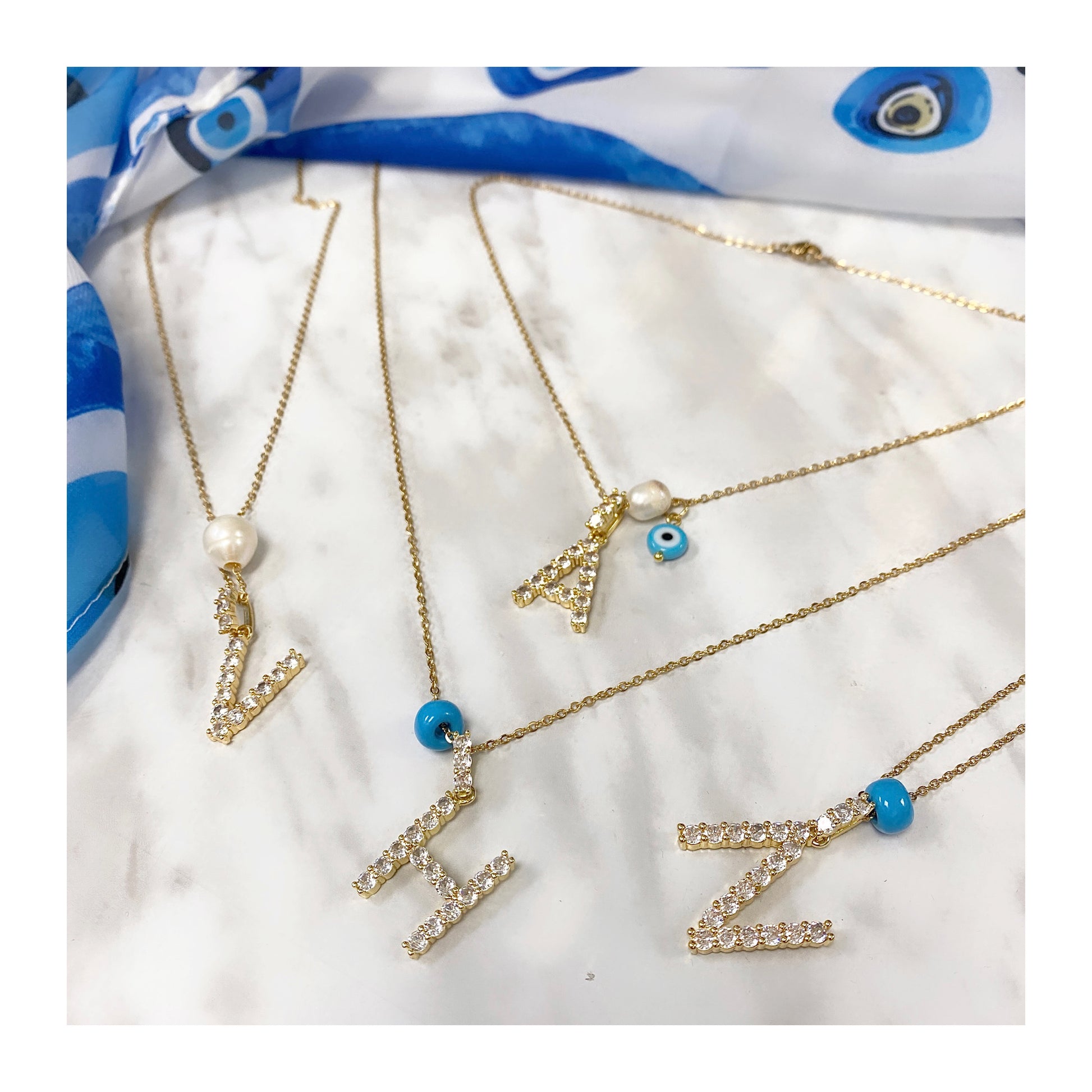 Jolis pendentifs initiales en zircone cubique avec une petite perle bleue pour la chance, une perle ou une perle et un œil, un cadeau que toute fille apprécierait et adorerait. Un collier parfait à superposer avec d'autres colliers.
