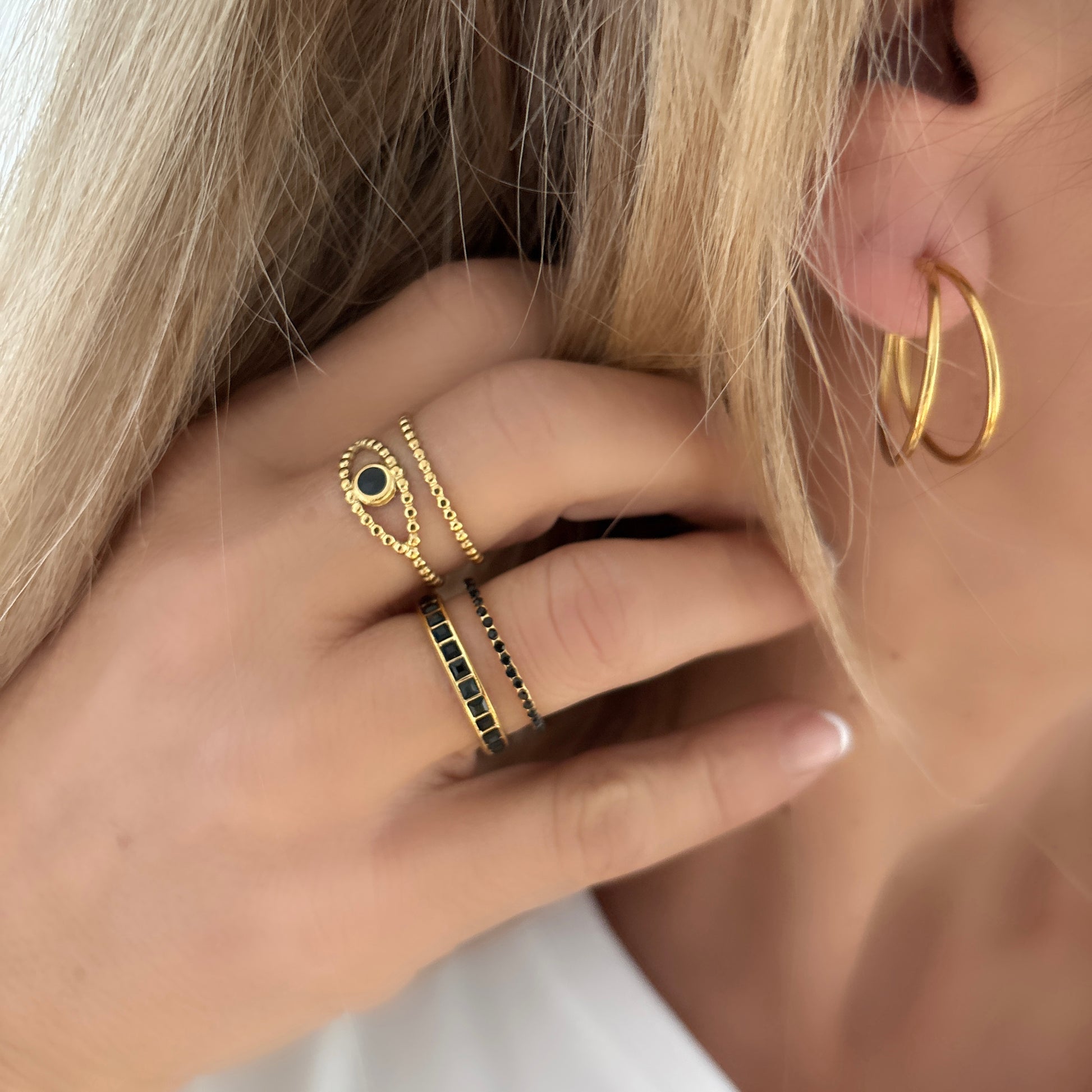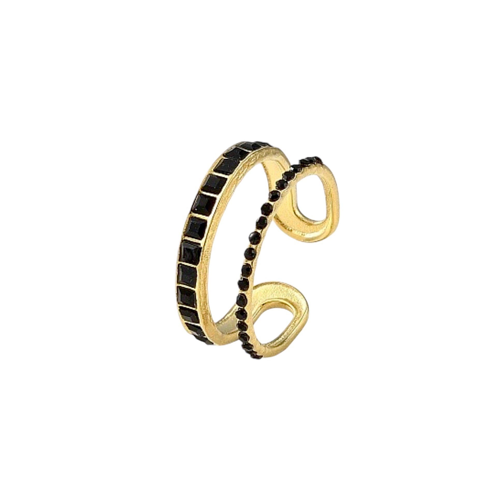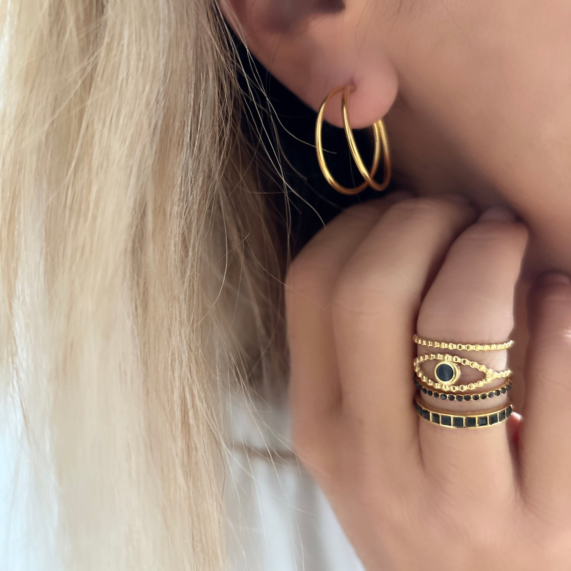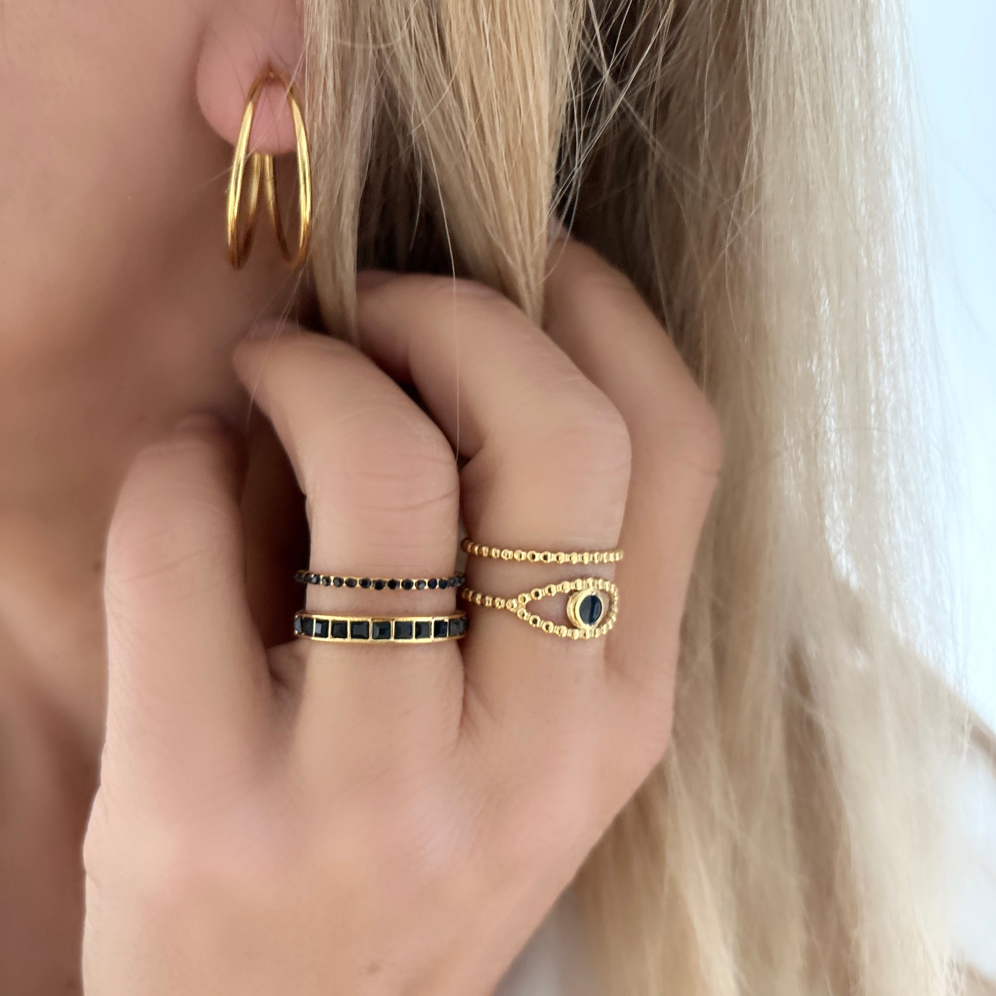 Rehaussez votre collection de bijoux avec les bagues IOLI. Ces bagues délicates à double bande présentent un design fascinant de mauvais œil, complété par de l'émail noir et des cristaux noirs étincelants. Faites une déclaration audacieuse et élégante avec ces superbes bagues.