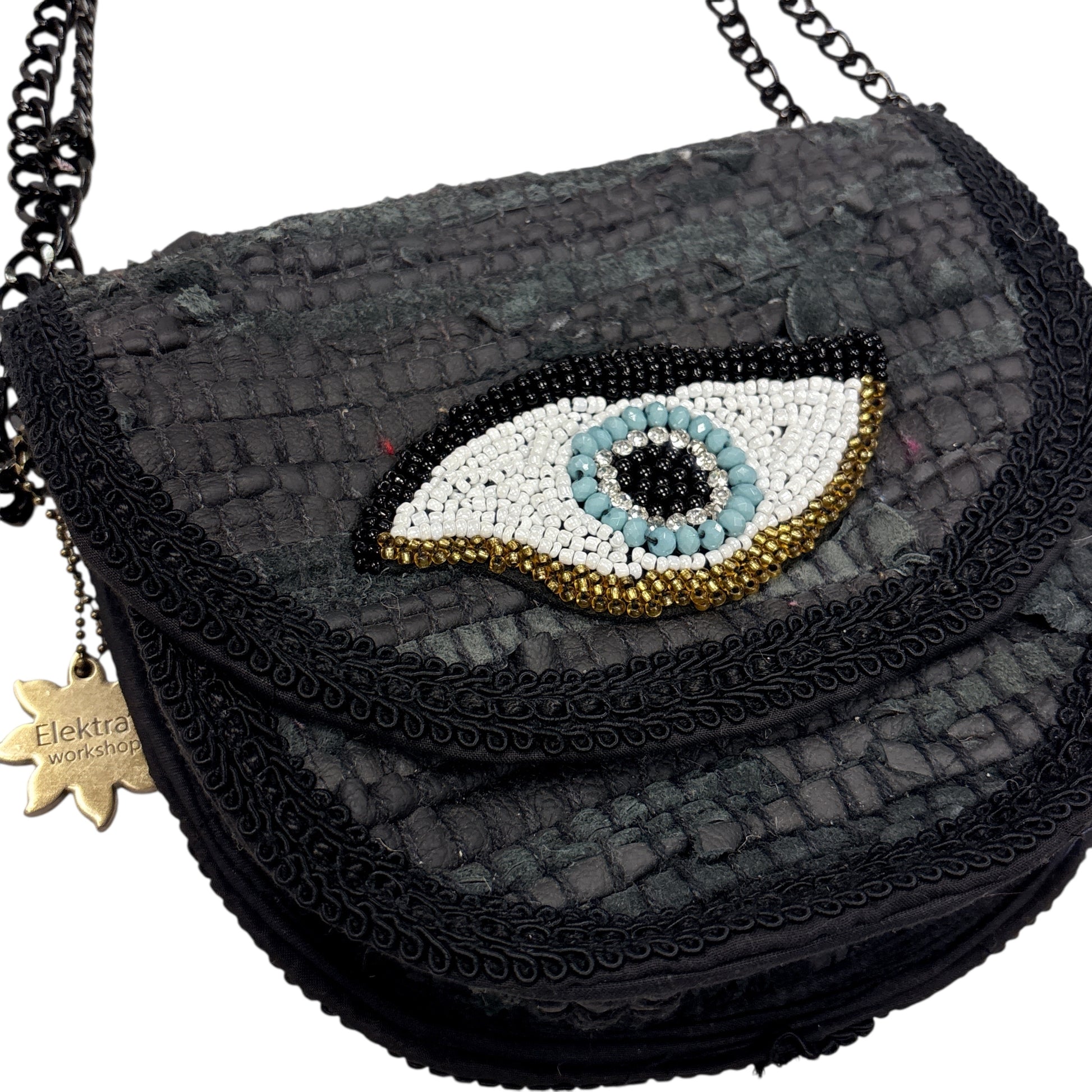 Emportez un morceau de la tradition grecque avec ce sac kourelou noir ludique, orné d'un motif perlé représentant un mauvais œil. Sa poignée chaîne polyvalente vous permet de le porter en bandoulière ou à la main. Idéal pour ajouter une touche culturelle et protéger vos aventures du quotidien !