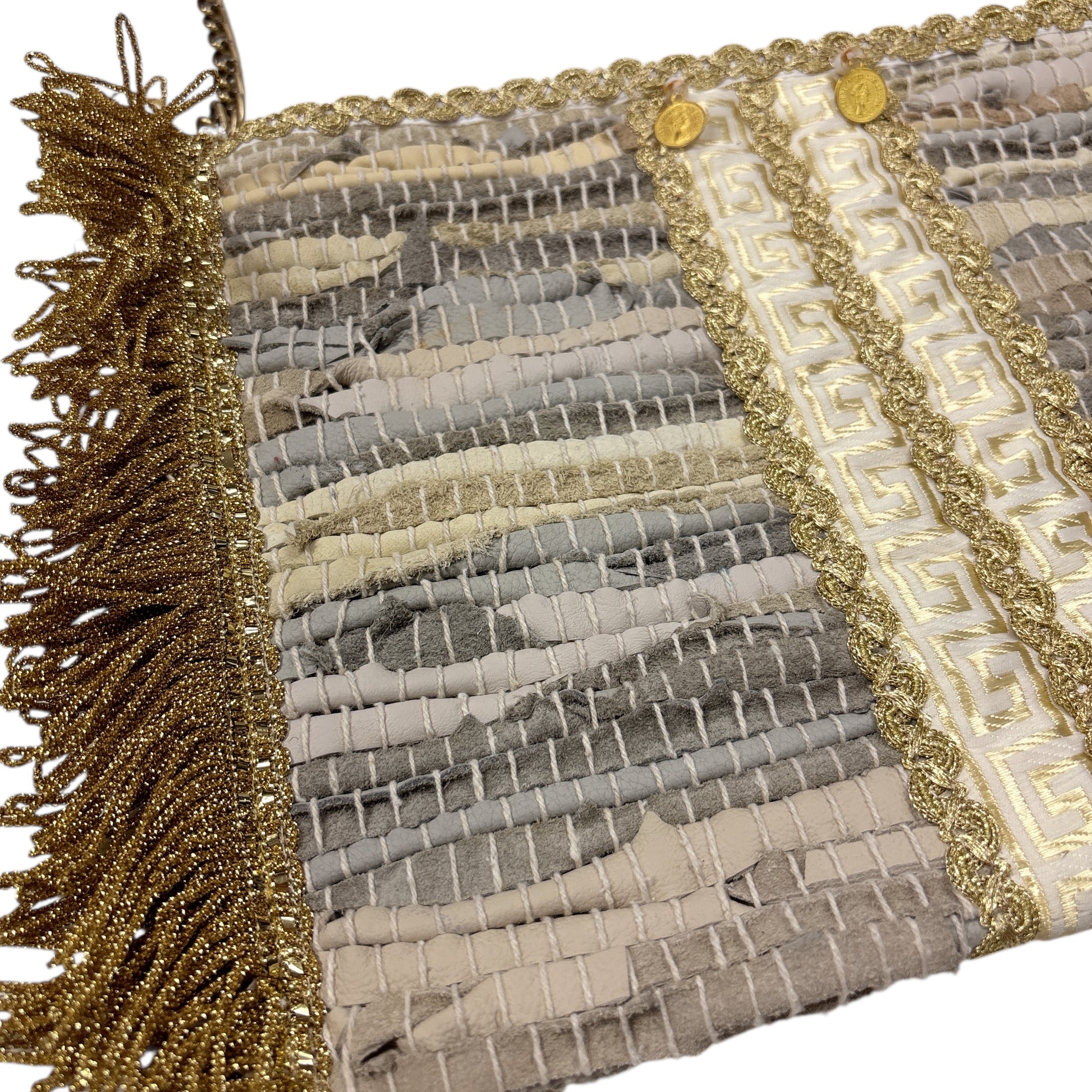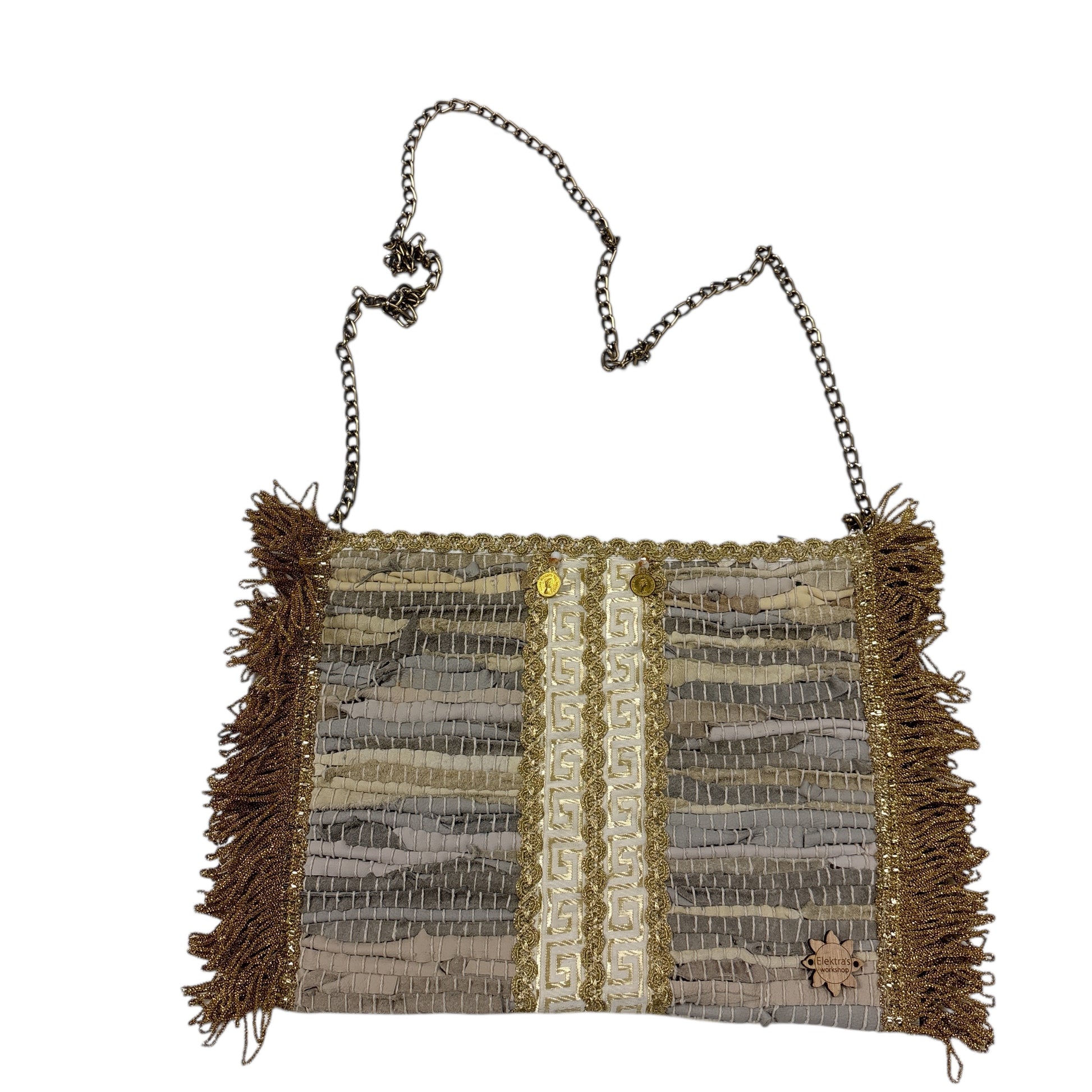 Entrez dans l'été avec notre éclatant SAC EN CUIR KOURELOU ! Cette merveille dorée arbore des franges ludiques qui dansent à chaque pas et une anse chaîne polyvalente pour un porté bandoulière. Parfait pour apporter une touche de soleil à vos journées à la plage ou vos aventures nocturnes, ce sac allie praticité et fun !