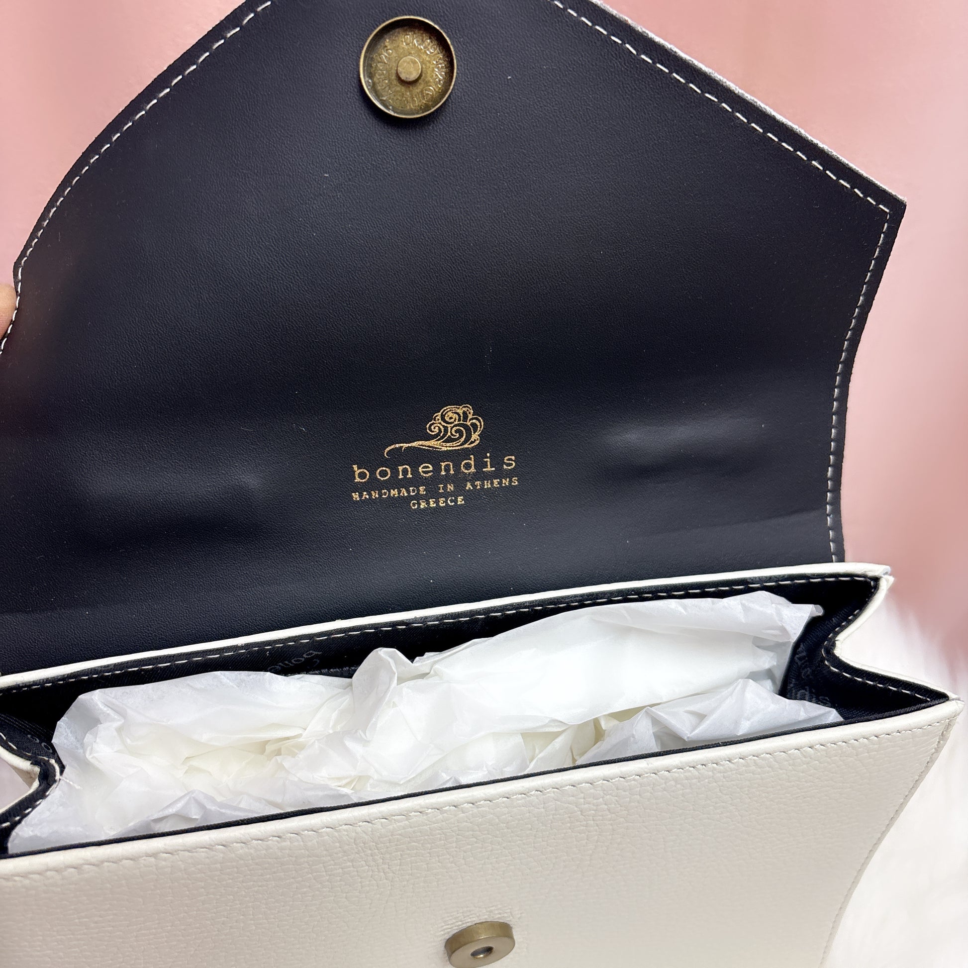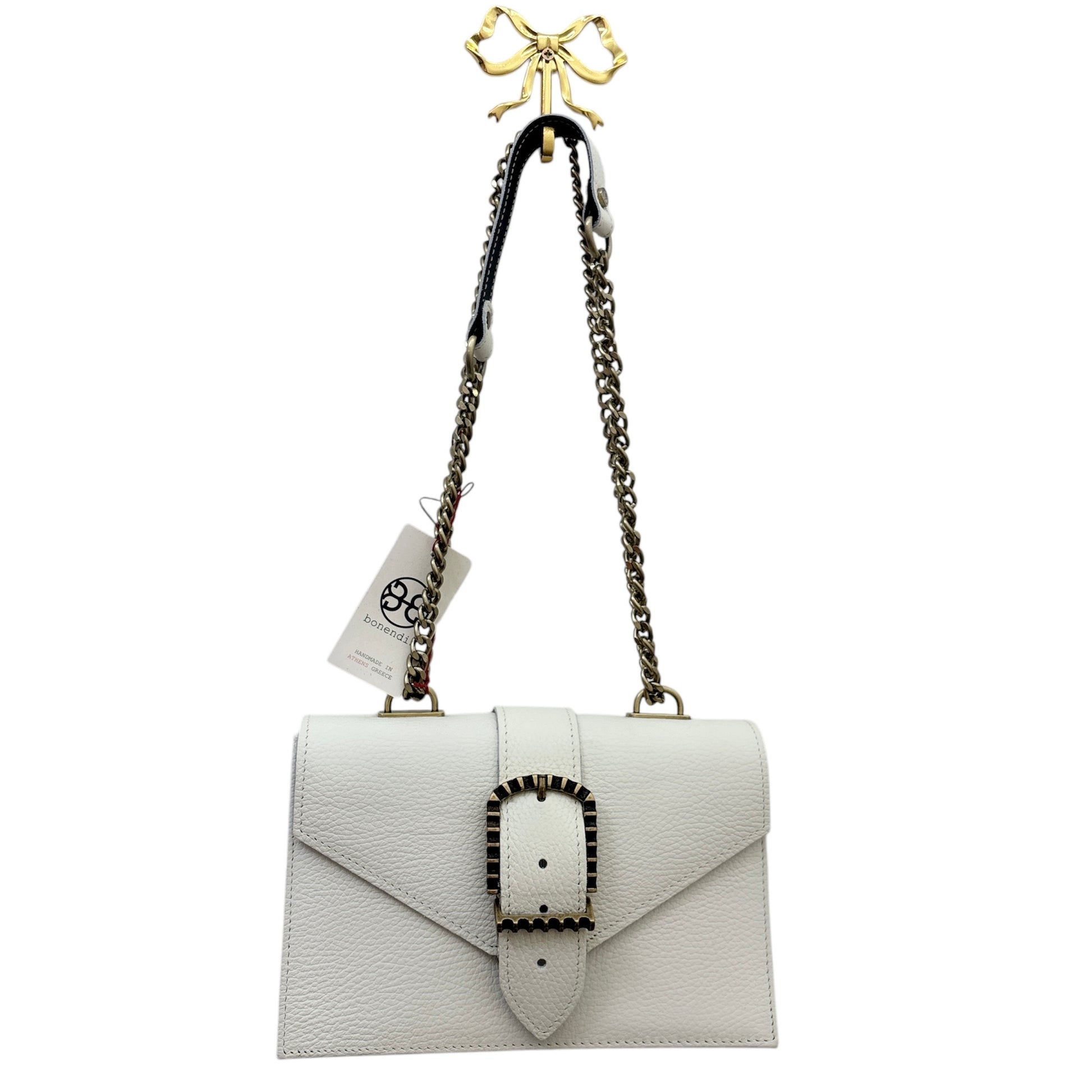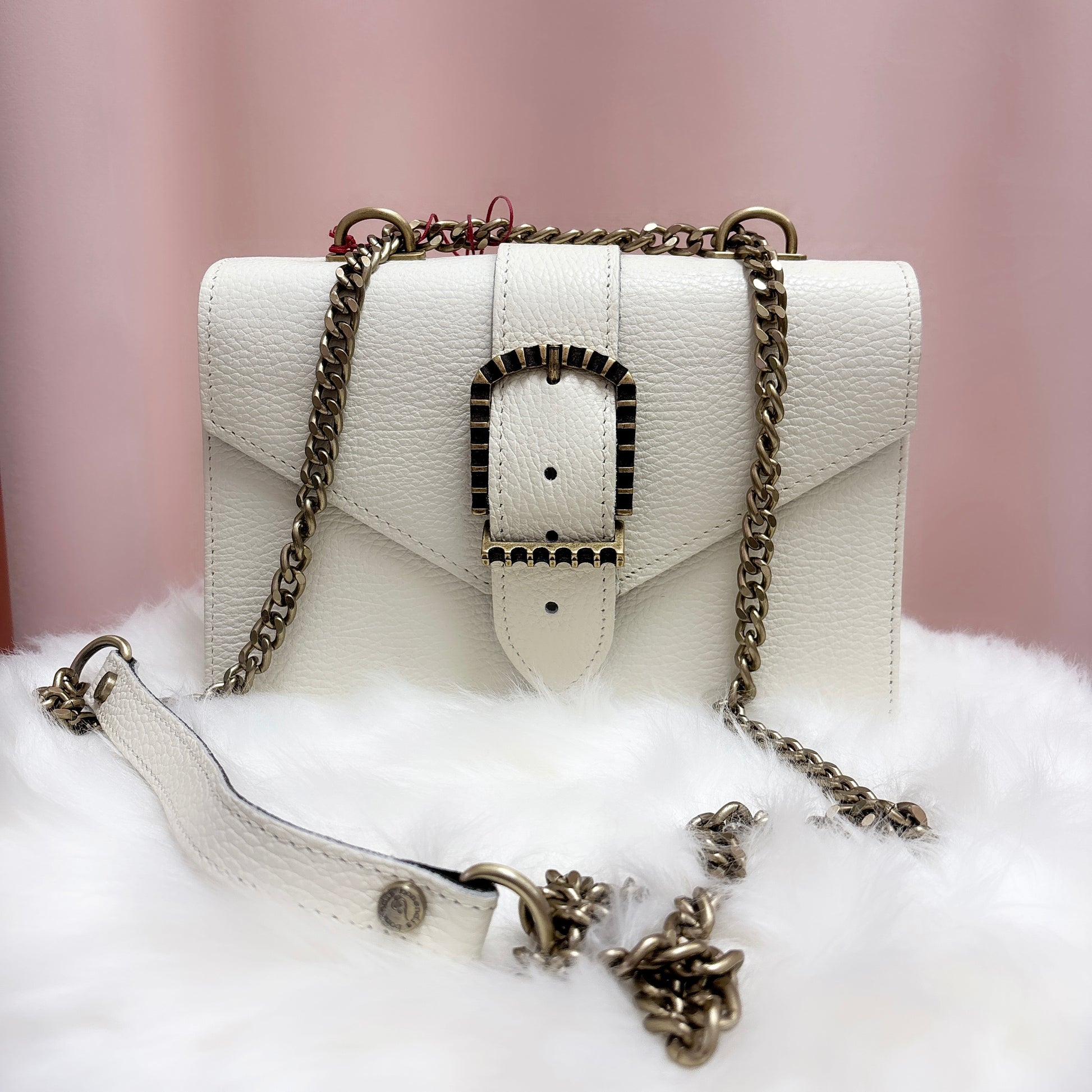 Sac en cuir blanc cassé avec rabat, boucle magnétique et superbe détail résistant. Longue chaîne double, comme illustré.
