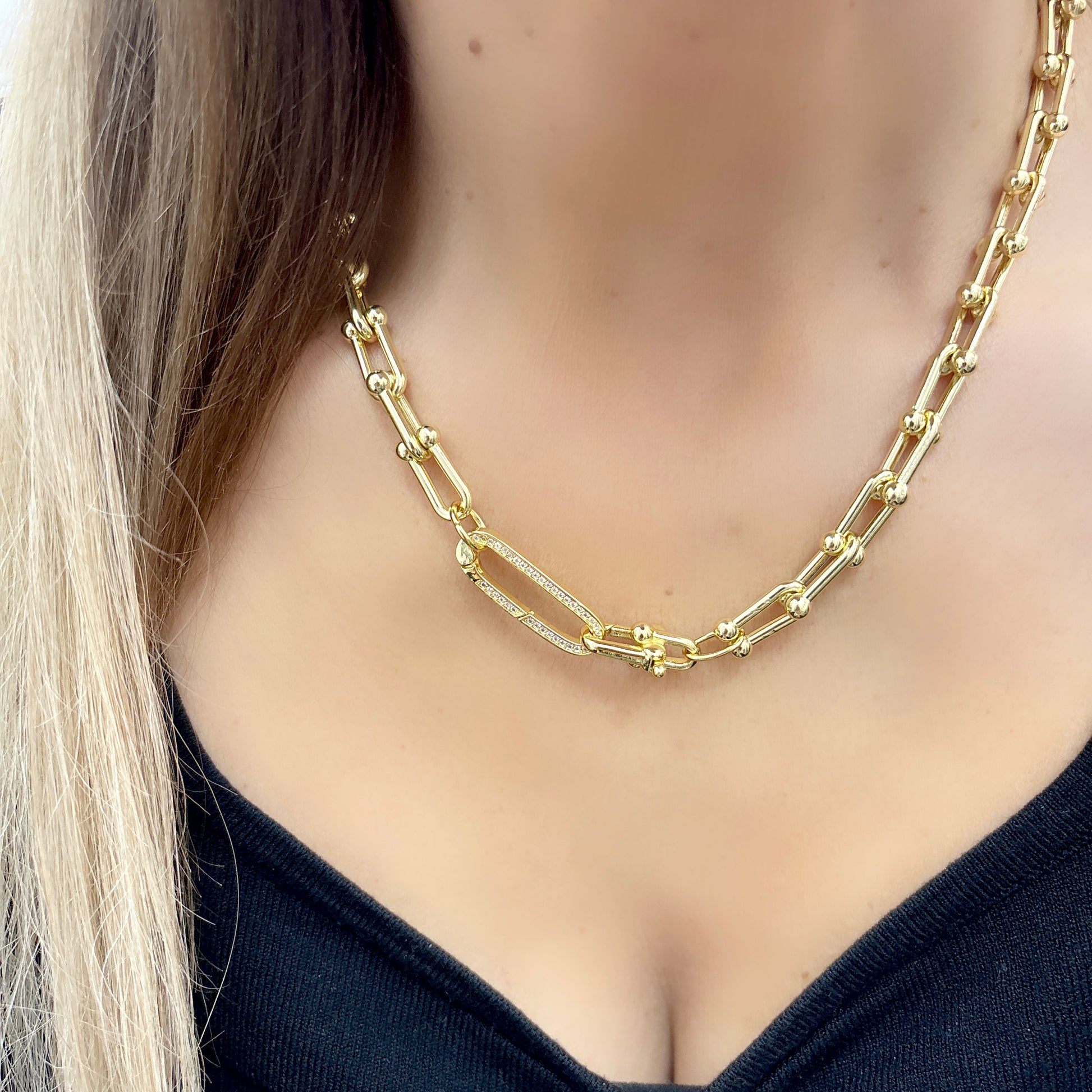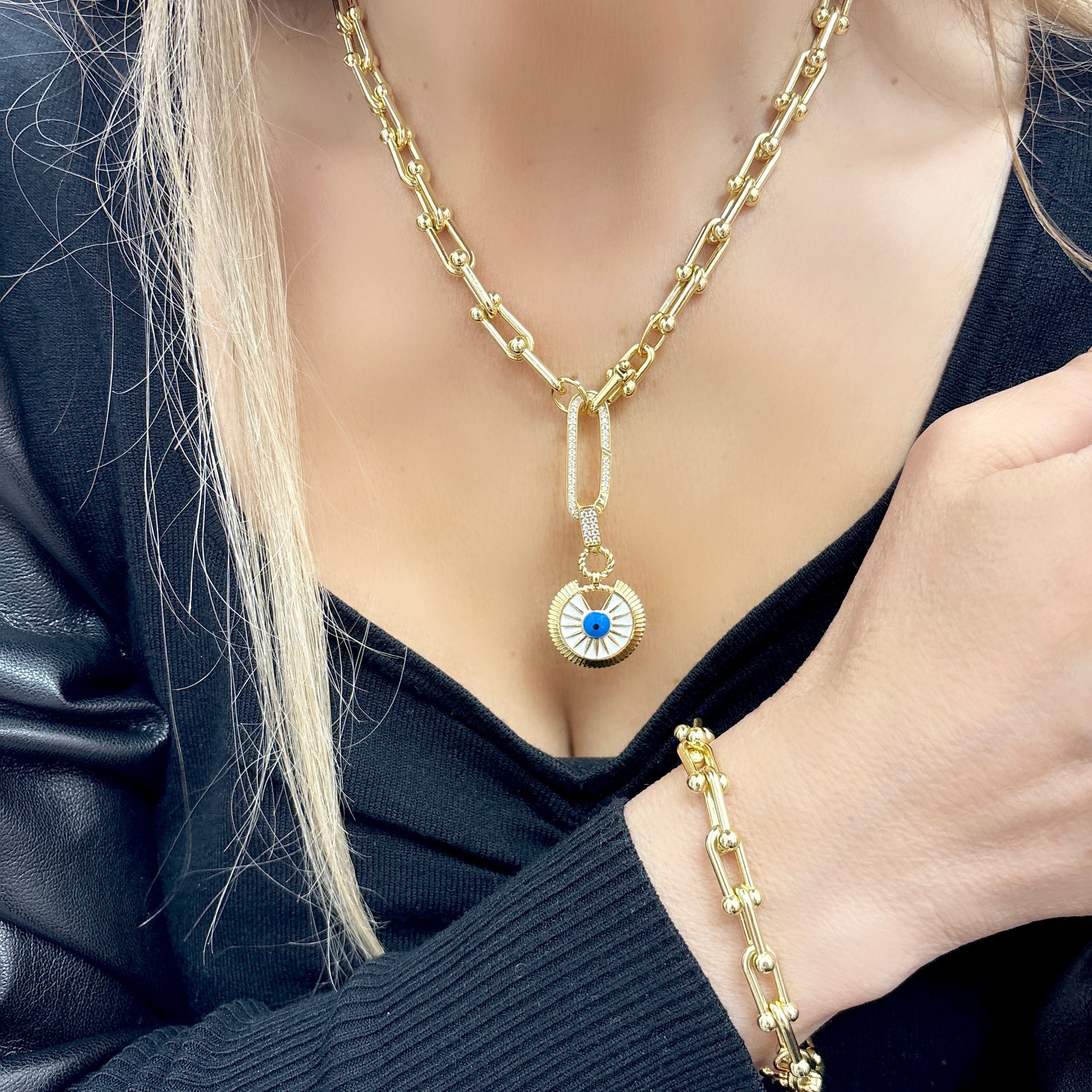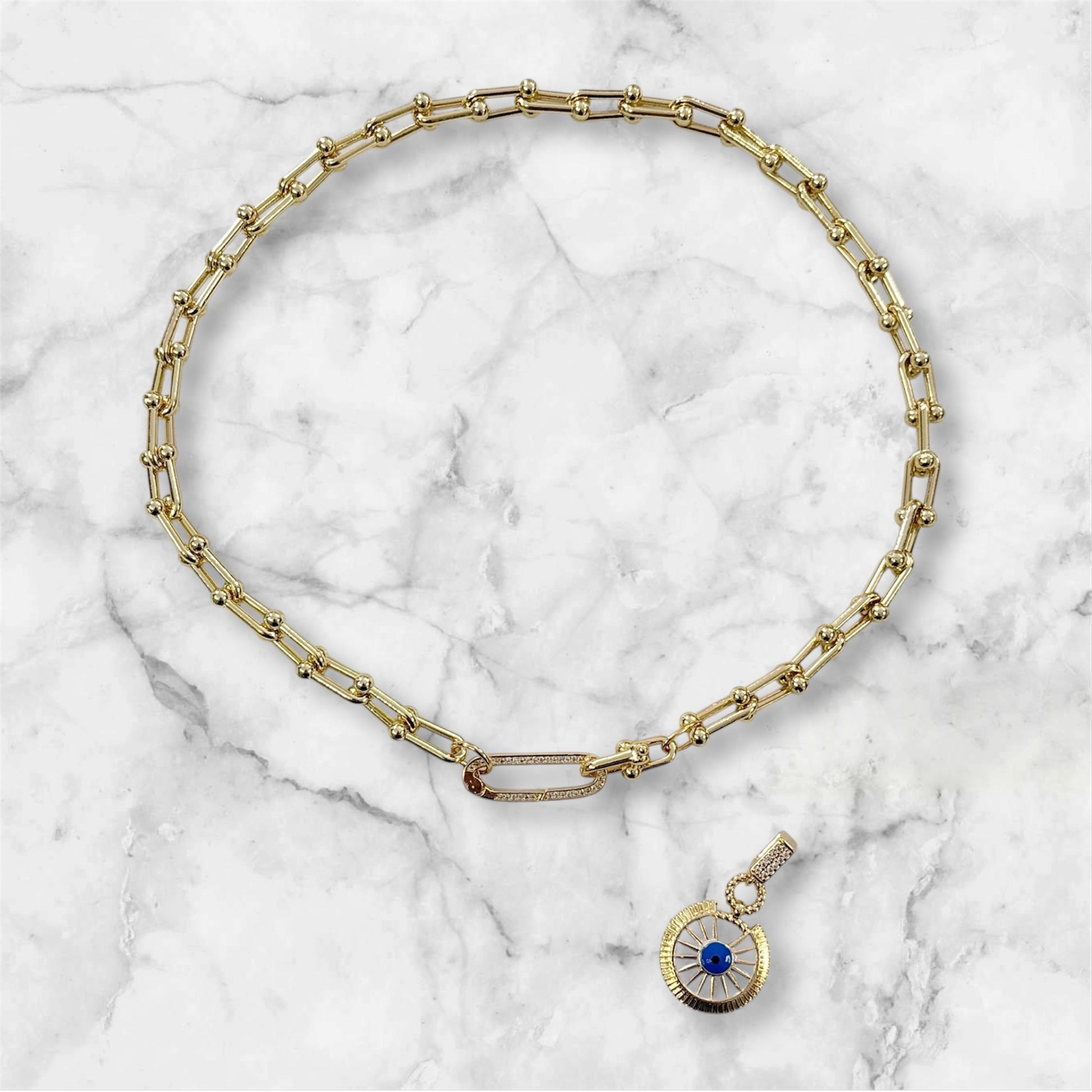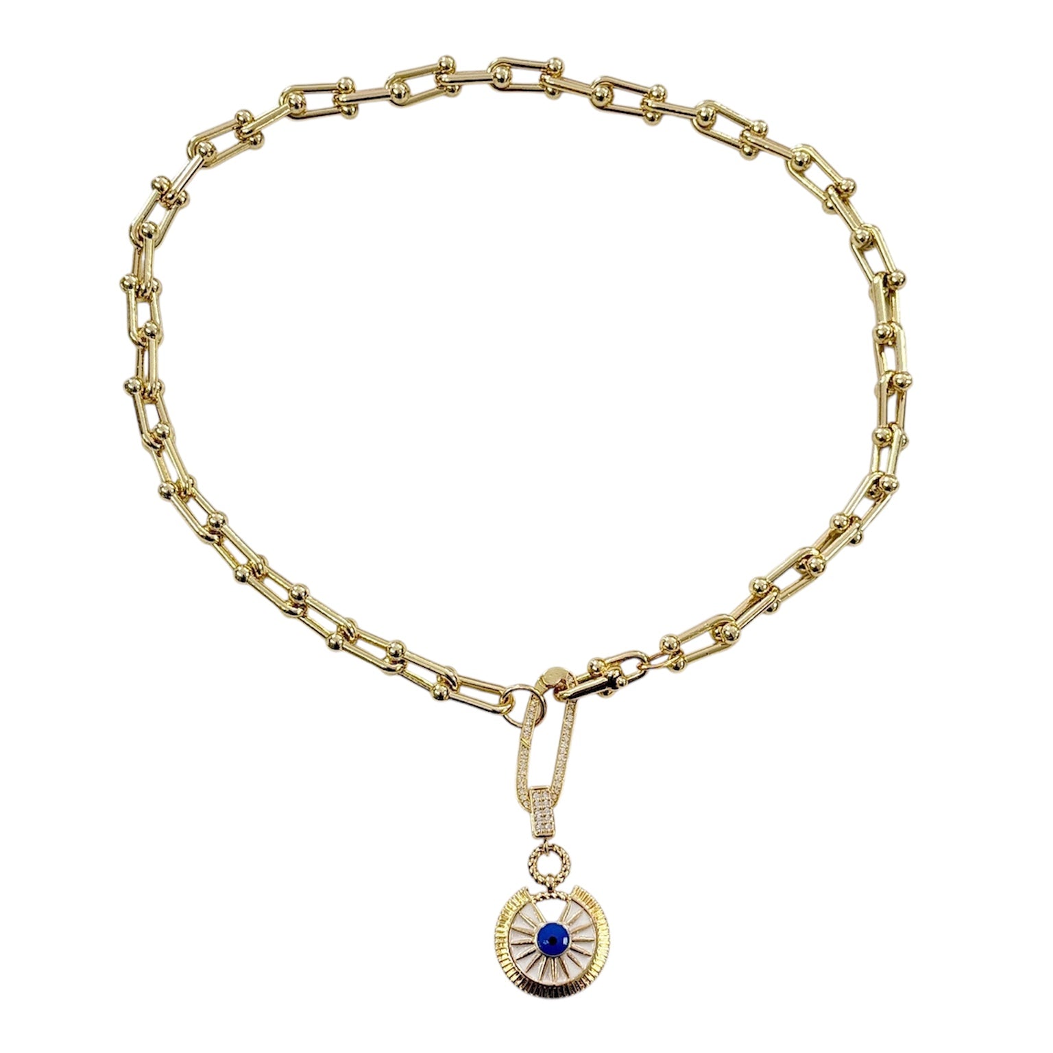 Sublimez votre style avec notre grand collier Tiff ! Fabriqué en laiton plaqué or avec deux fermoirs, il est orné d'oxydes de zirconium et d'un pendentif œil maléfique amovible pour un look polyvalent. Optez pour un style affirmé ou restez simple : dans tous les cas, vous serez sublime. Rehaussez votre tenue dès maintenant !