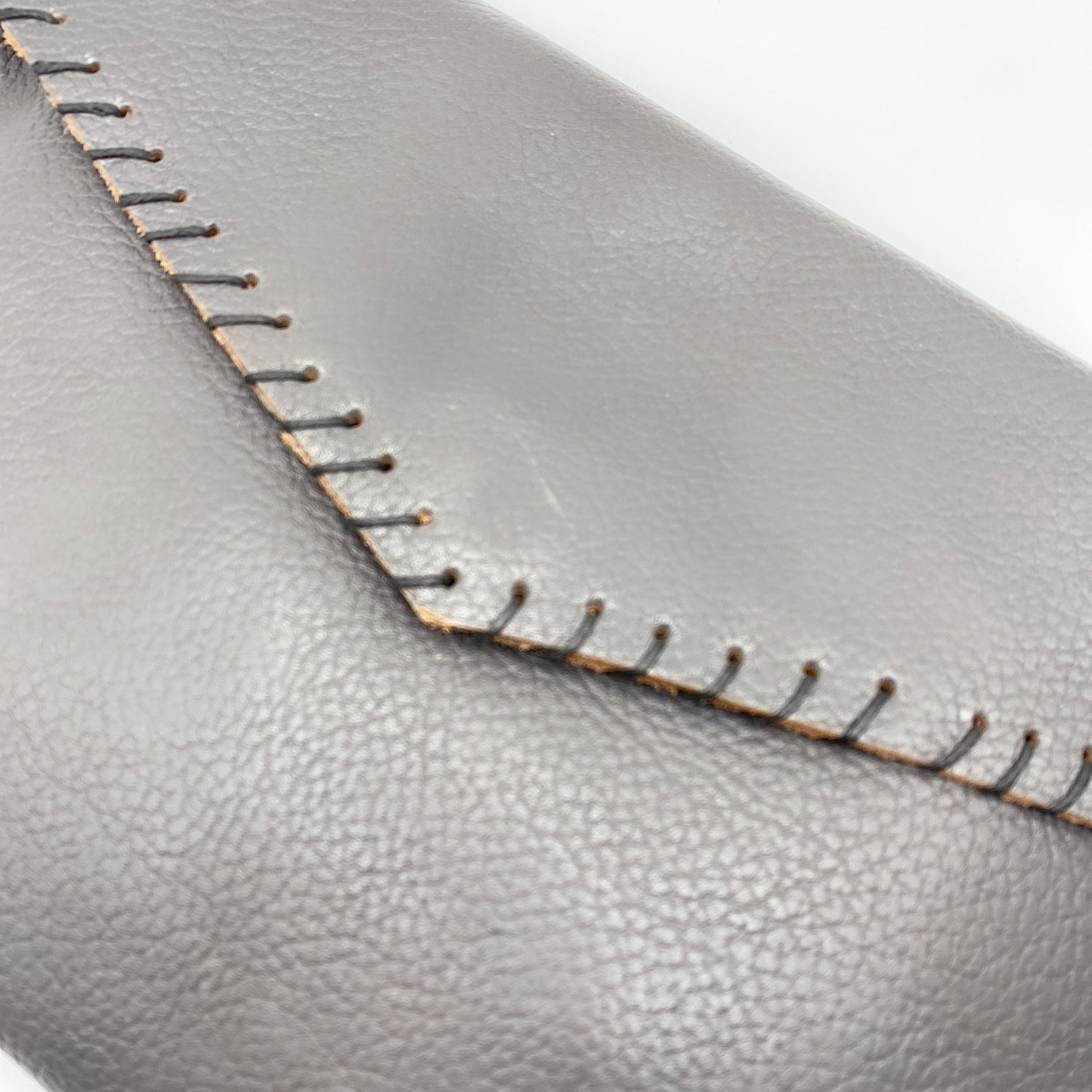 Une belle pochette en cuir gris avec des surpiqûres tout autour.