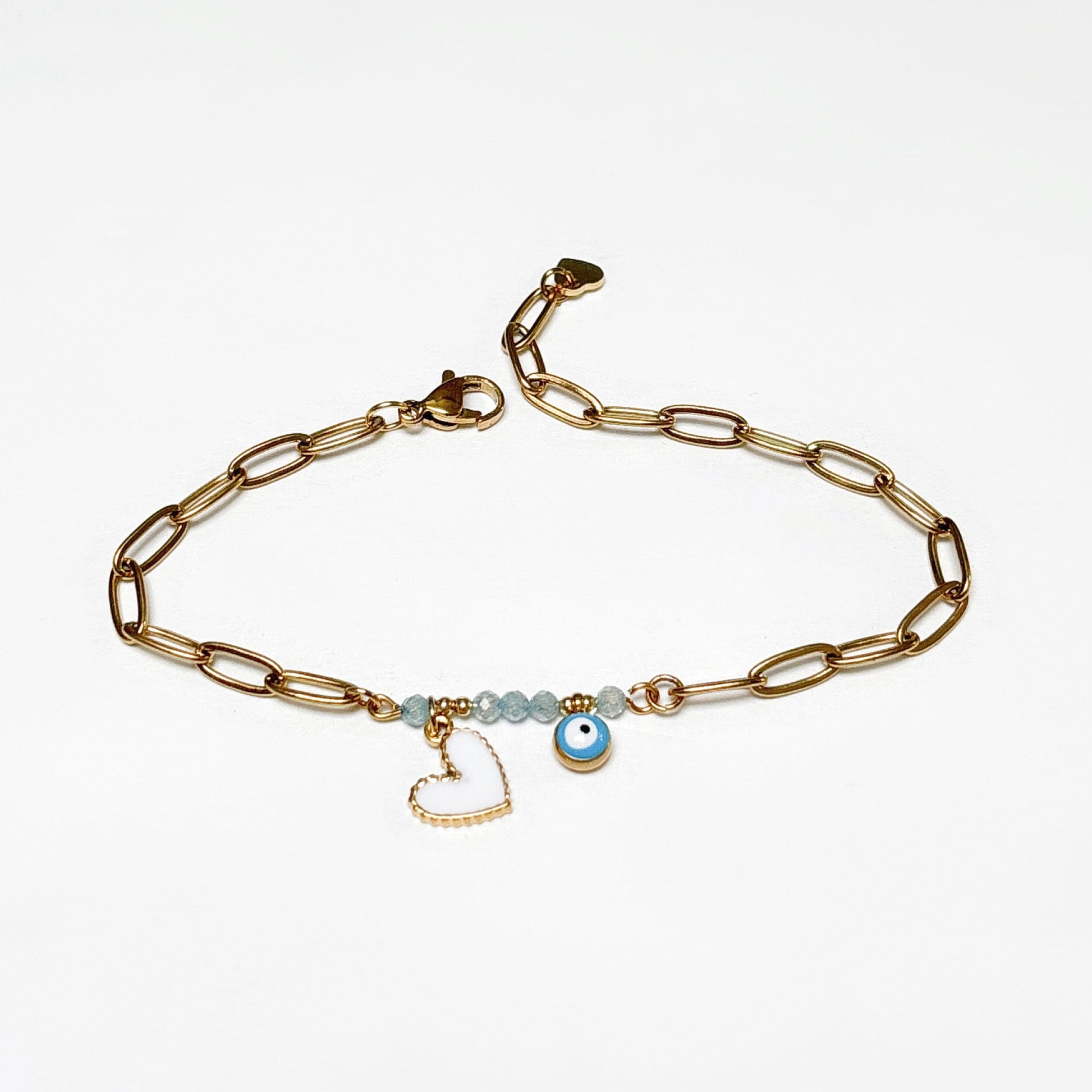 Rehaussez votre style avec les BRACELETS LILA. Ces jolis et délicats bracelets présentent des détails nacrés et des breloques en forme de cœur pour une touche délicate. Fabriqués en acier inoxydable de haute qualité et ornés de perles élégantes, ils sont le complément parfait à n'importe quelle tenue. De plus, la chaîne trombone ajoute une touche moderne tandis que le charme du mauvais œil apporte une protection supplémentaire. Améliorez votre gamme d'accessoires avec les BRACELETS LILA.