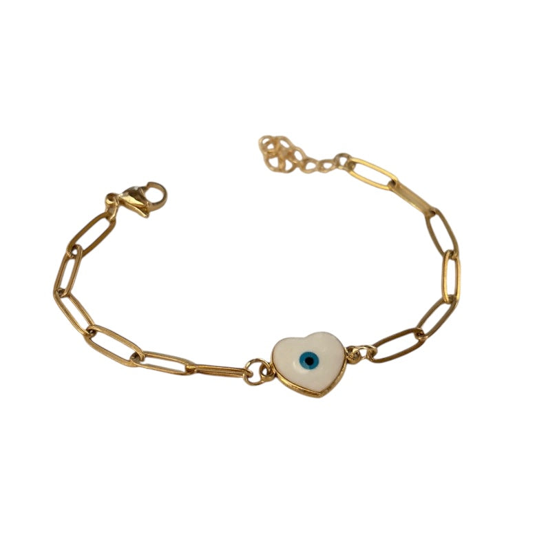 Adoptez l'élégance des BRACELETS LINDA. Cette luxueuse pile de bracelets est composée d'une combinaison de chaîne en perles et de chaîne trombone, ornée d'un cœur en émail et d'un mauvais œil. Fabriqué en acier inoxydable et plaqué or, il respire la sophistication et le charme. Rehaussez votre style avec les BRACELETS LINDA.