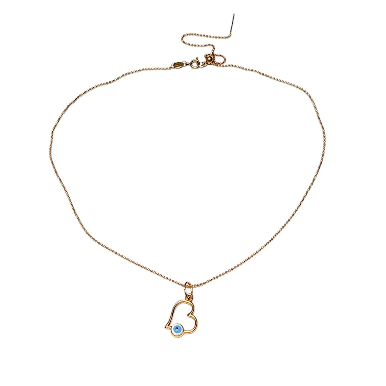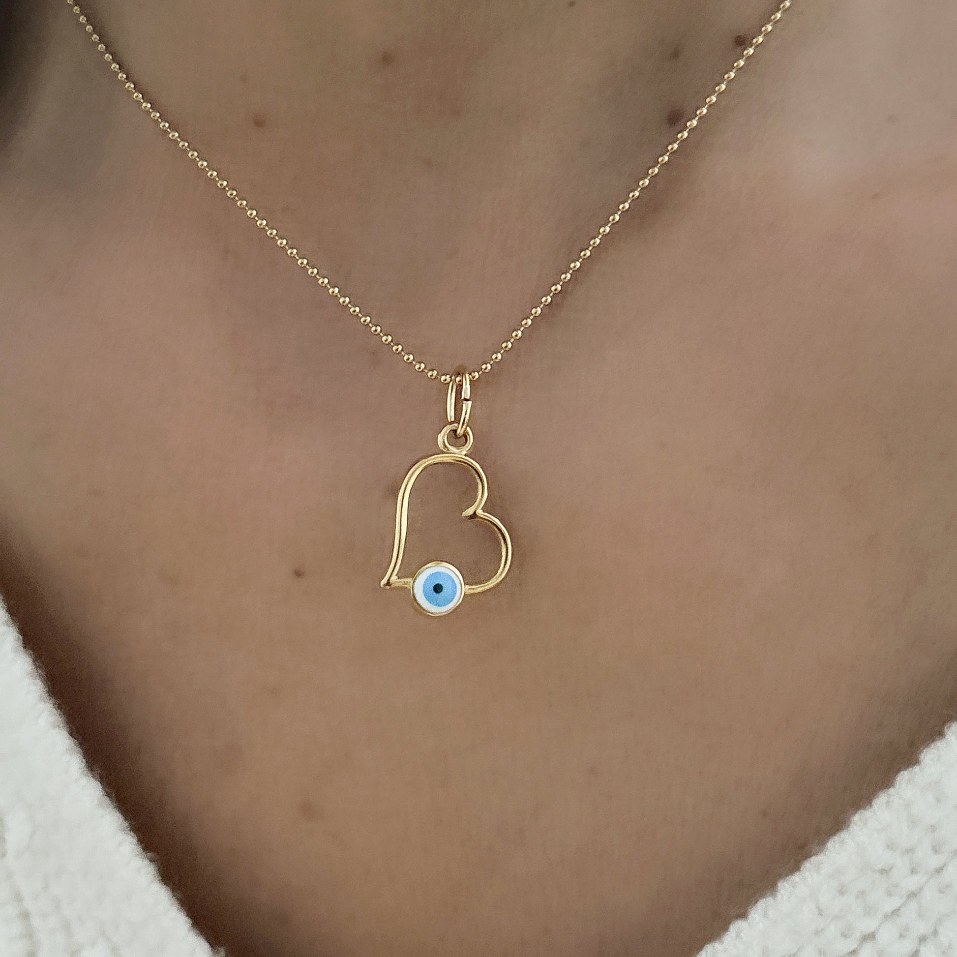Rehaussez votre style avec notre COLLIER BIA ! Fabriqué avec une chaîne à billes en acier inoxydable plaqué or, ce collier présente un superbe pendentif en forme de cœur avec un motif de mauvais œil. Adoptez l'énergie positive et démarquez-vous de la foule avec cet accessoire unique et accrocheur.