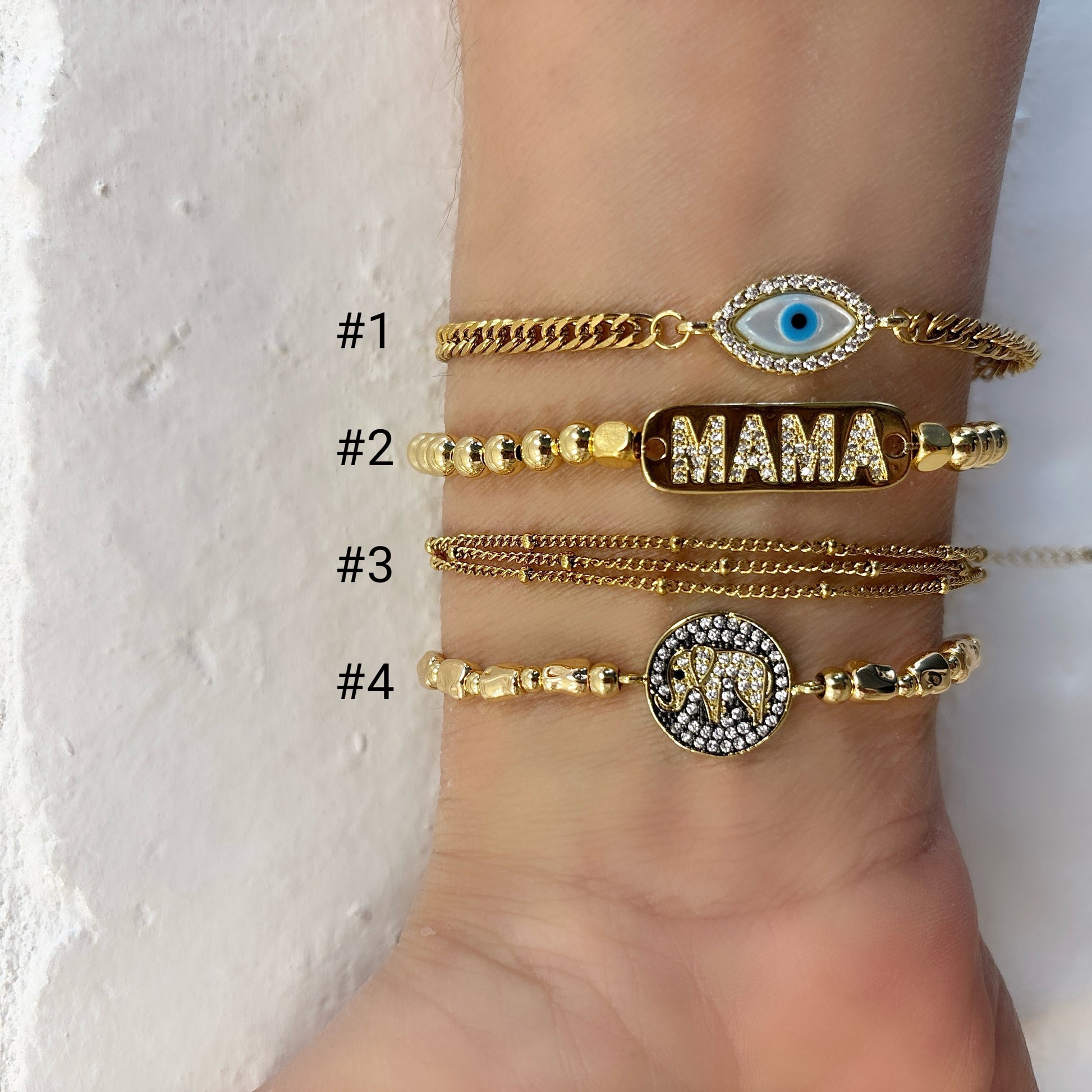 Portez chance avec nos bracelets MAMA-MIA ! Chaque pièce charmante, qu'il s'agisse du bracelet protecteur contre le mauvais œil, du bracelet maman plein de tendresse ou de notre breloque éléphant porte-bonheur, ajoute une touche de fantaisie à votre poignet. Vendus à l'unité, ils sont conçus pour créer un look irrésistiblement amusant et polyvalent, unique et unique. Mélangez, assortissez et laissez libre cours à votre magie !