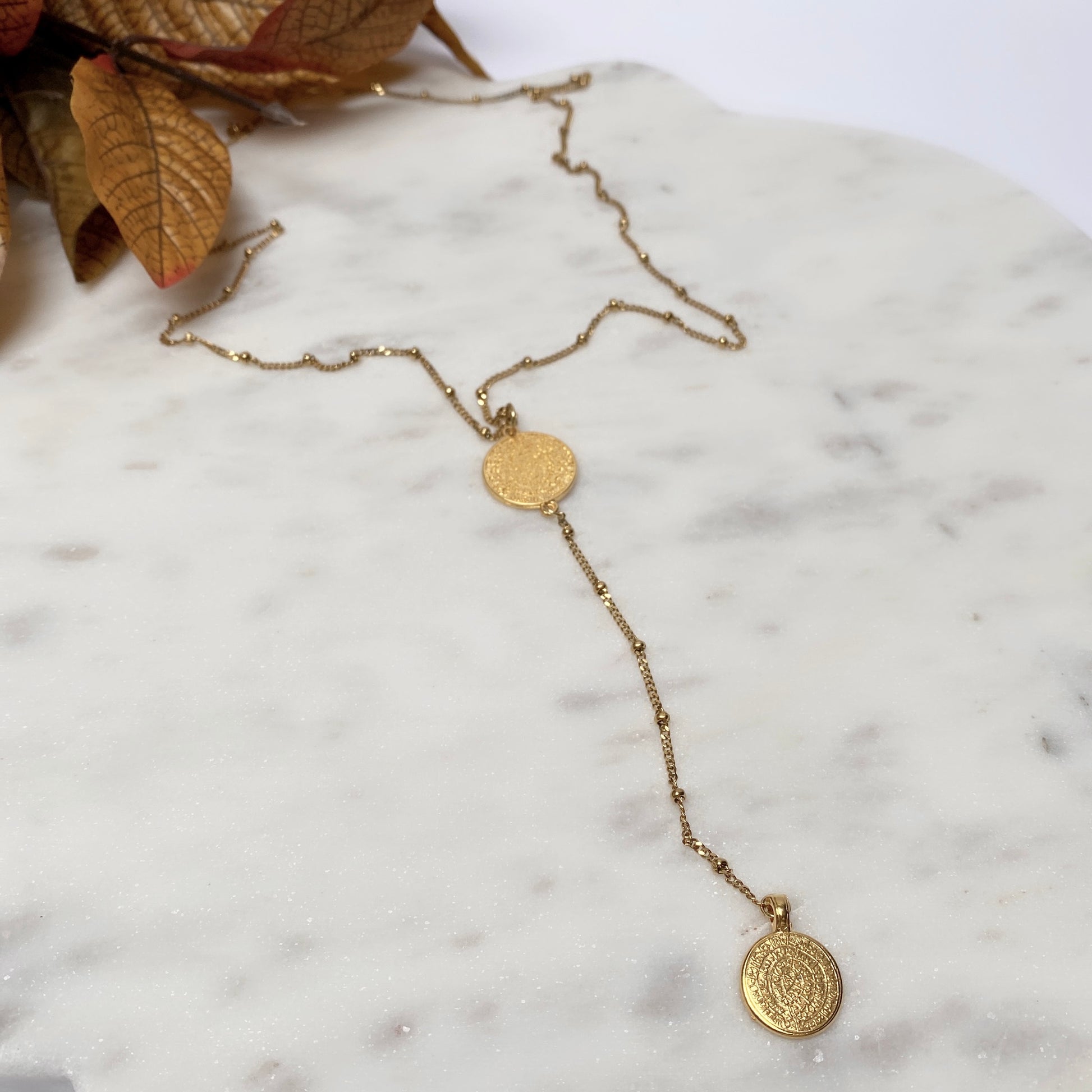 #1 Chaîne à billes en acier inoxydable plaqué or avec 2 décorations de pièces de monnaie mesurant 26 pouces avec une chute de 3,5 pouces
