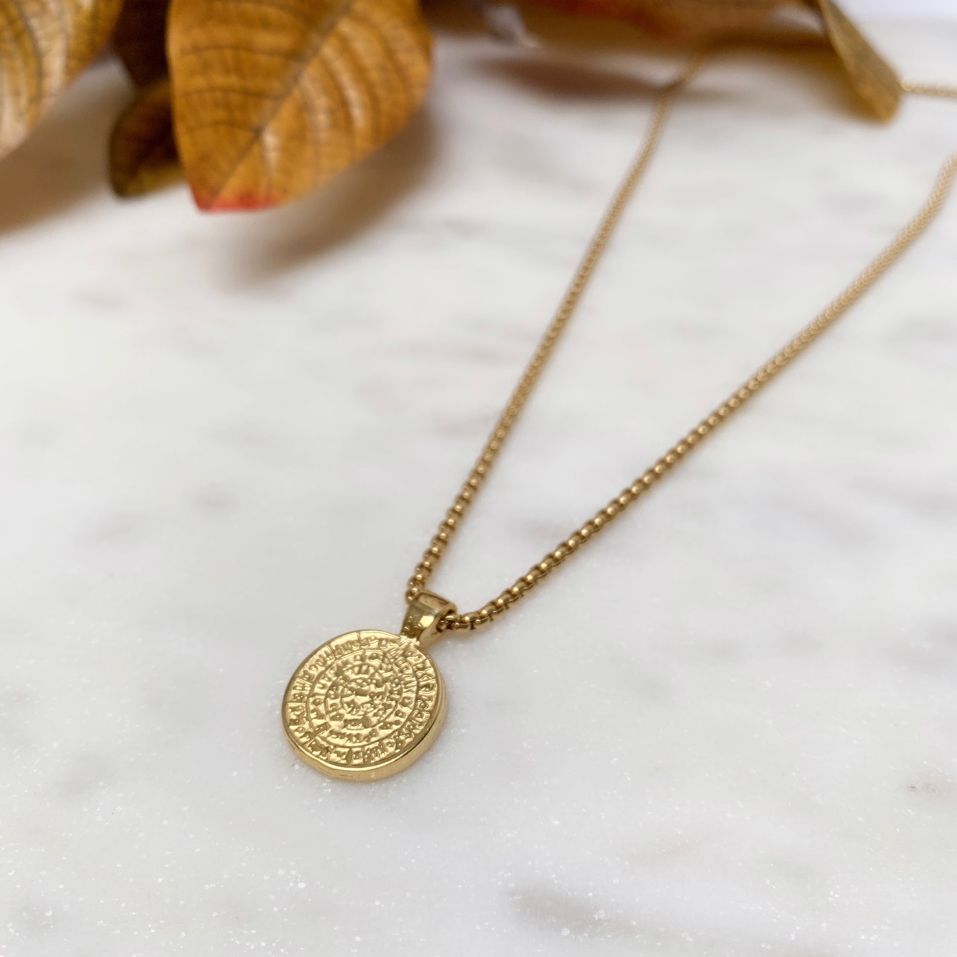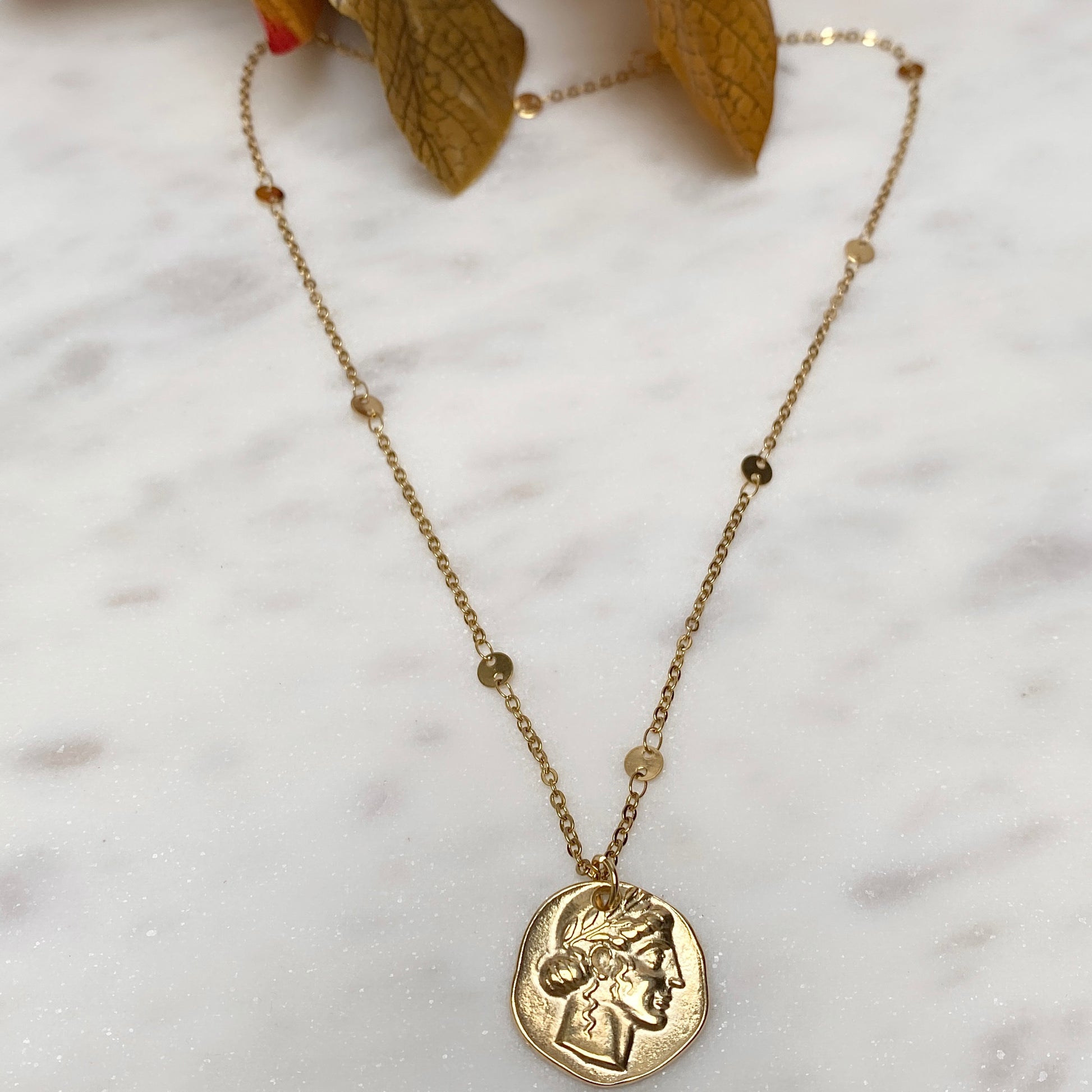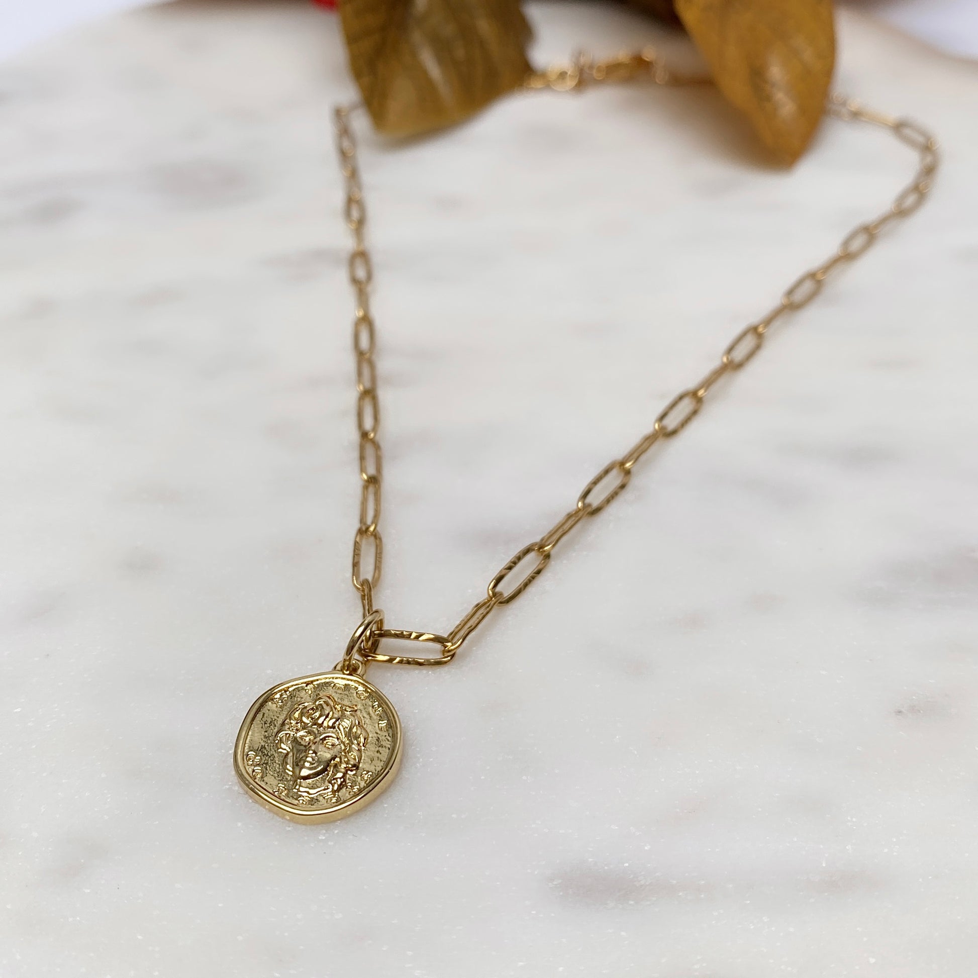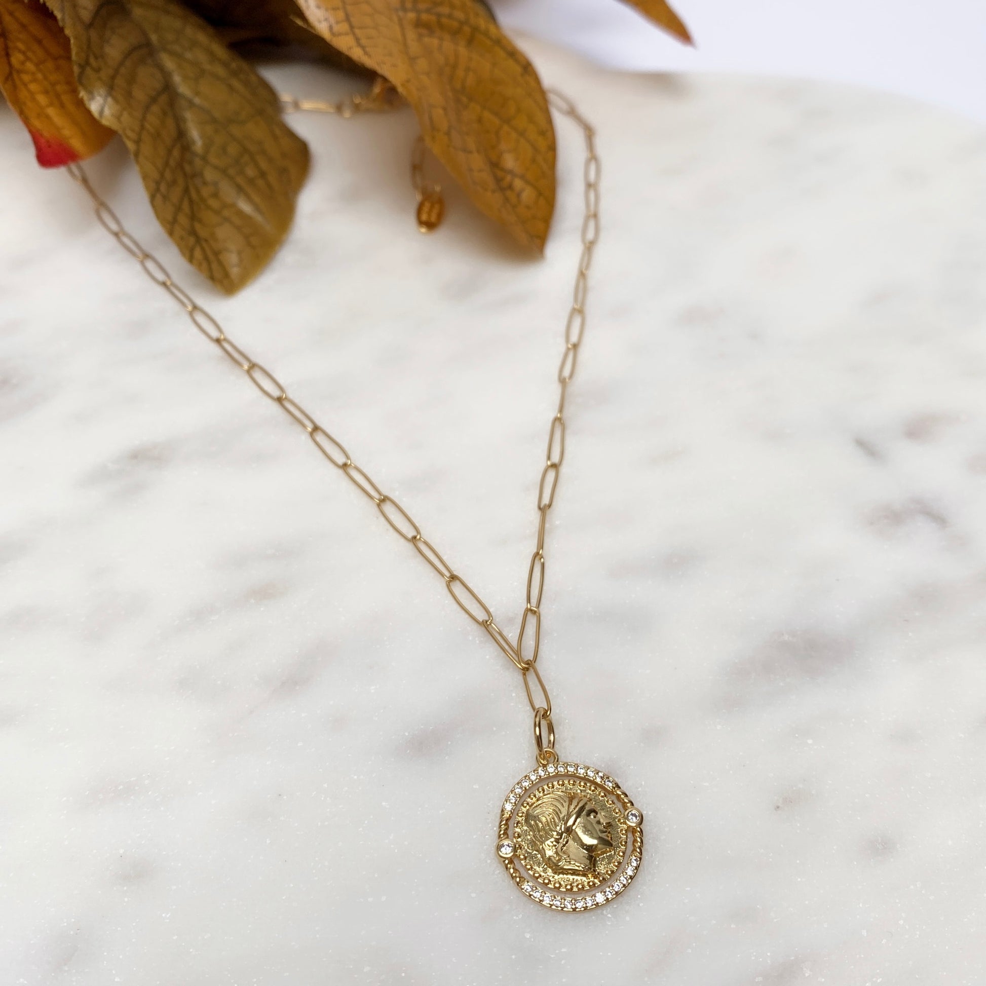 #5 Chaîne en acier inoxydable plaqué or avec pendentif pièce de monnaie mesurant 15 pouces