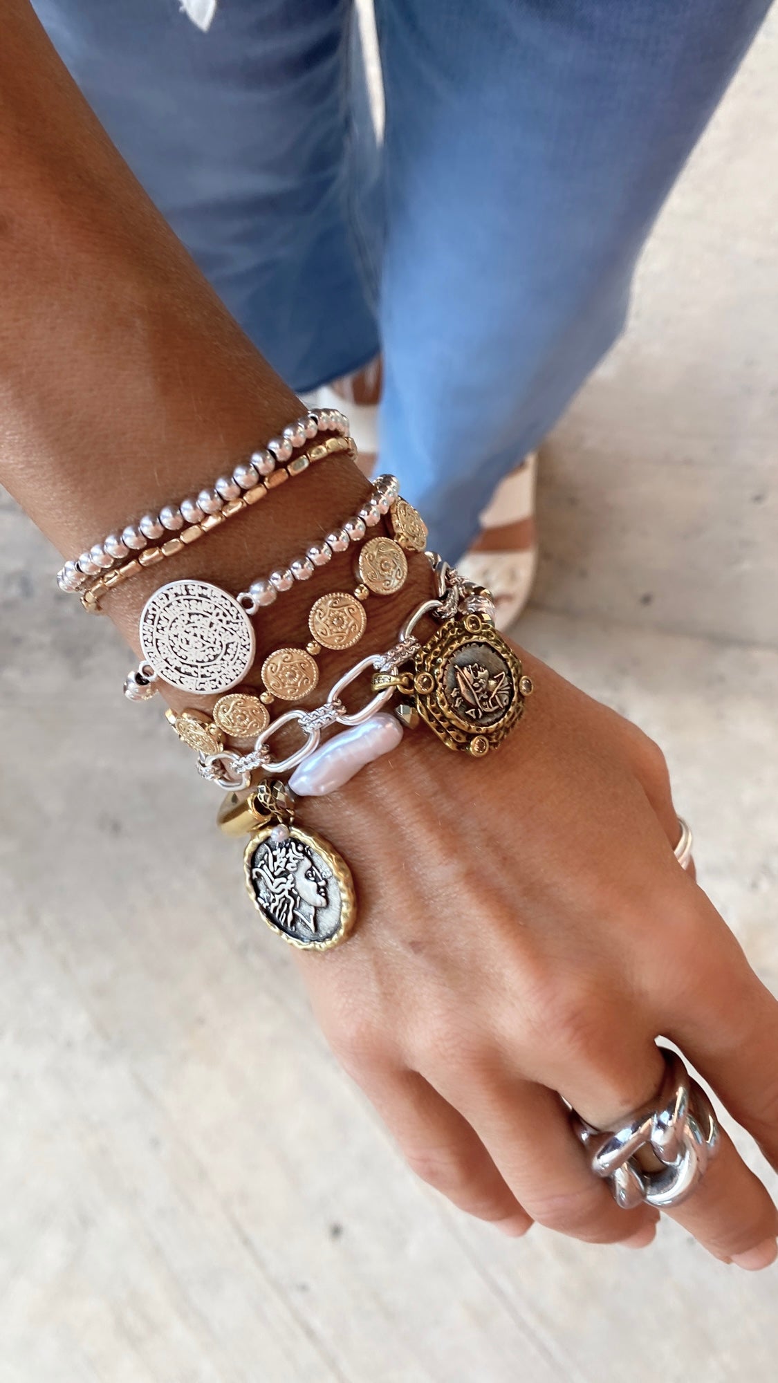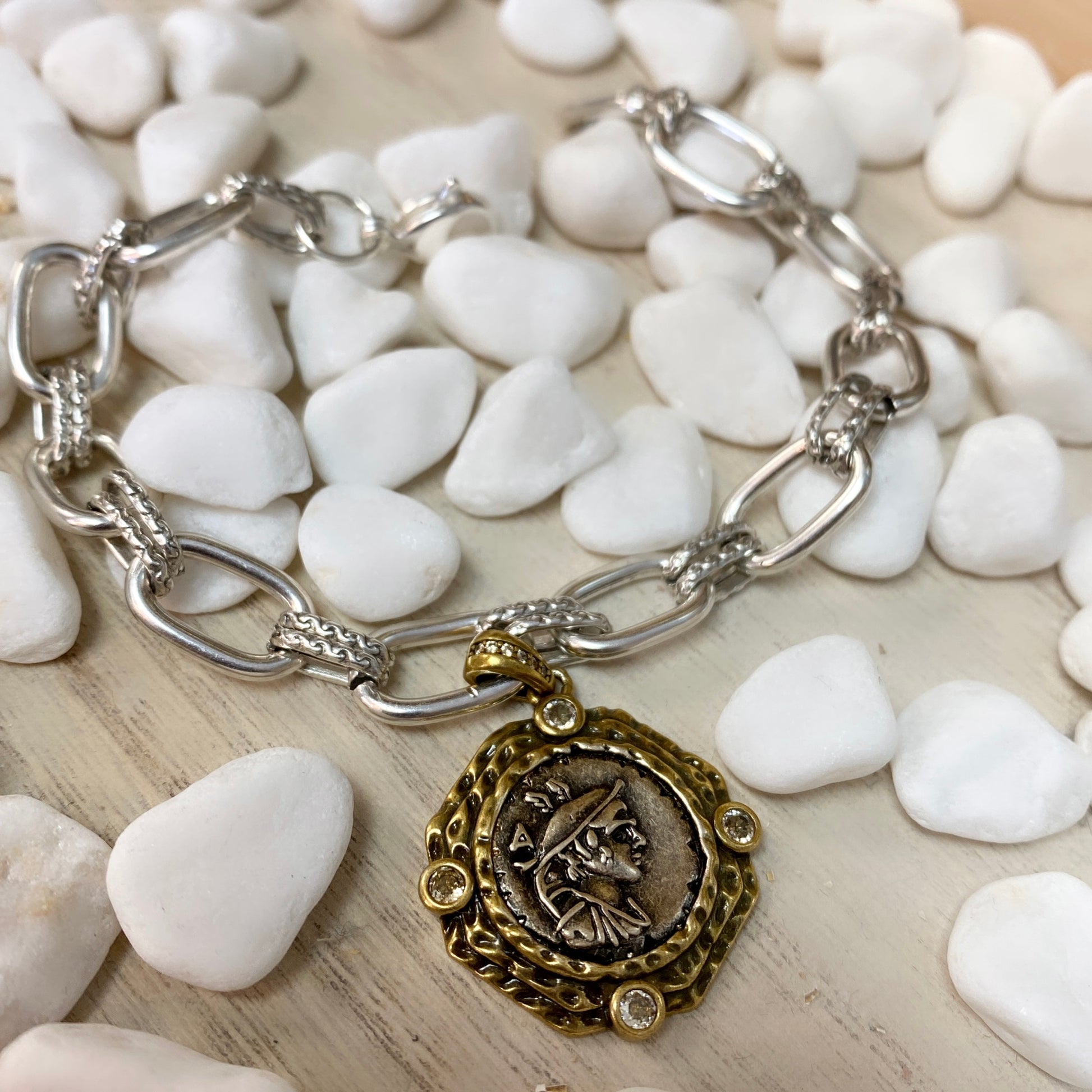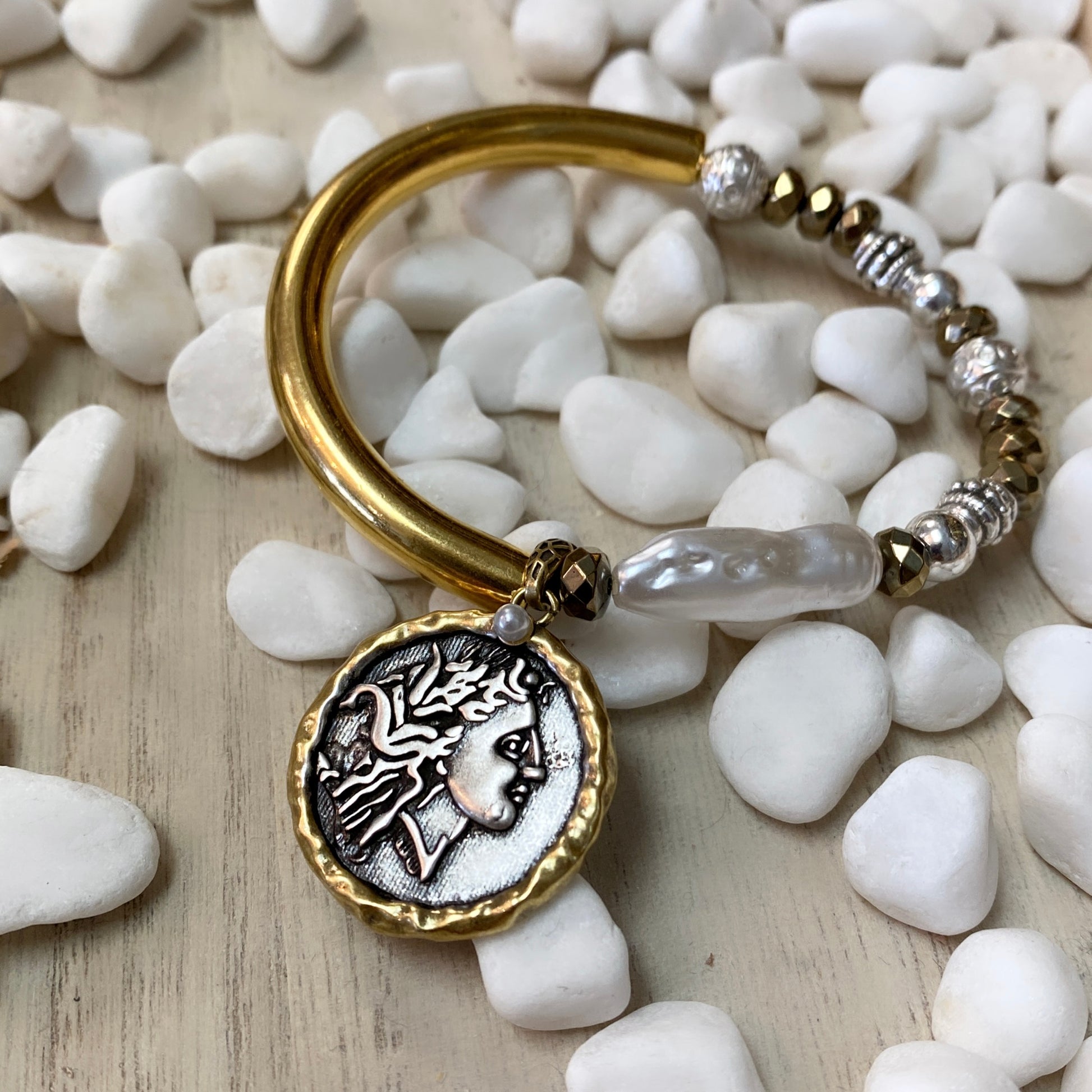 Belle pile bicolore de pièces de monnaie grecques, de perles et de chaîne. Des composants mélangés en parfaite harmonie !
