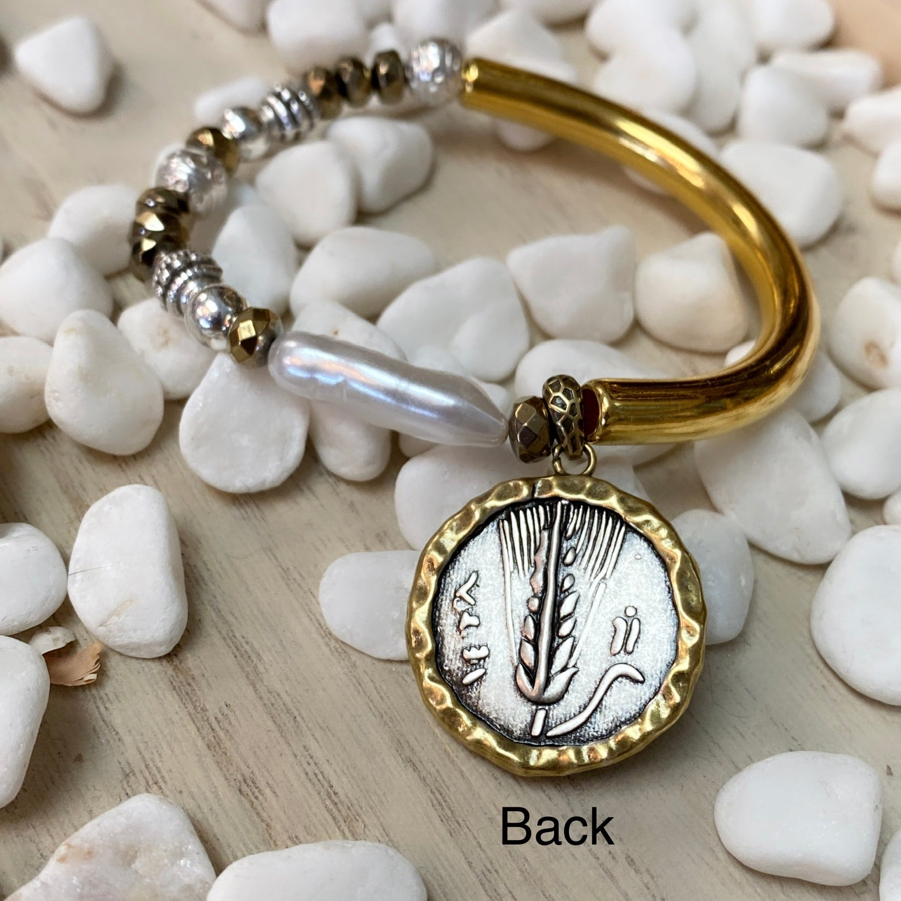 Barre plaquée or #6 avec perles plaquées hématite et argent et breloque pièce en laiton bicolore