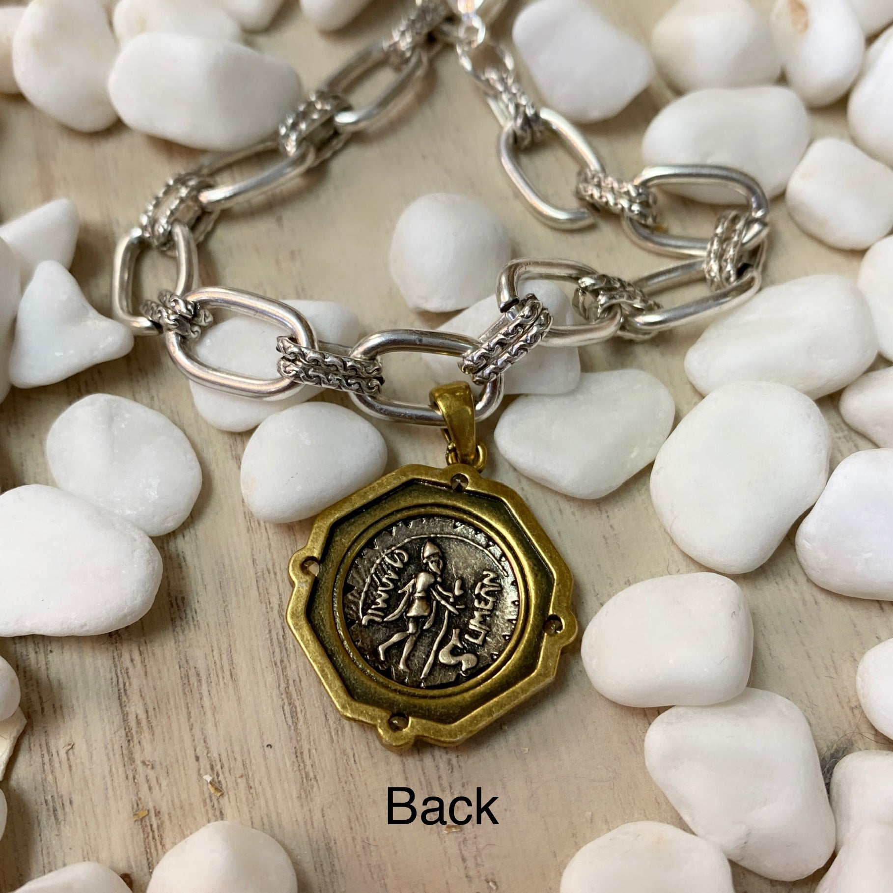Chaîne plaquée argent #5 avec breloque pièce de monnaie bicolore en laiton