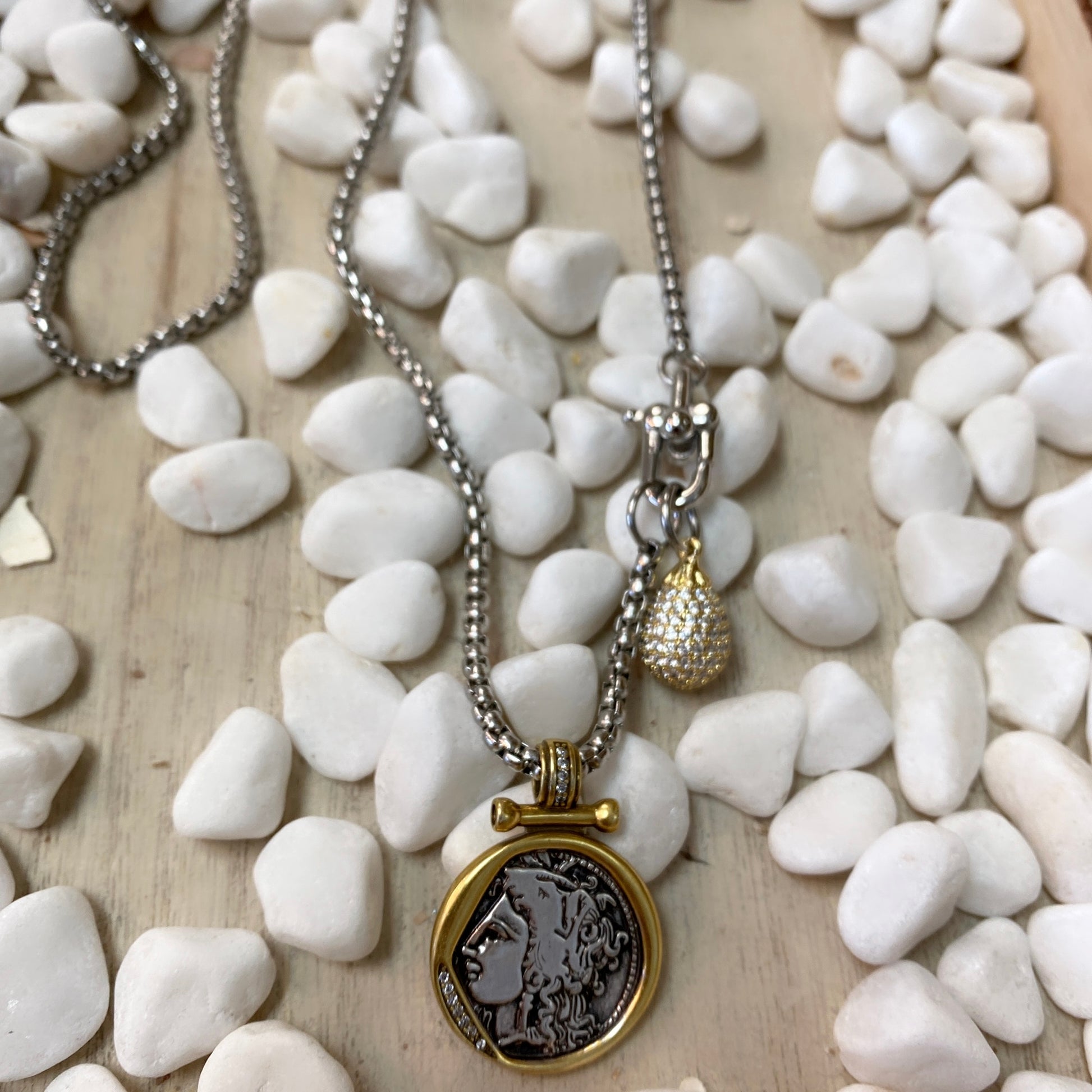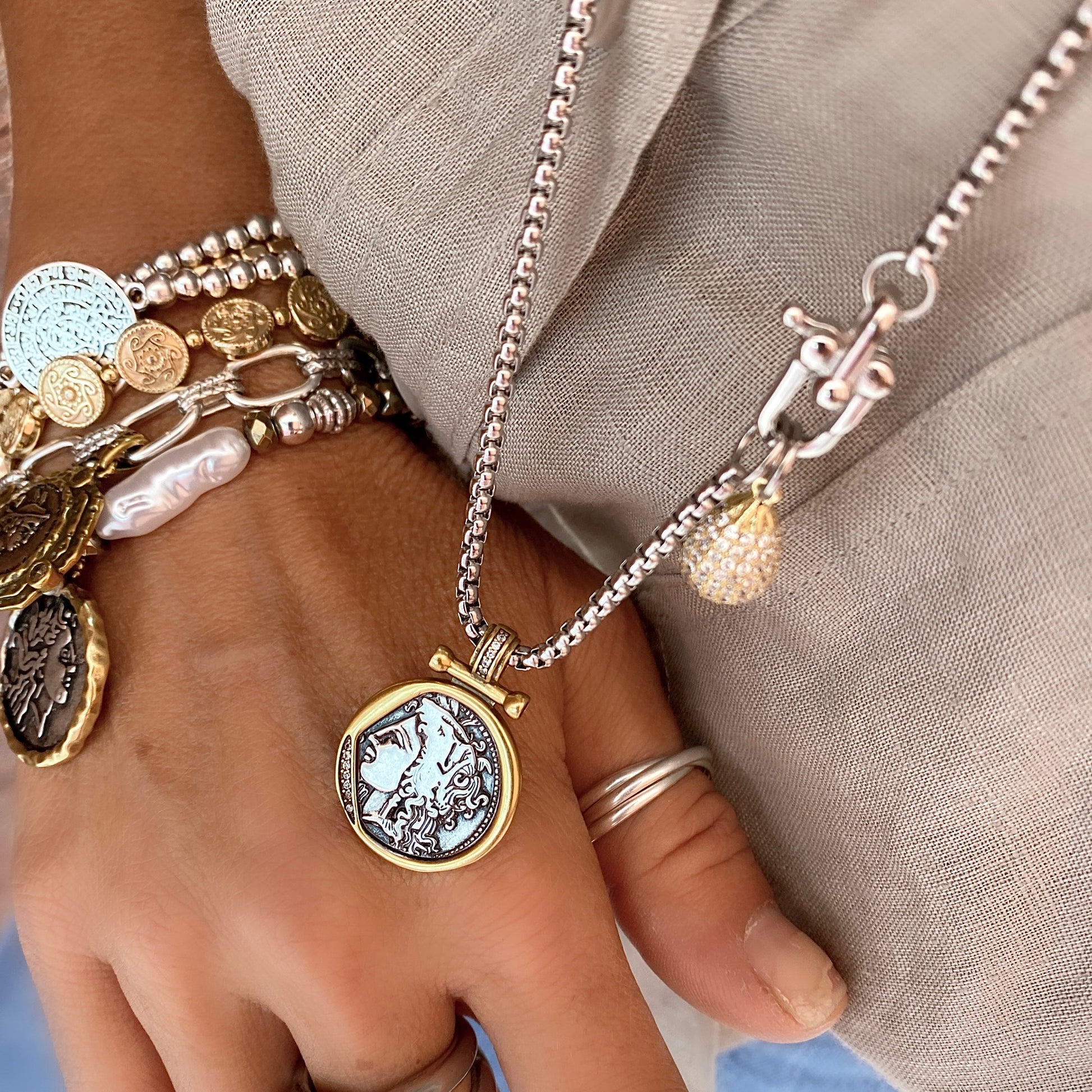 Magnifique collier en couches bicolore au look de pièces de monnaie grecques. perles et chaîne.