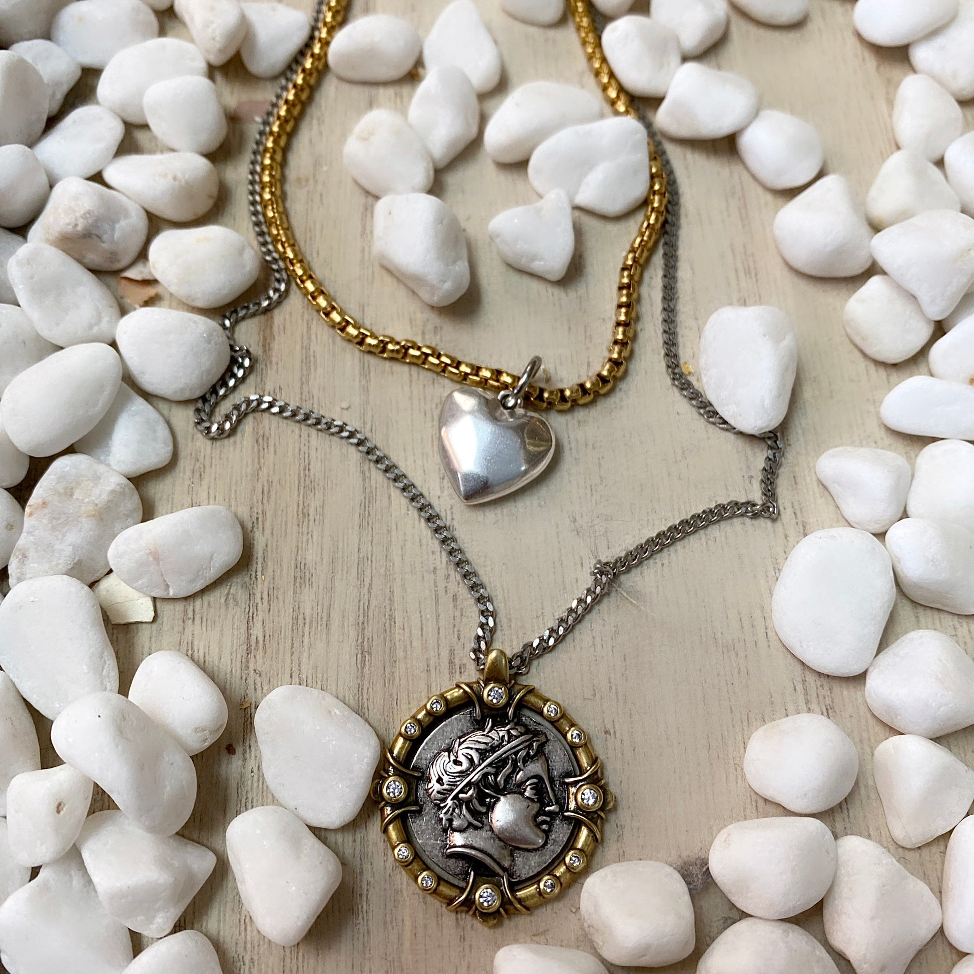 #1 double chaîne en or avec cœur et en argent avec pièce (respectivement 17 et 19") de longueur disponible jusqu'à 20" pour le même prix