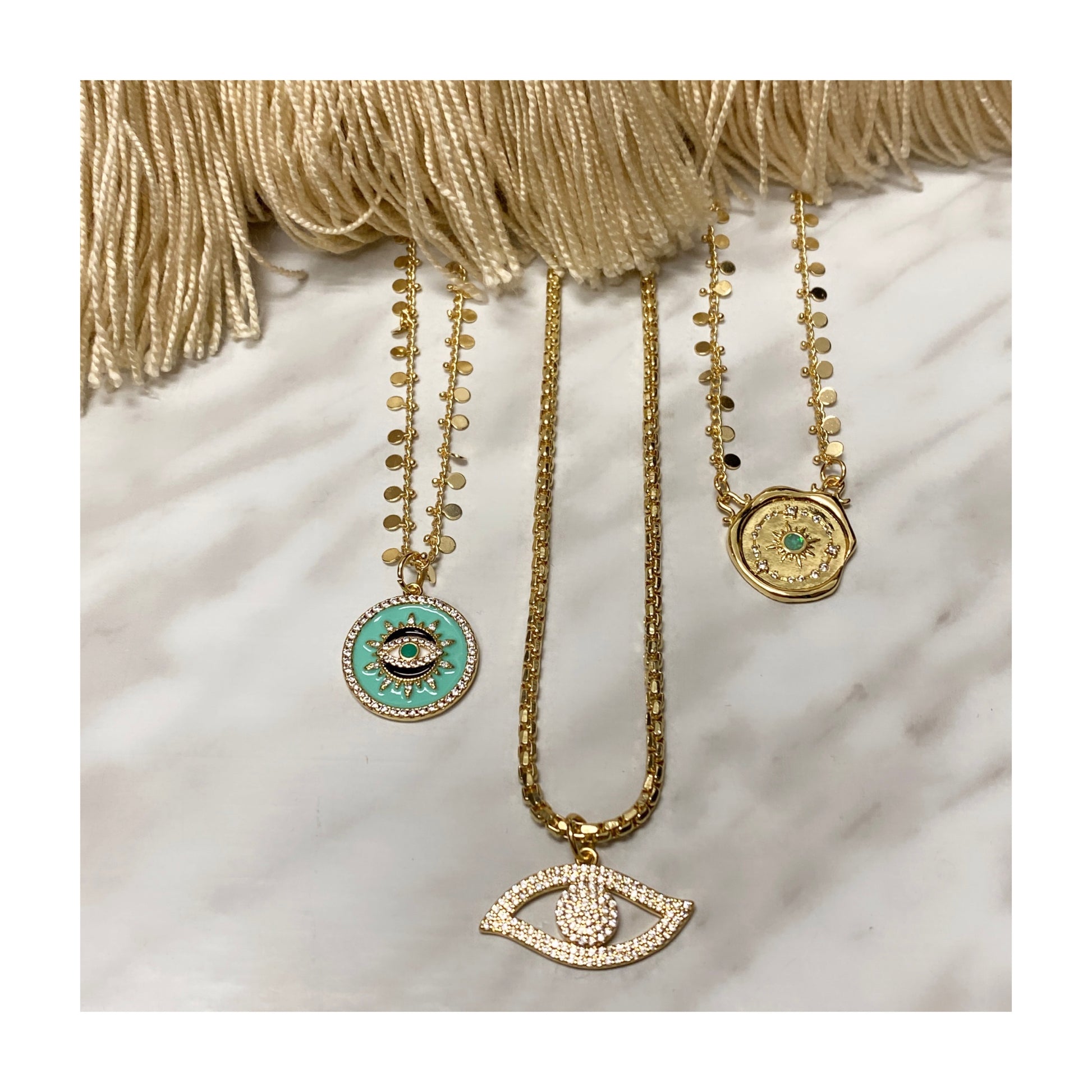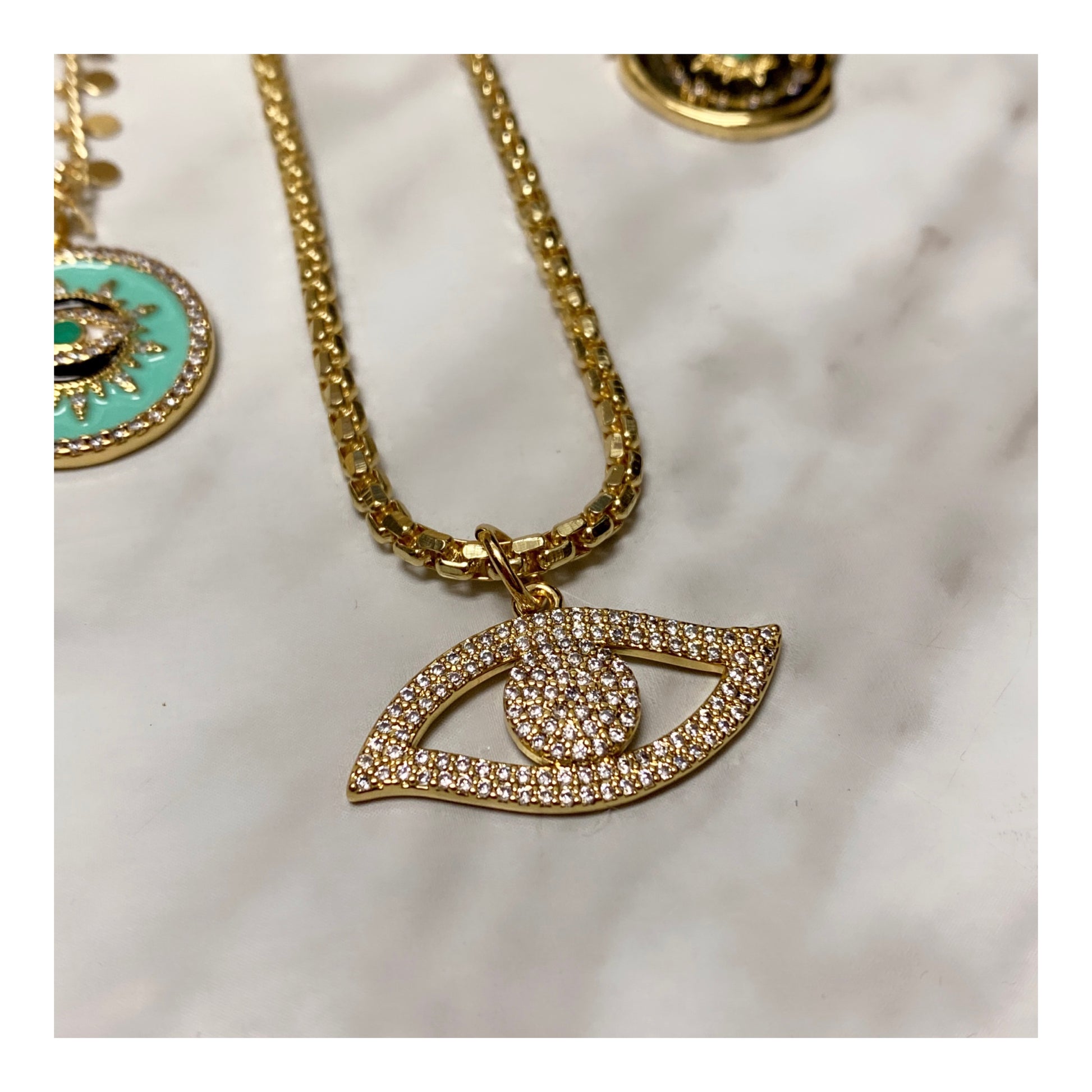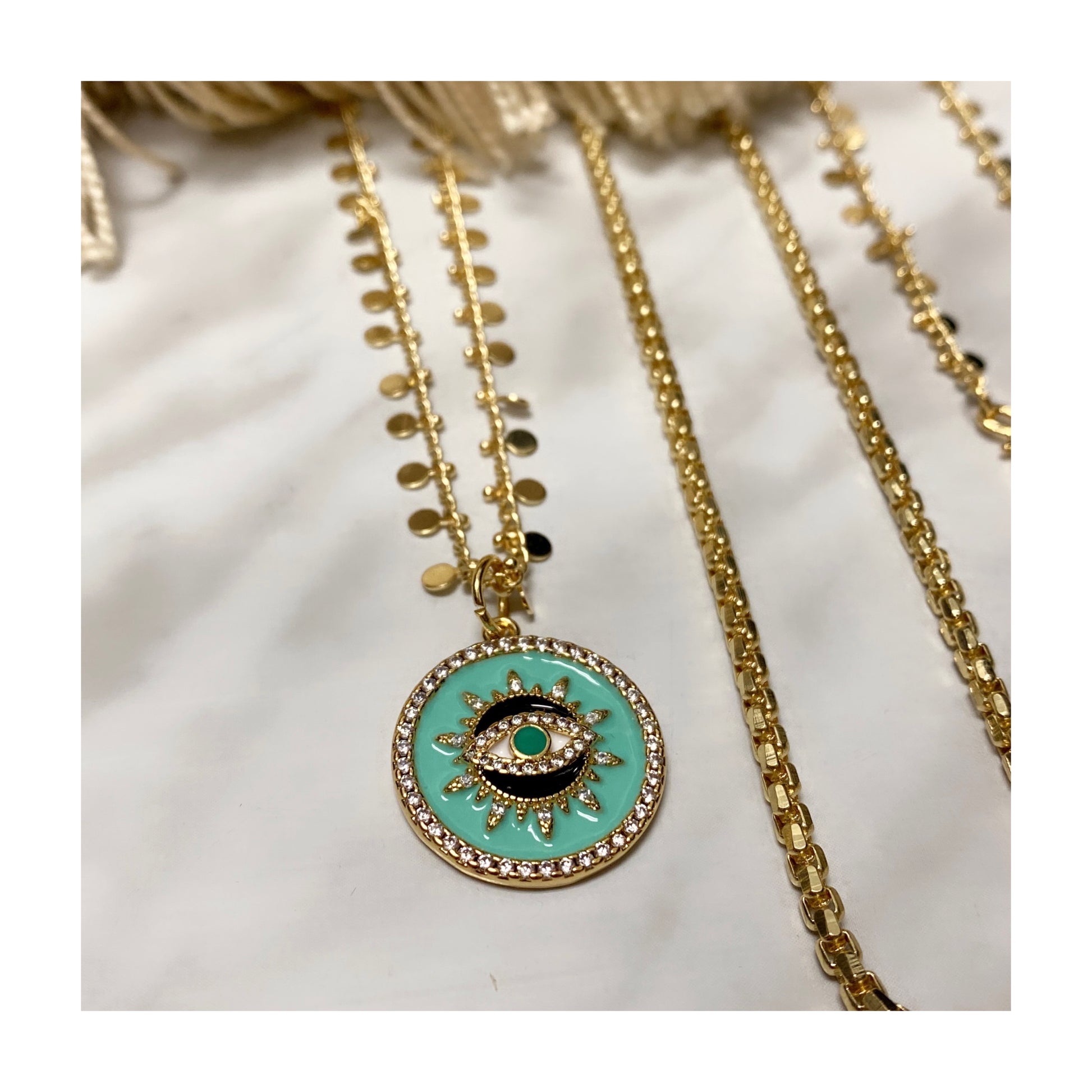 #1 Chaîne fantaisie en laiton avec pendentif œil en émail et fermoir mousqueton mesurant 40,6 cm.