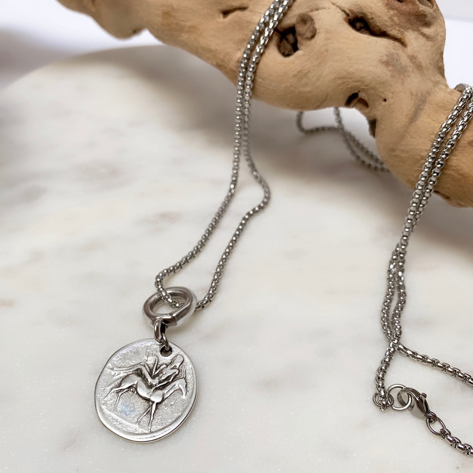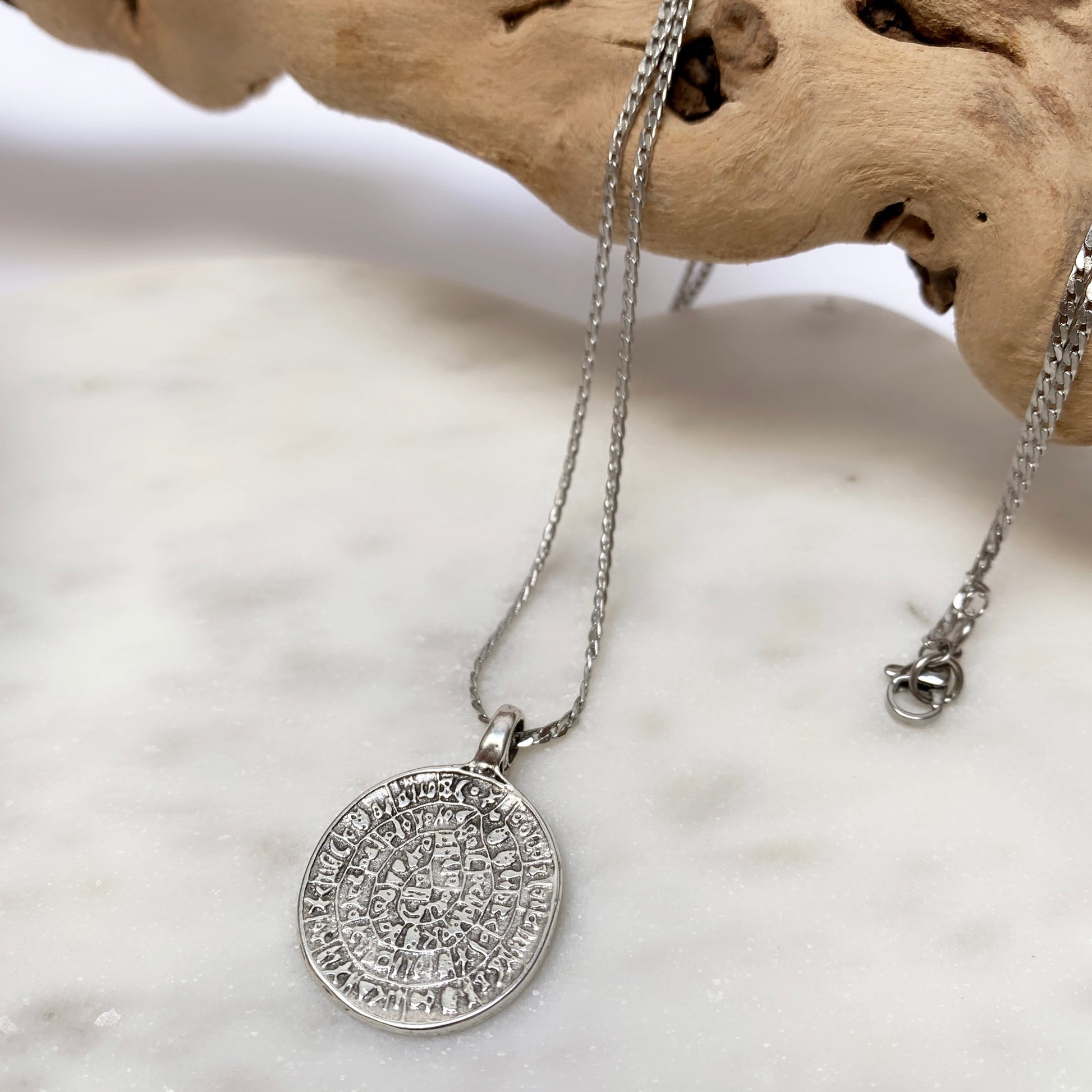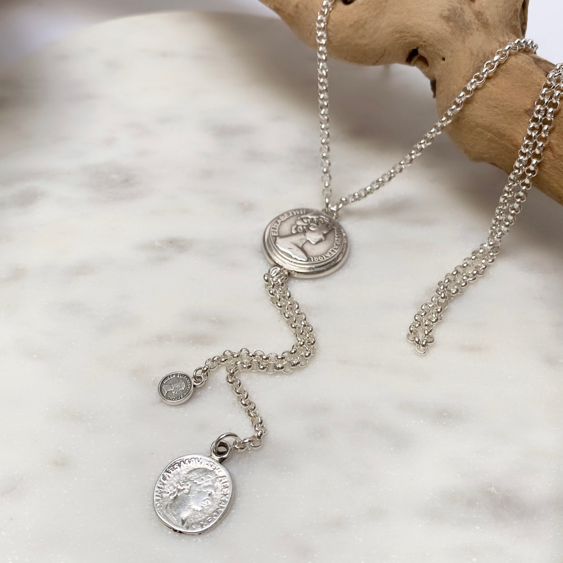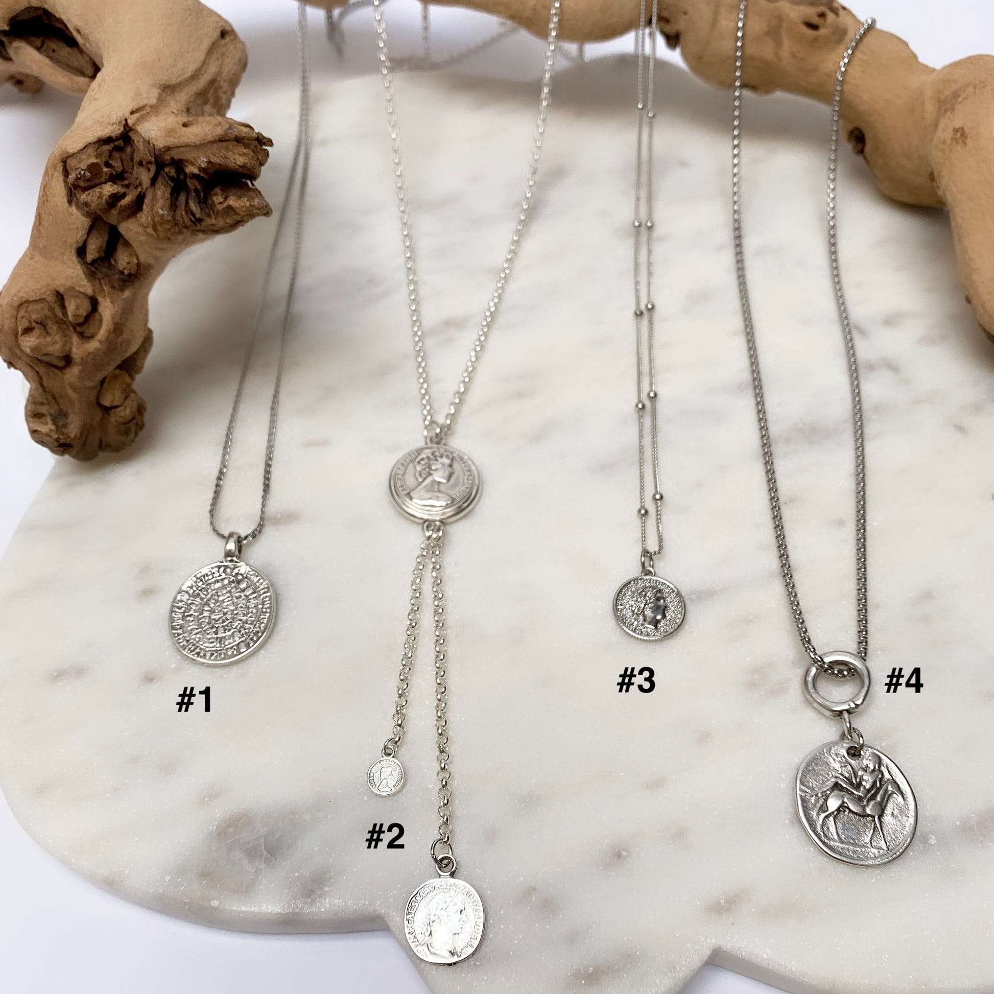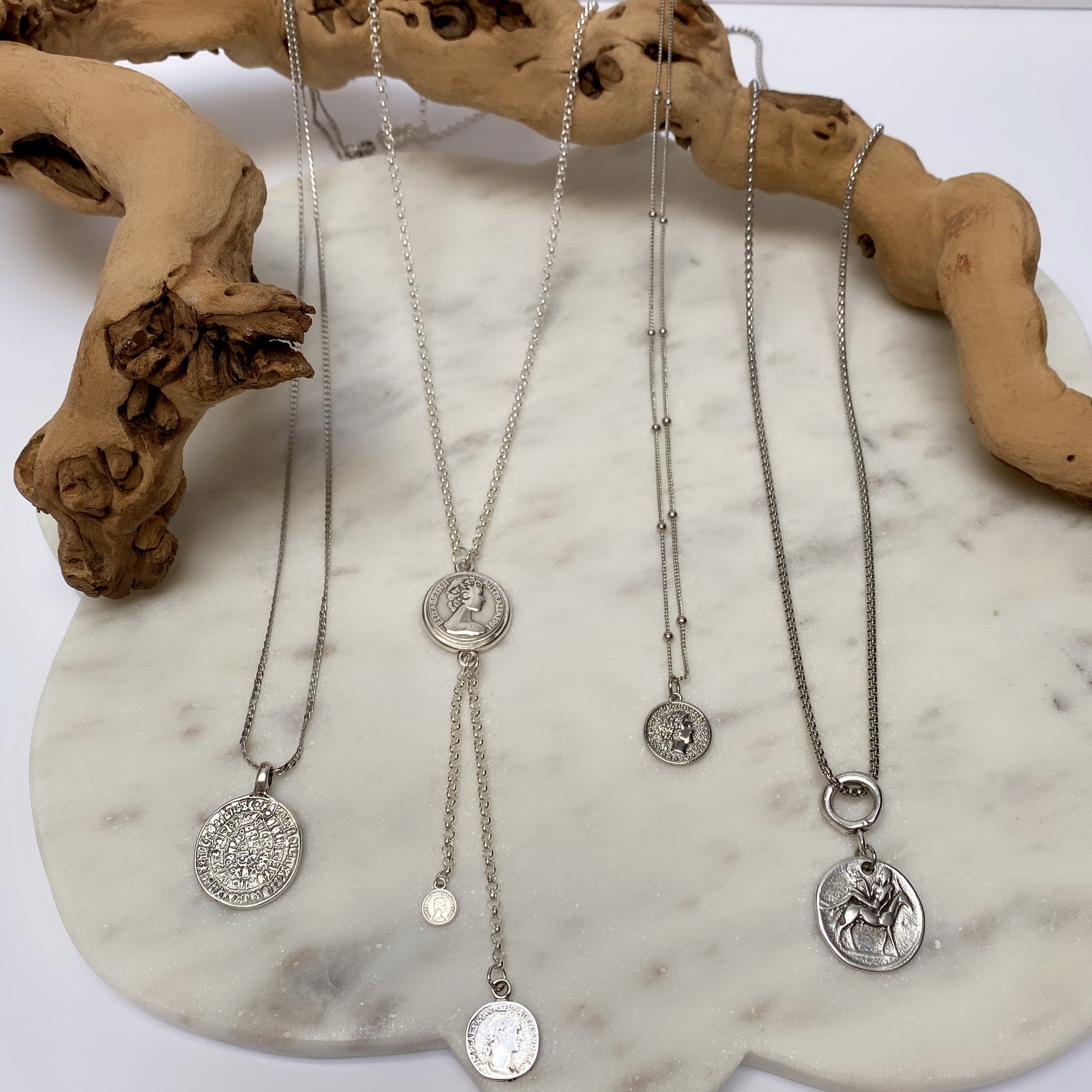 Chaînes en acier inoxydable plaqué argent avec une variation de pendentifs pièces de monnaie