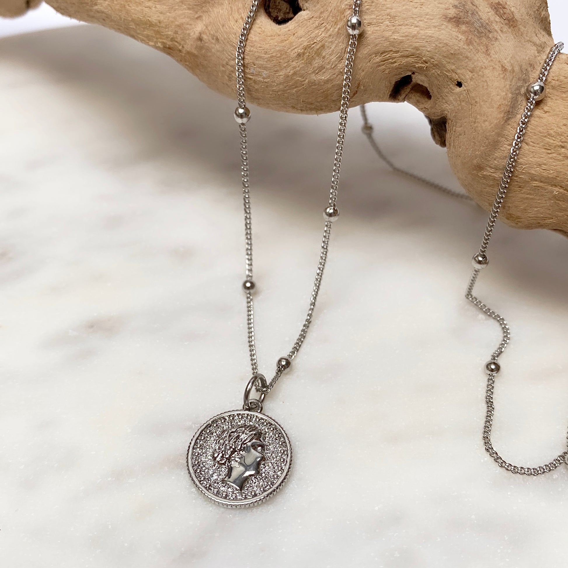 #3 Chaîne à billes en acier inoxydable plaqué argent avec pendentif pièce de monnaie mesurant 25 pouces