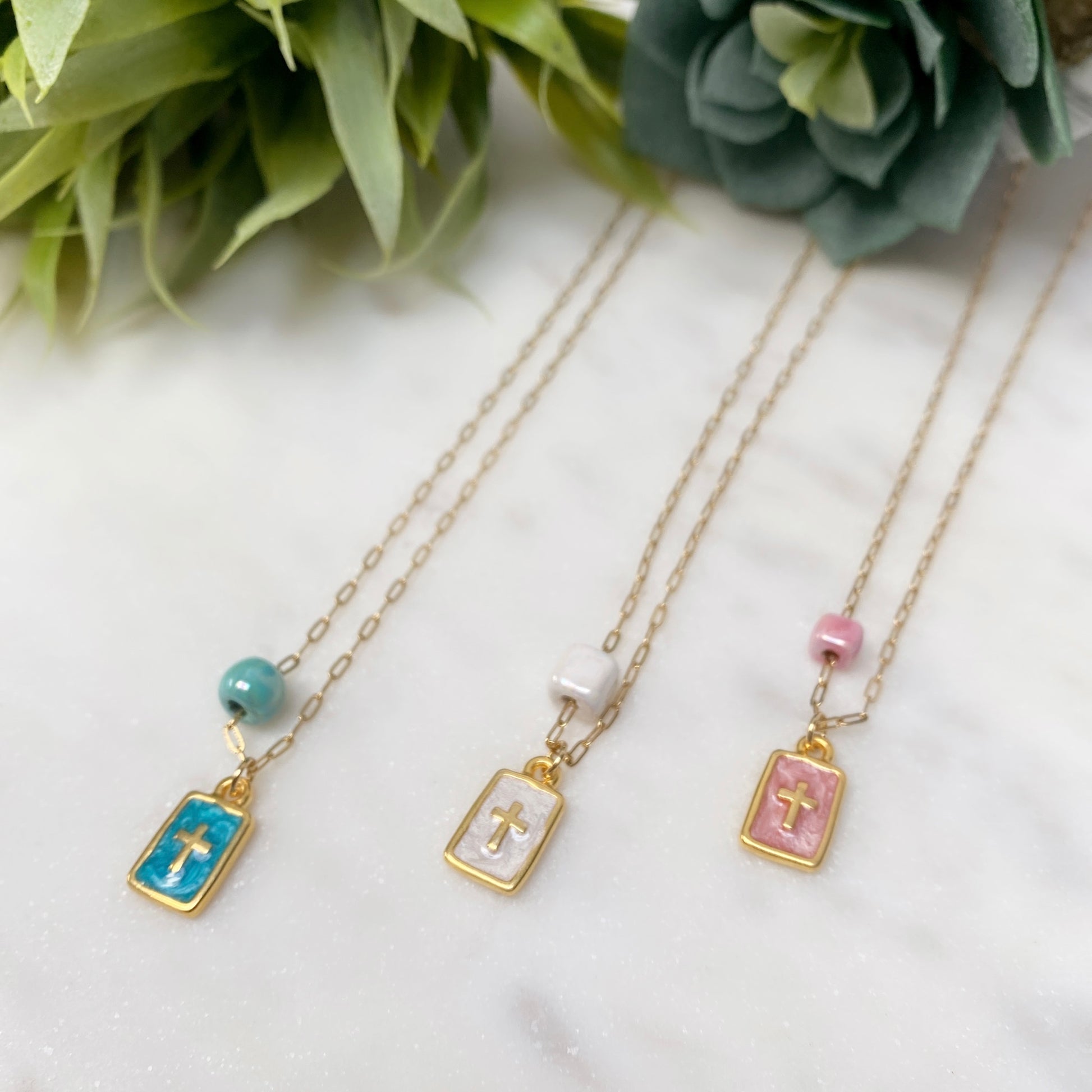 Chaînes en acier inoxydable plaqué or avec pendentifs croix et perle en céramique assortie