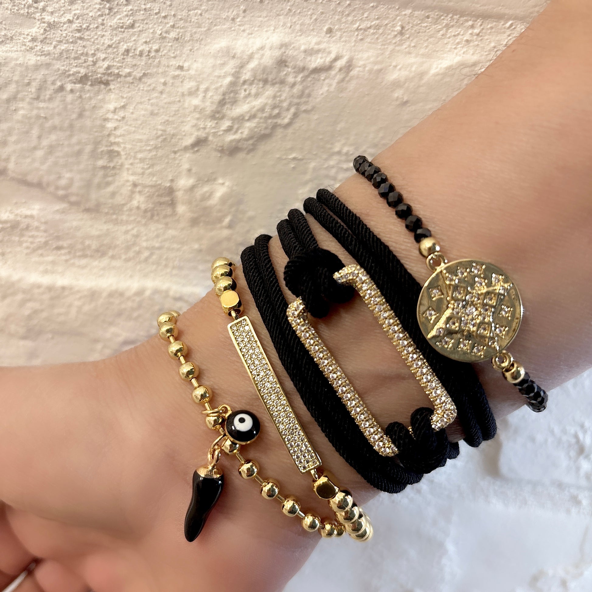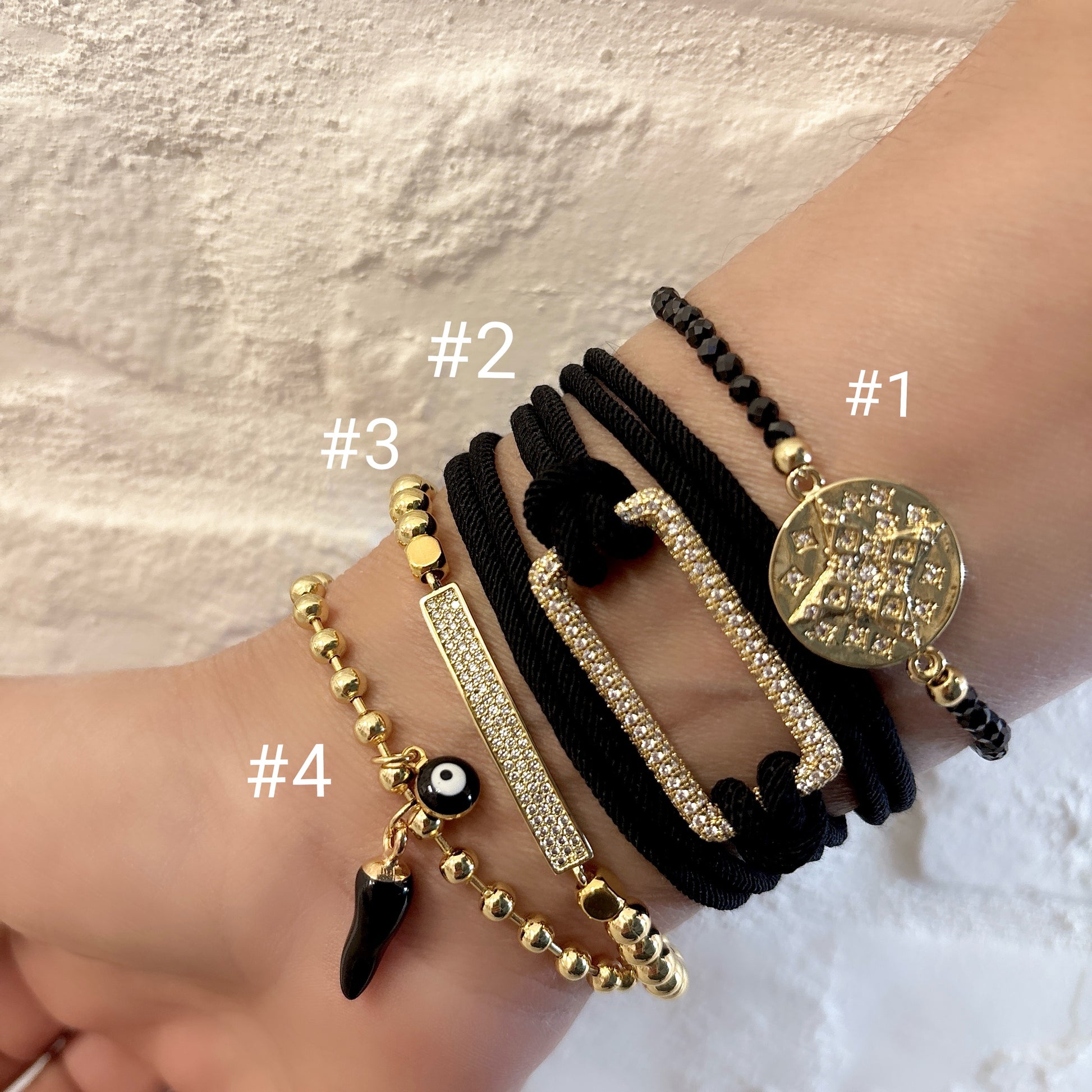 Sublimez votre poignet avec nos BRACELETS NOIRS ! Ces bijoux fantaisie noirs et dorés créent une touche magique, qu'ils soient portés ensemble ou seuls. Chaque bracelet est orné d'un mélange unique de pierres précieuses, de cordon noir, de perles plaquées or et de charmants pendants. Mélangez, assortissez et superposez pour un bracelet parfait !