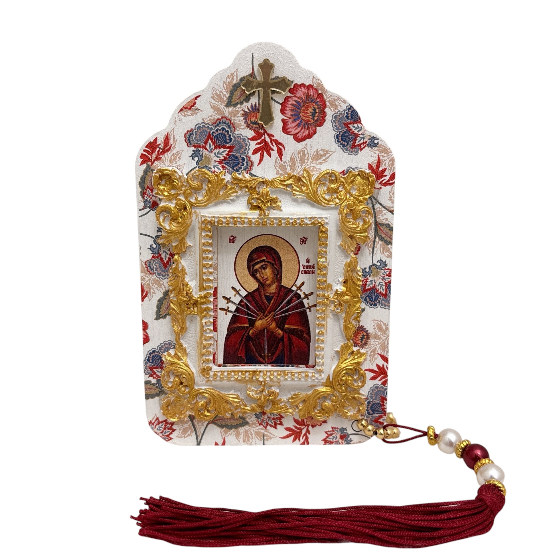 Sublimez votre espace sacré avec ce cadre en porcelaine raffiné orné d'une superbe représentation 3D de l'icône de la Panagia aux Sept Épées. Finie avec de délicates broderies florales et rehaussée d'un pompon rouge éclatant, cette pièce de dévotion allie spiritualité et élégance artistique. Idéale pour un autel, une chambre ou un salon, elle symbolise la foi et apporte une touche d'élégance intemporelle à tout décor. Un précieux souvenir pour ceux qui souhaitent honorer leur héritage orthodoxe avec grâce et respect.