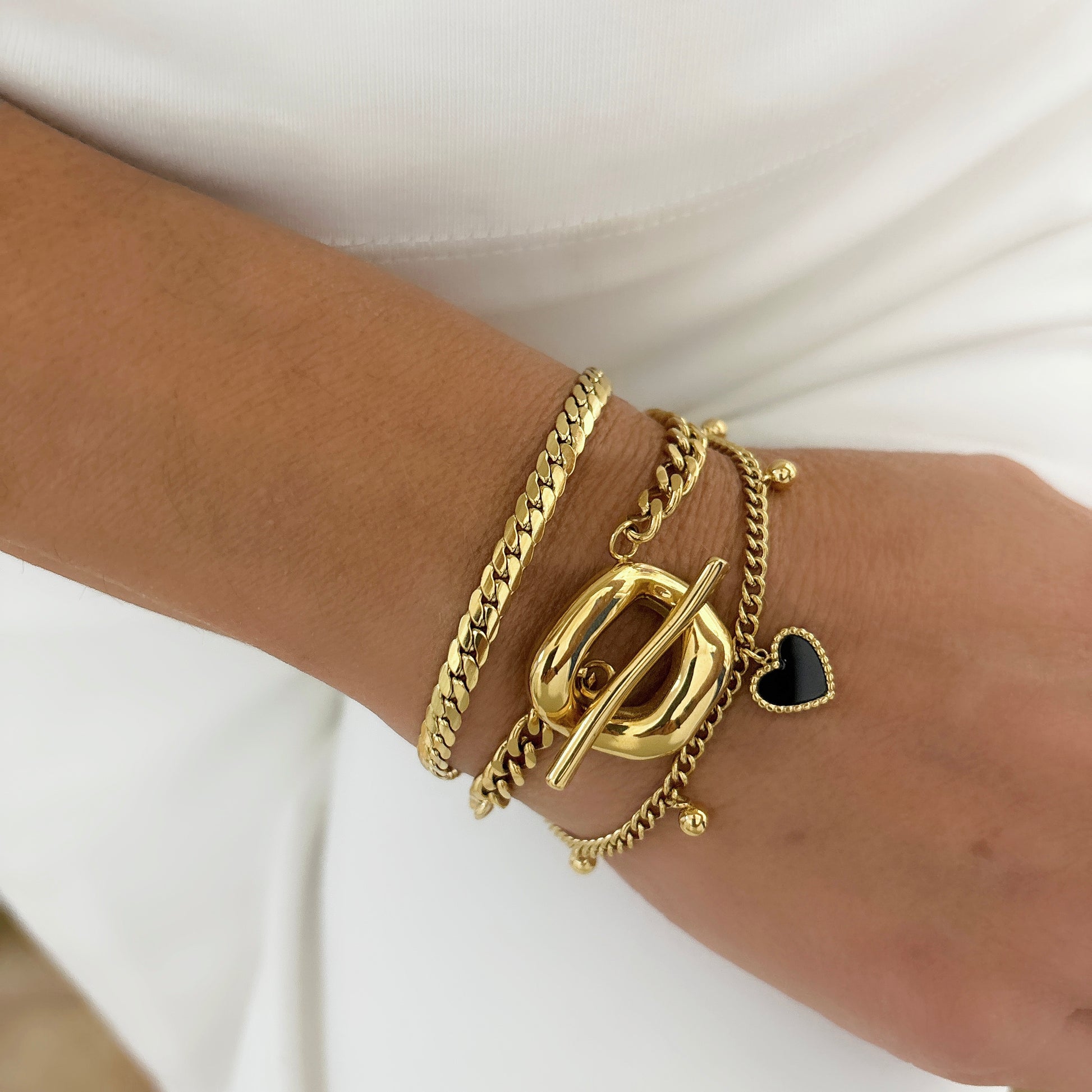 Faites l'expérience du luxe avec nos BRACELETS PELAGIA. Fabriqués en acier inoxydable avec des chaînes plaquées or, ils sont dotés d'un grand bracelet à bascule et d'un délicat bracelet à breloques en forme de cœur noir. La combinaison parfaite d'élégance et de style. Rehaussez votre look avec cet accessoire incontournable.
