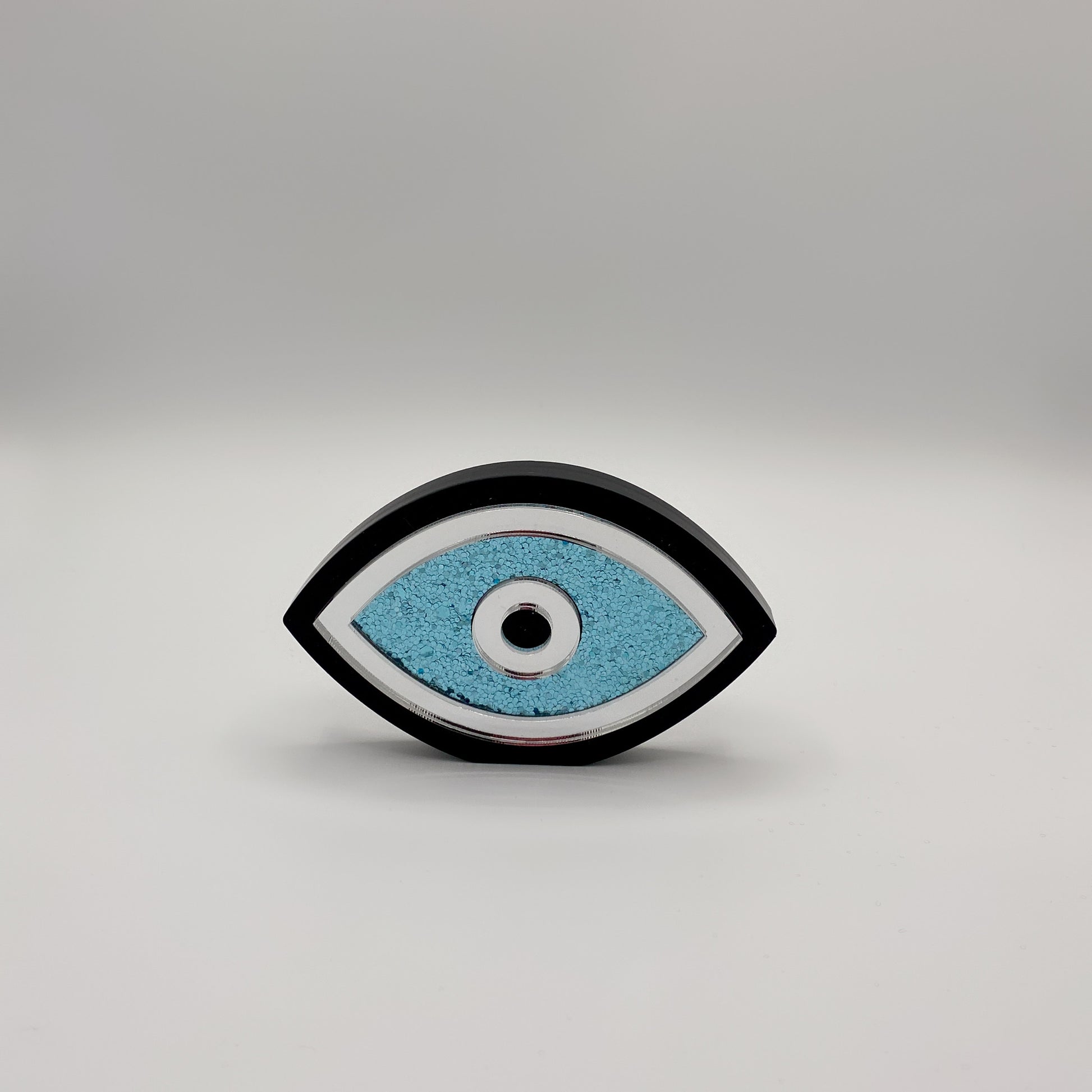 Belle pièce de décoration réalisée en plexiglas noir, miroir argenté, paillettes bleues. Une pièce magnifique pour n’importe quelle maison, un cadeau de pendaison de crémaillère parfait ou un cadeau pour toute nouvelle entreprise. Éloigne le mal pour apporter prospérité et bonne chance !
