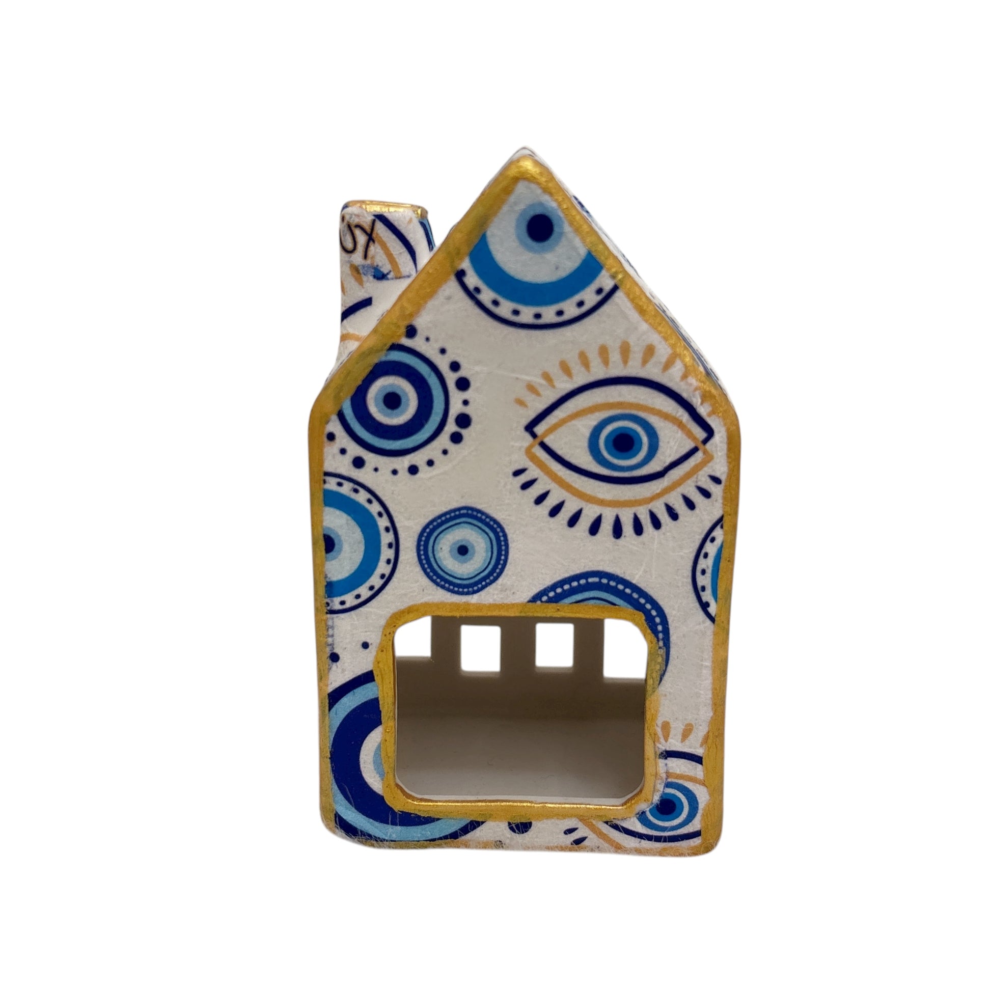 Transformez votre intérieur avec notre charmante lampe chauffe-plat en porcelaine représentant une maison. Son ouverture laisse passer une ampoule qui illumine avec éclat son design raffiné. Choisissez parmi deux modèles élégants, chacun orné d'une prière grecque unique ou d'yeux envoûtants. Apportez une touche chaleureuse et une ambiance unique à votre pièce !