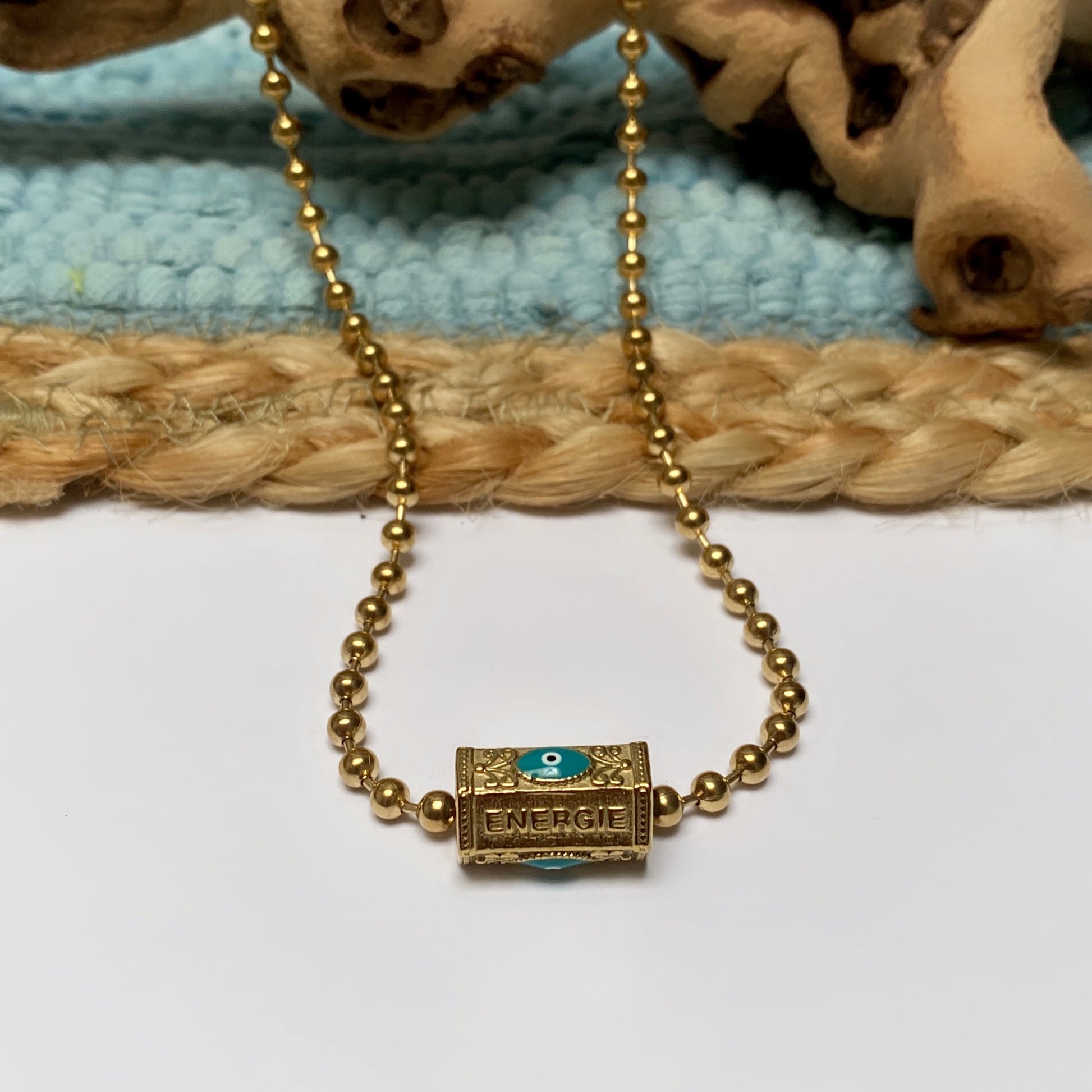 Chaîne à billes avec tube qui a des yeux avec les mots « énergie », « confiance » et « positif » !