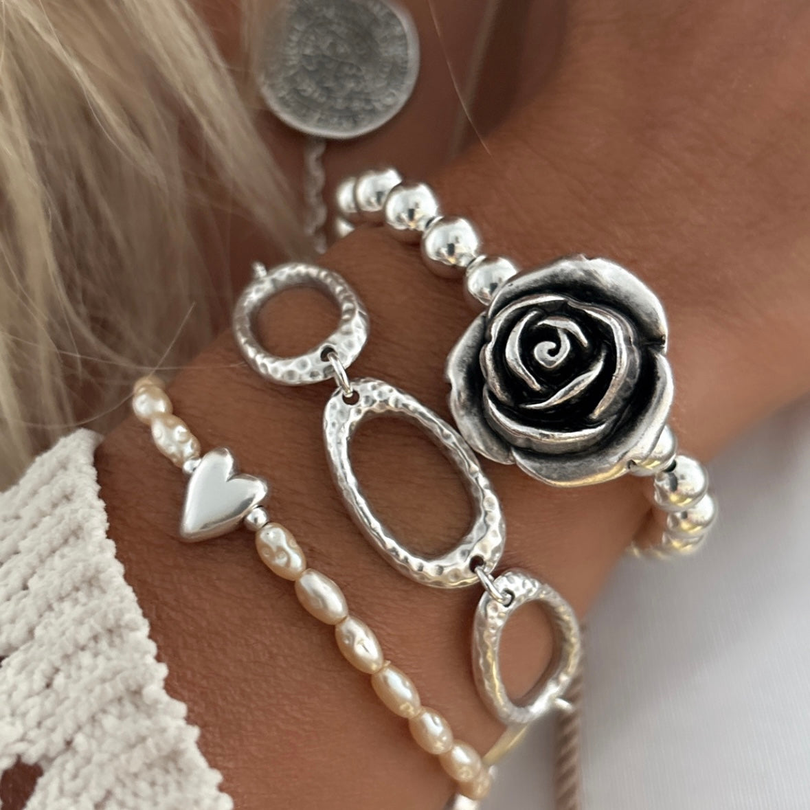Superbe empilement de roses et de cœurs. Superbe avec les colliers superposés Phestos. Les bracelets mesurent environ 19 cm, les bracelets extensibles environ 18 cm