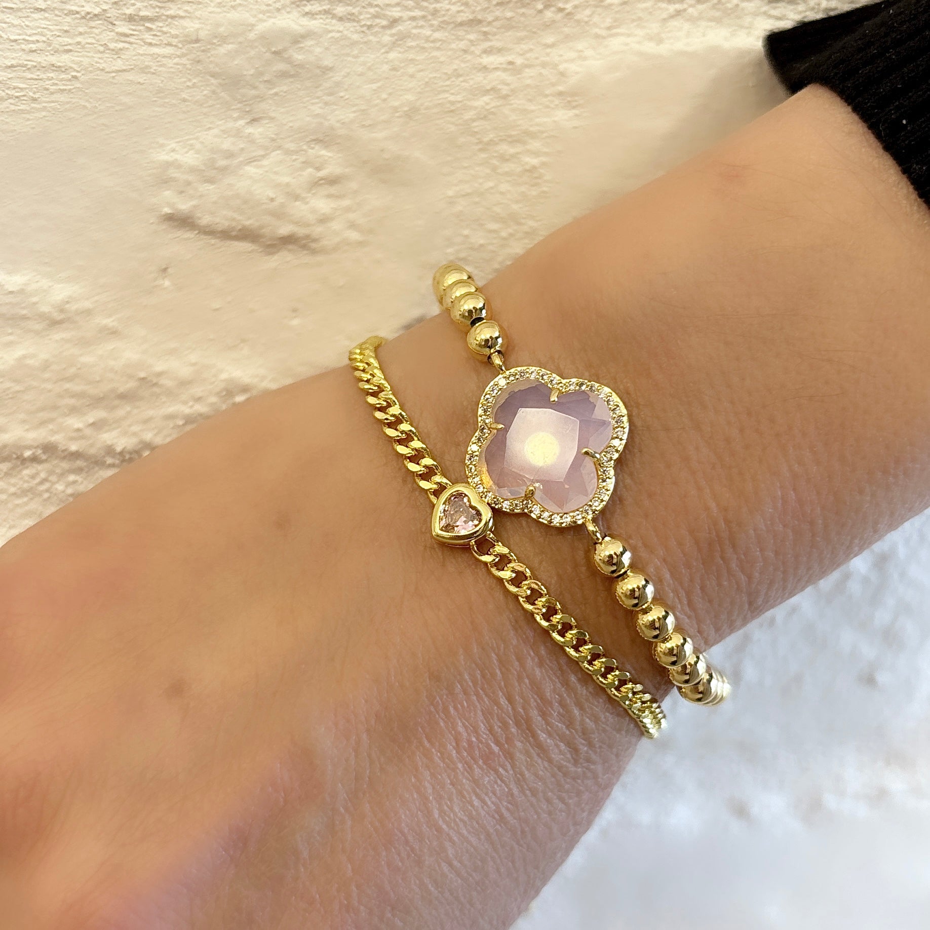 Ajoutez une touche d'éclat à votre garde-robe avec nos bracelets RULA et leur bague assortie ! Ornés d'un joli motif trèfle et cœur roses, ils sont ornés de pierres roses sur un anneau en acier inoxydable. Affirmez votre style sans vous prendre au sérieux.