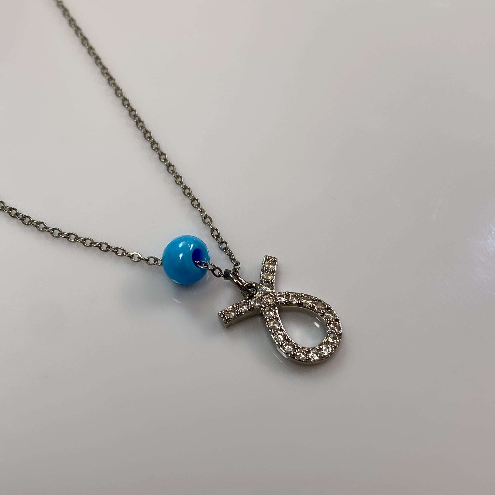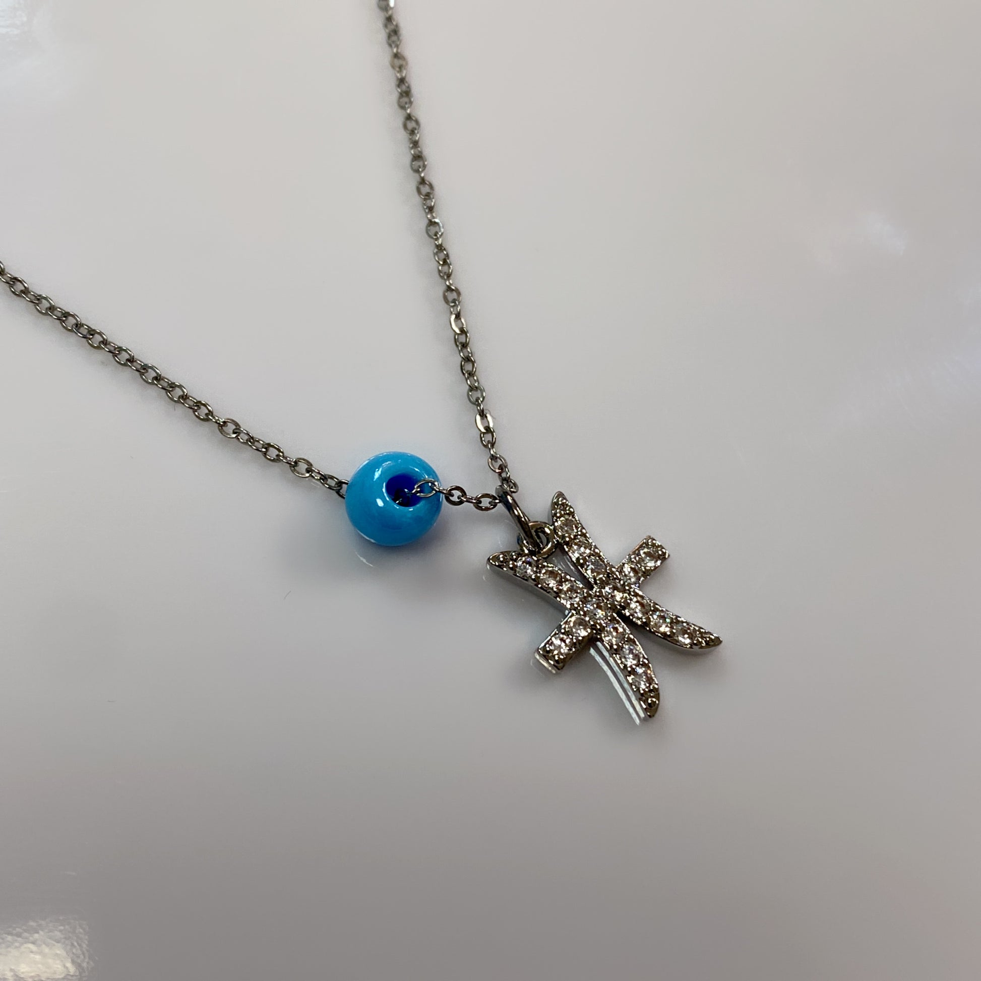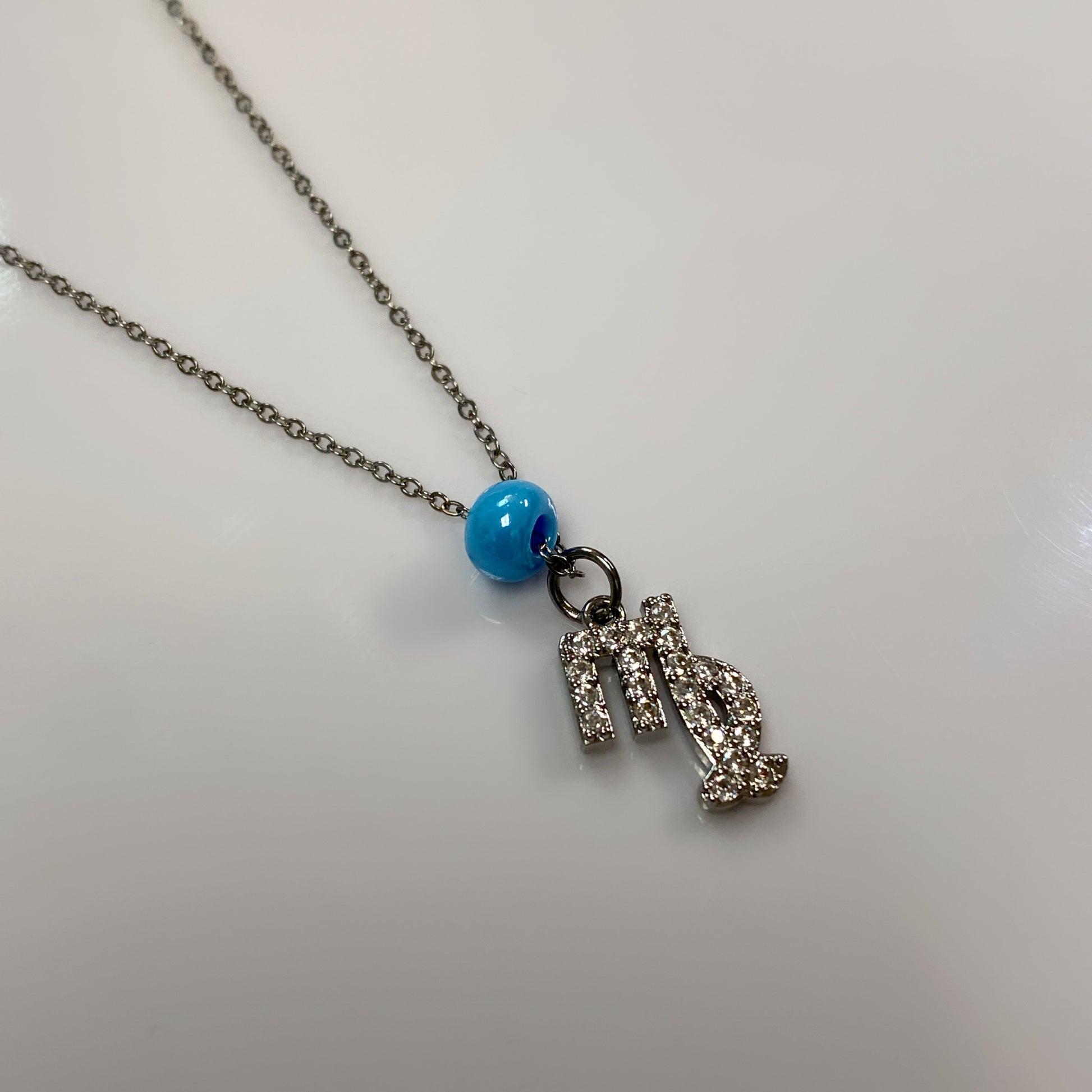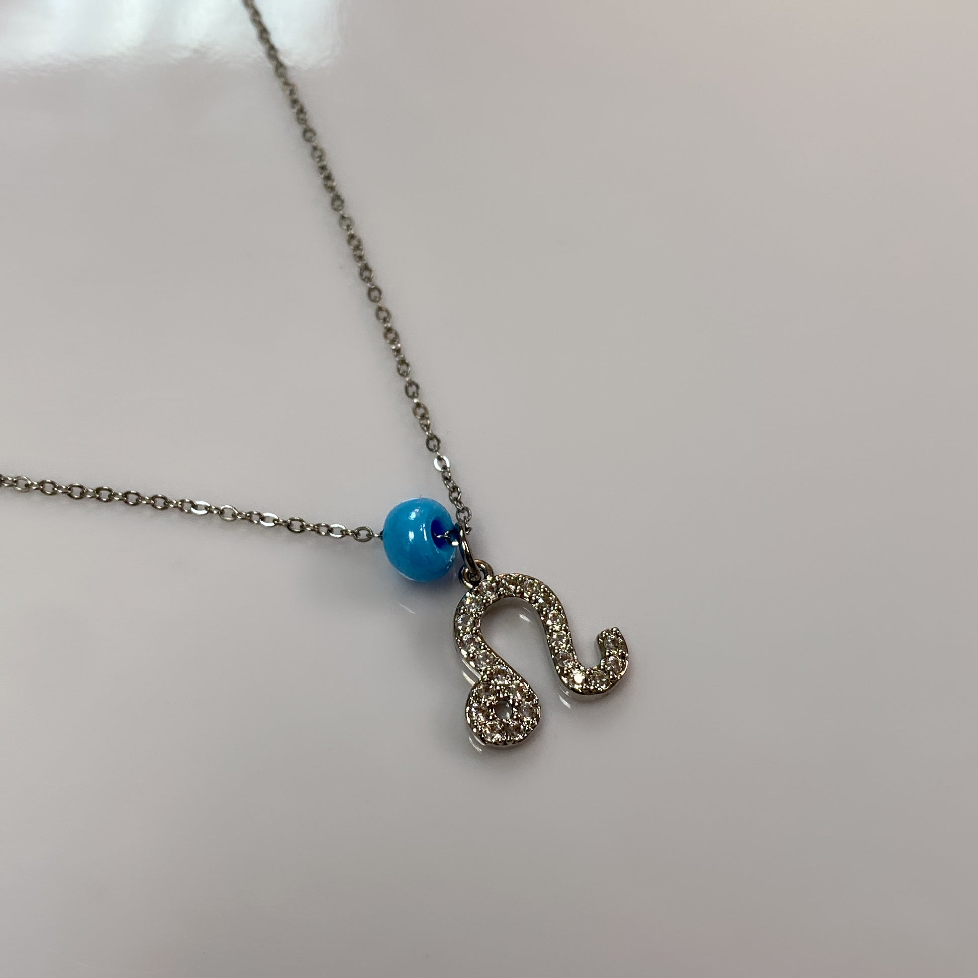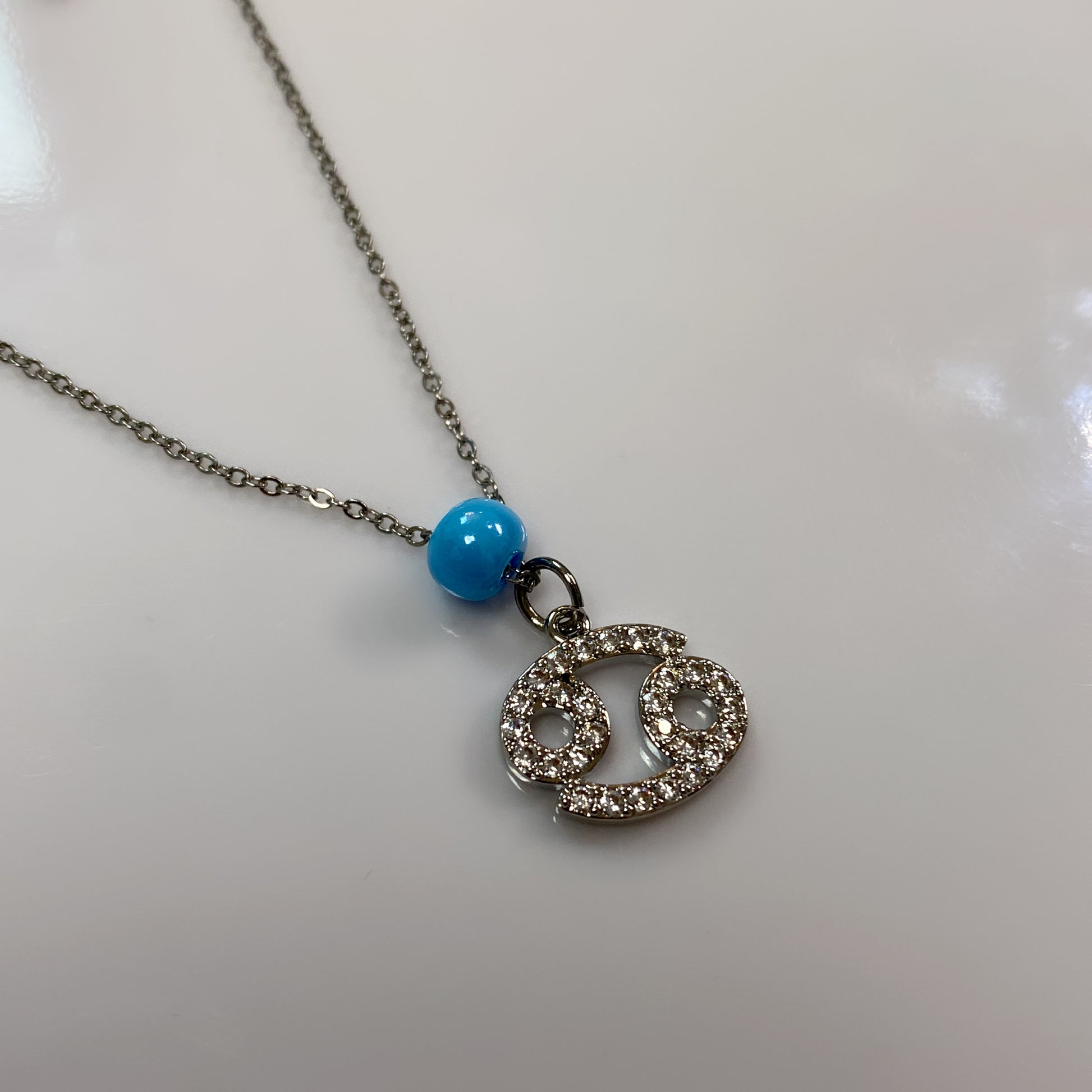 Chaîne en acier inoxydable avec zodiaque en zircone cubique et perle en verre bleu.