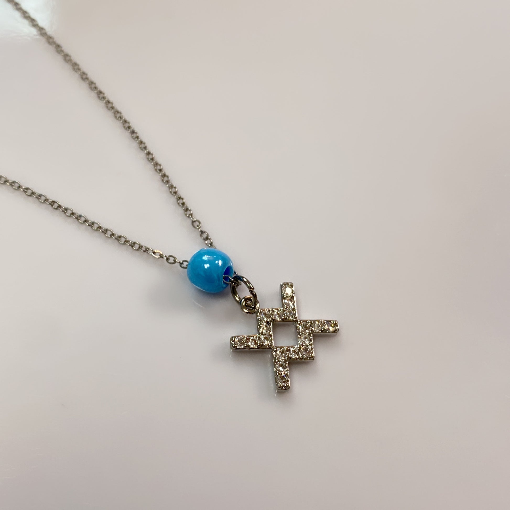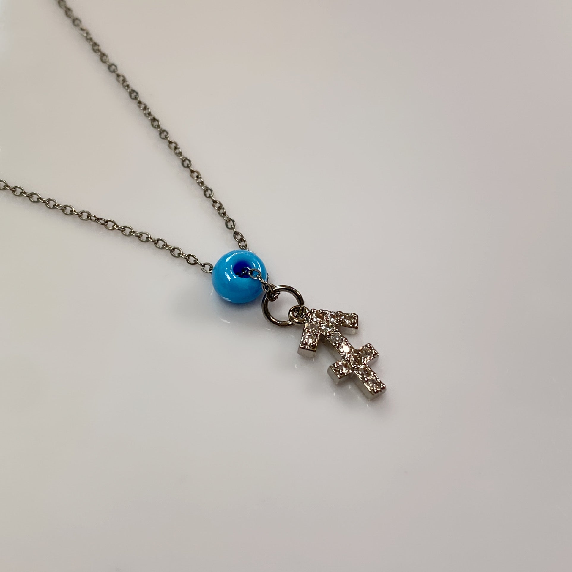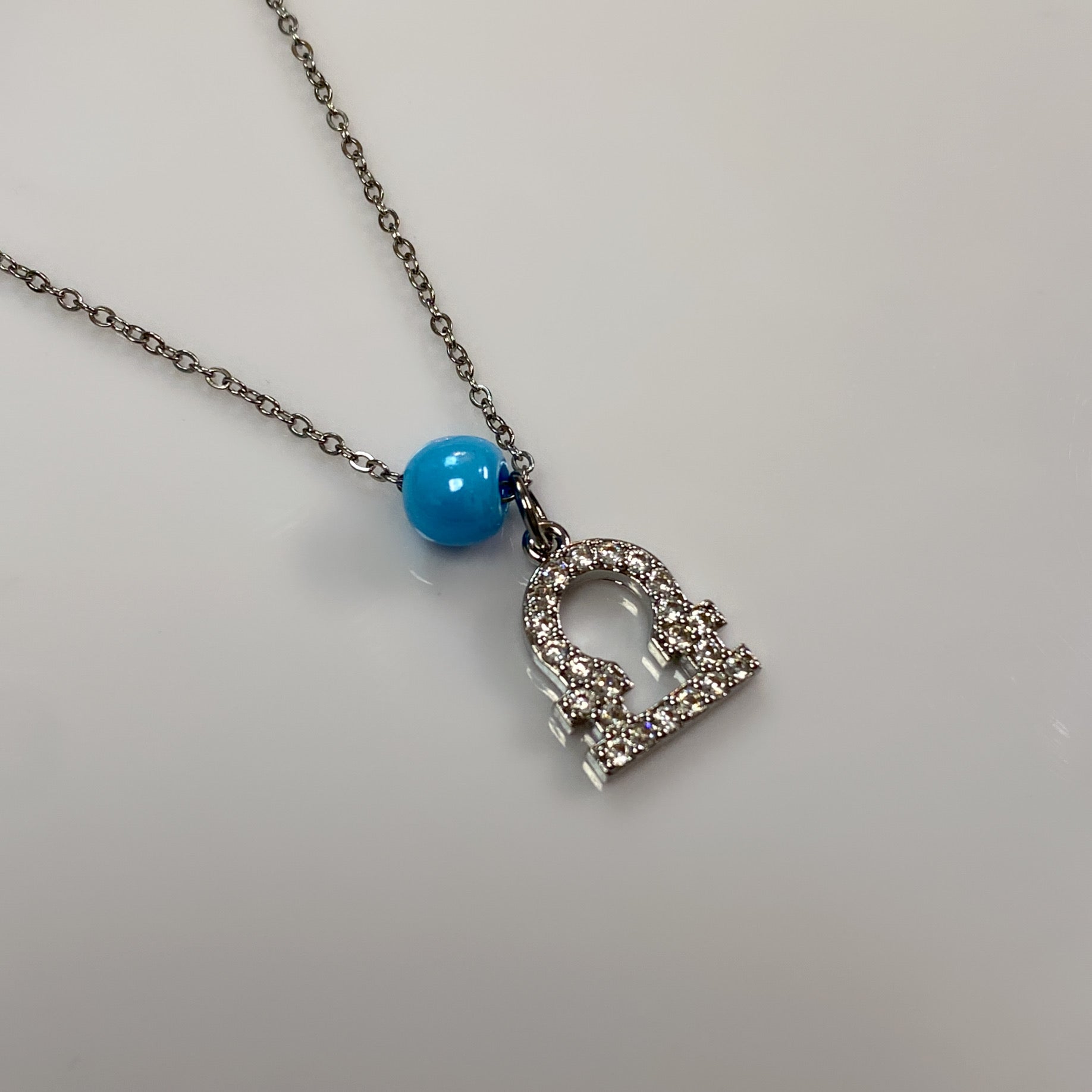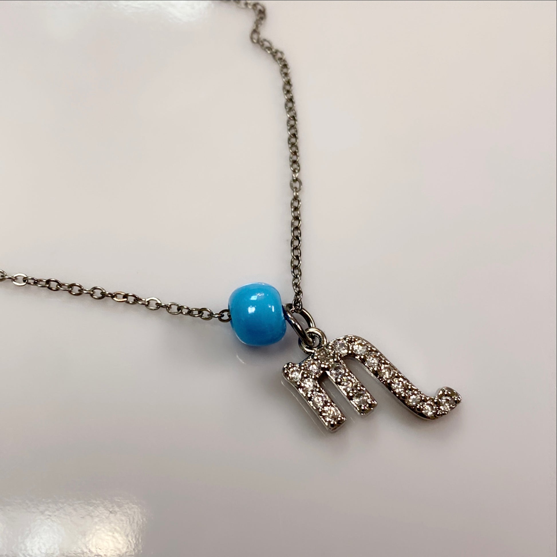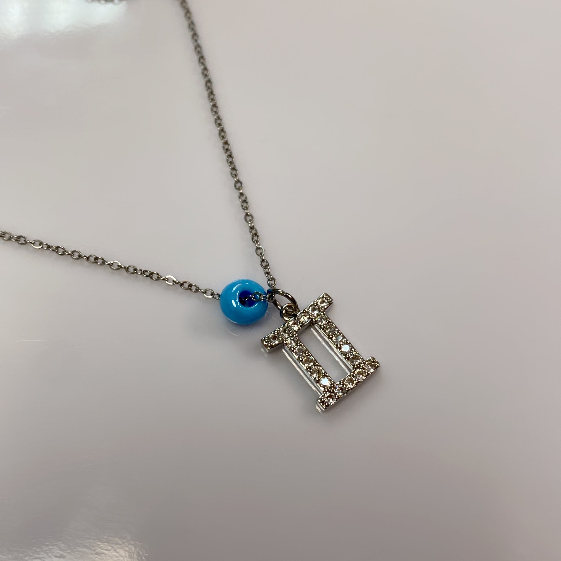 Chaîne en acier inoxydable avec zodiaque en zircone cubique et perle en verre bleu.