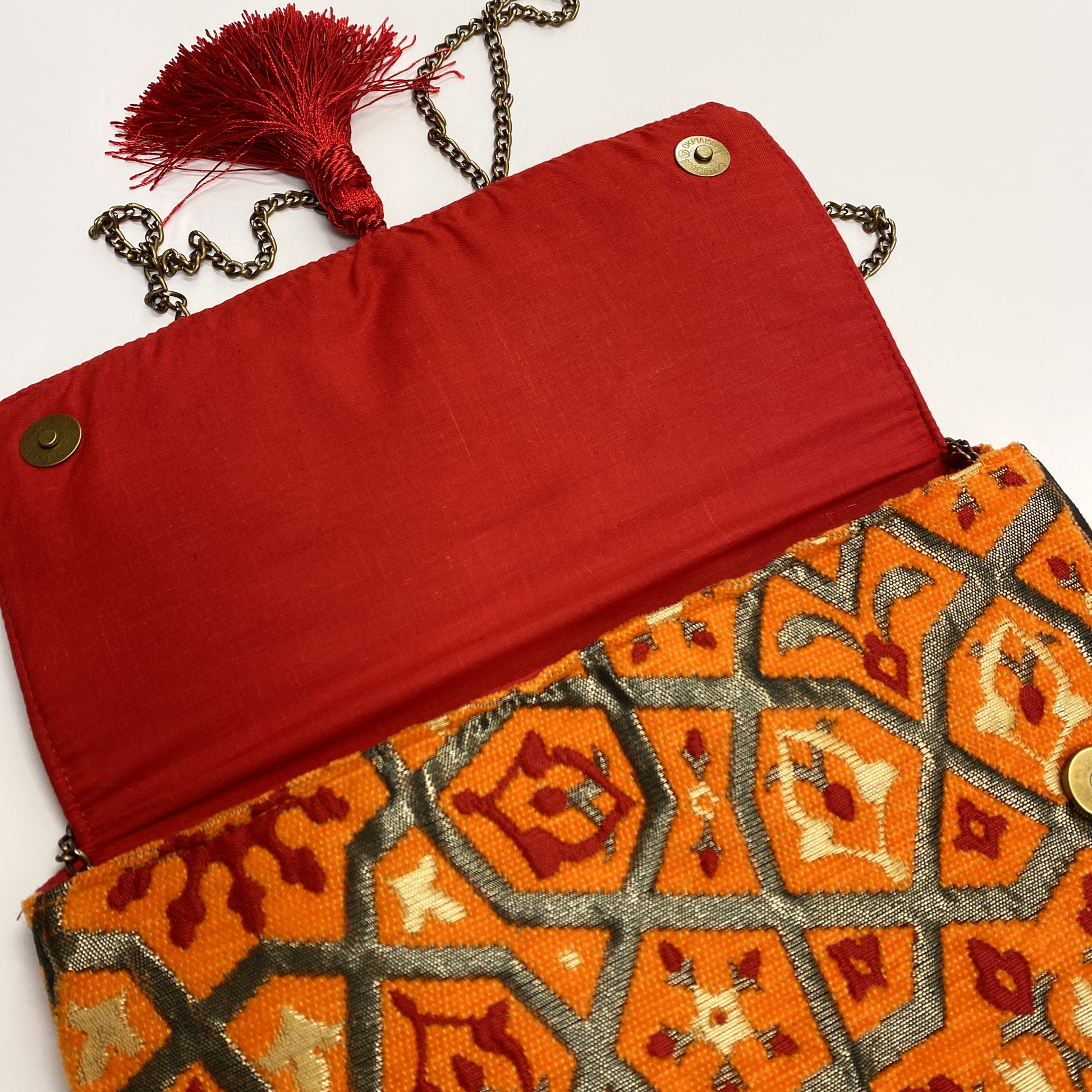 Un magnifique mélange d'orange, de rouge rubis et de jaune pâle, ce sac attire le regard ! Ce sac fait main au motif diversifié est agrémenté d'un magnifique pompon rouge rubis. Peut être tenu comme une pochette ou porté comme un sac grâce à la chaîne qui l'accompagne.
