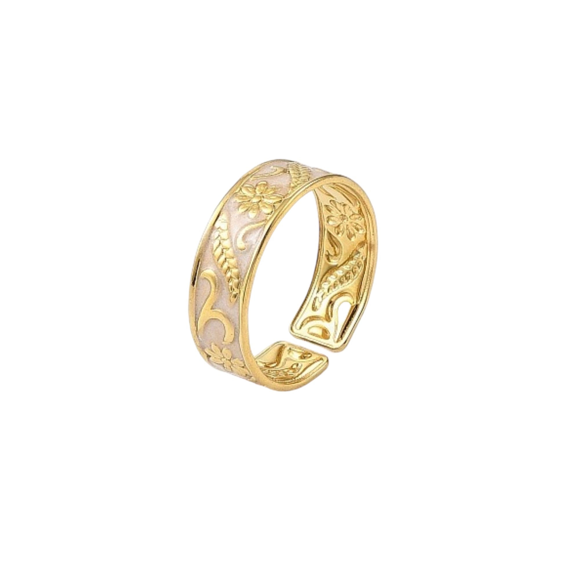 Rehaussez votre style avec les bagues THEA ! Cette superbe bague large arbore un design unique en forme de croix orné de perles et d'une pierre turquoise, tandis que la bande ouverte arbore de magnifiques détails en émail blanc. Faites une déclaration audacieuse et élégante avec l'une de ces bagues incontournables.