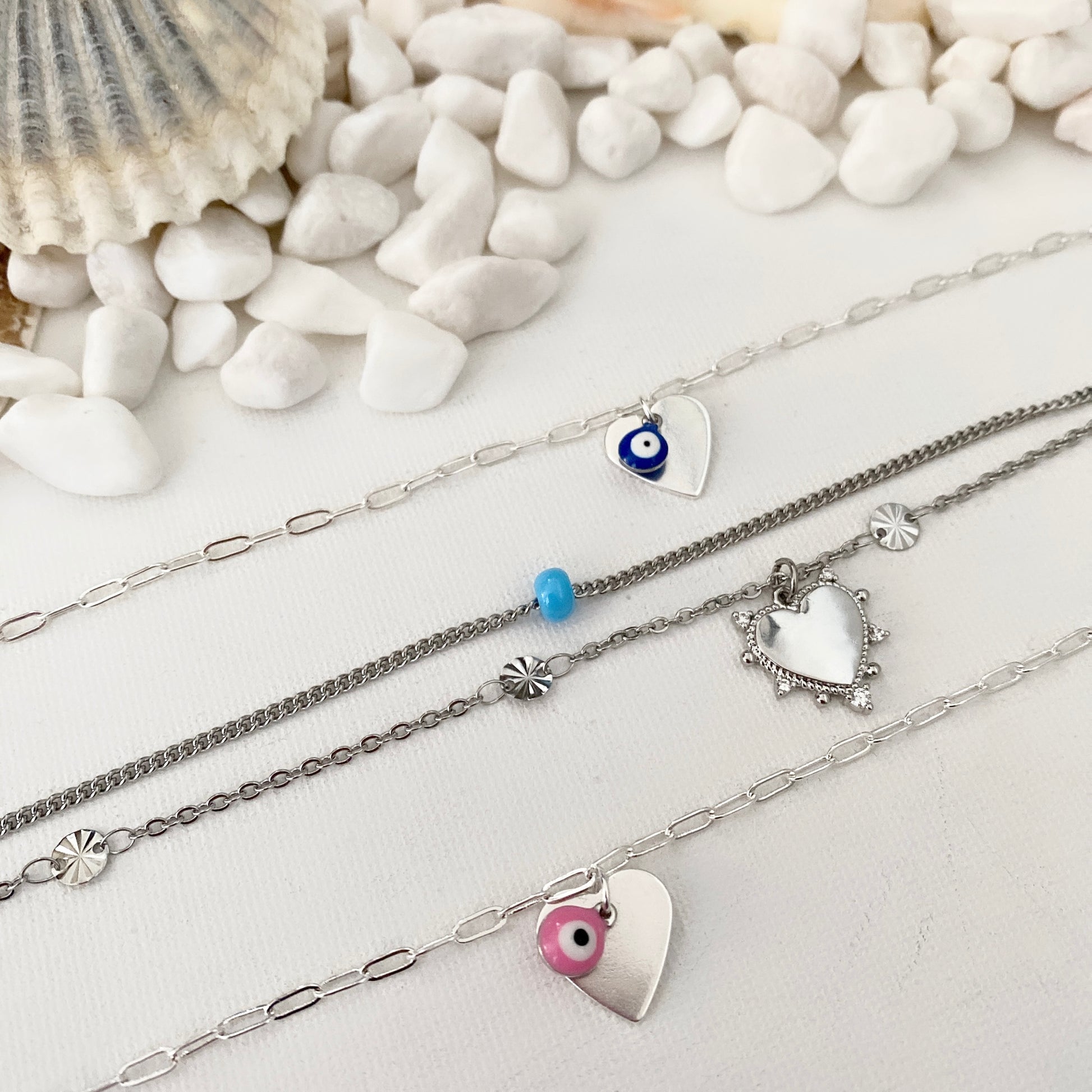 #1 Chaîne de trombones en acier inoxydable avec coeur en acier inoxydable et breloque œil en émail bleu