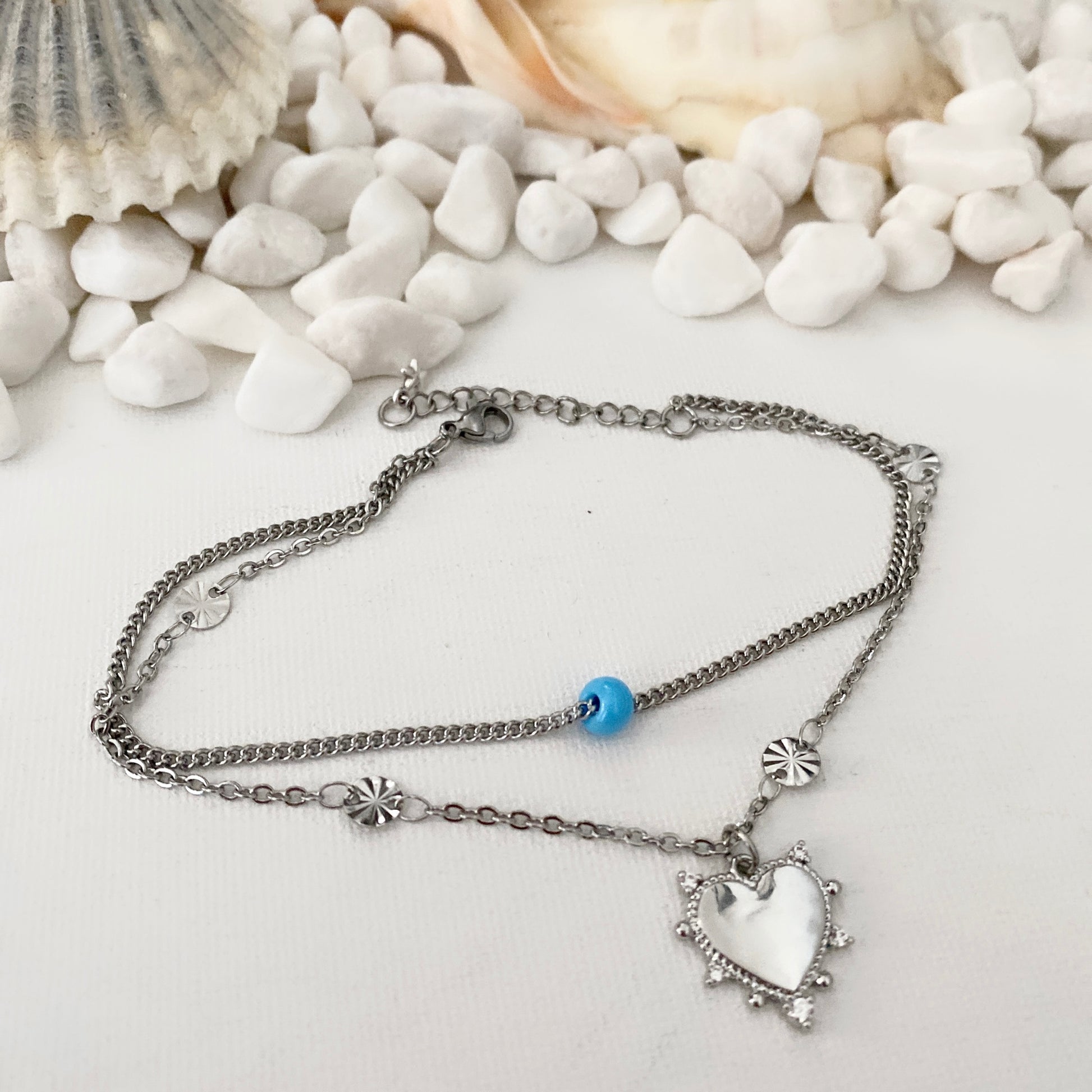 #2 Double chaîne en acier inoxydable avec perle de verre bleue et cœur en acier inoxydable