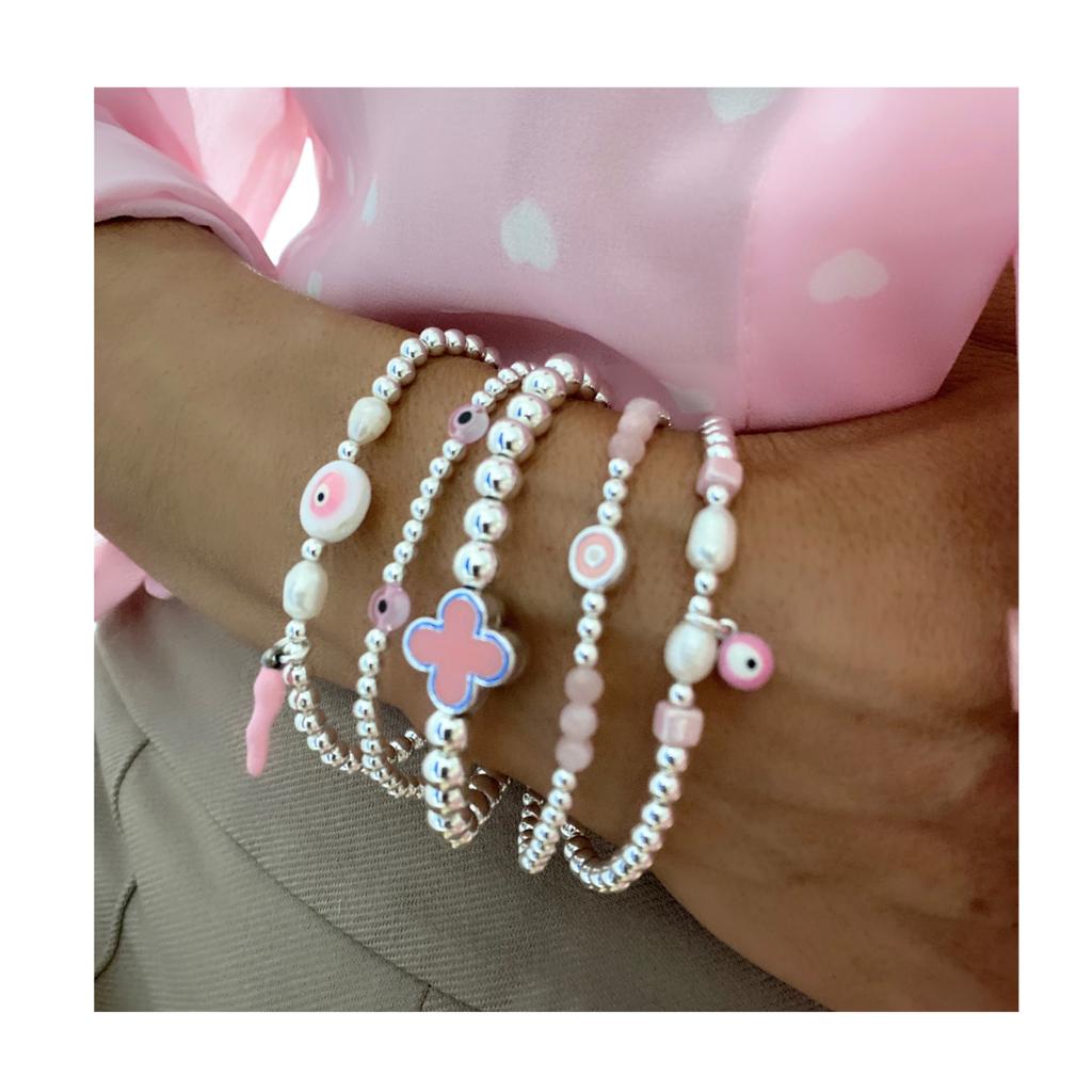 #1 Hématite plaqué argent 4mm avec perles d'eau douce, oeil & corne (stretch)