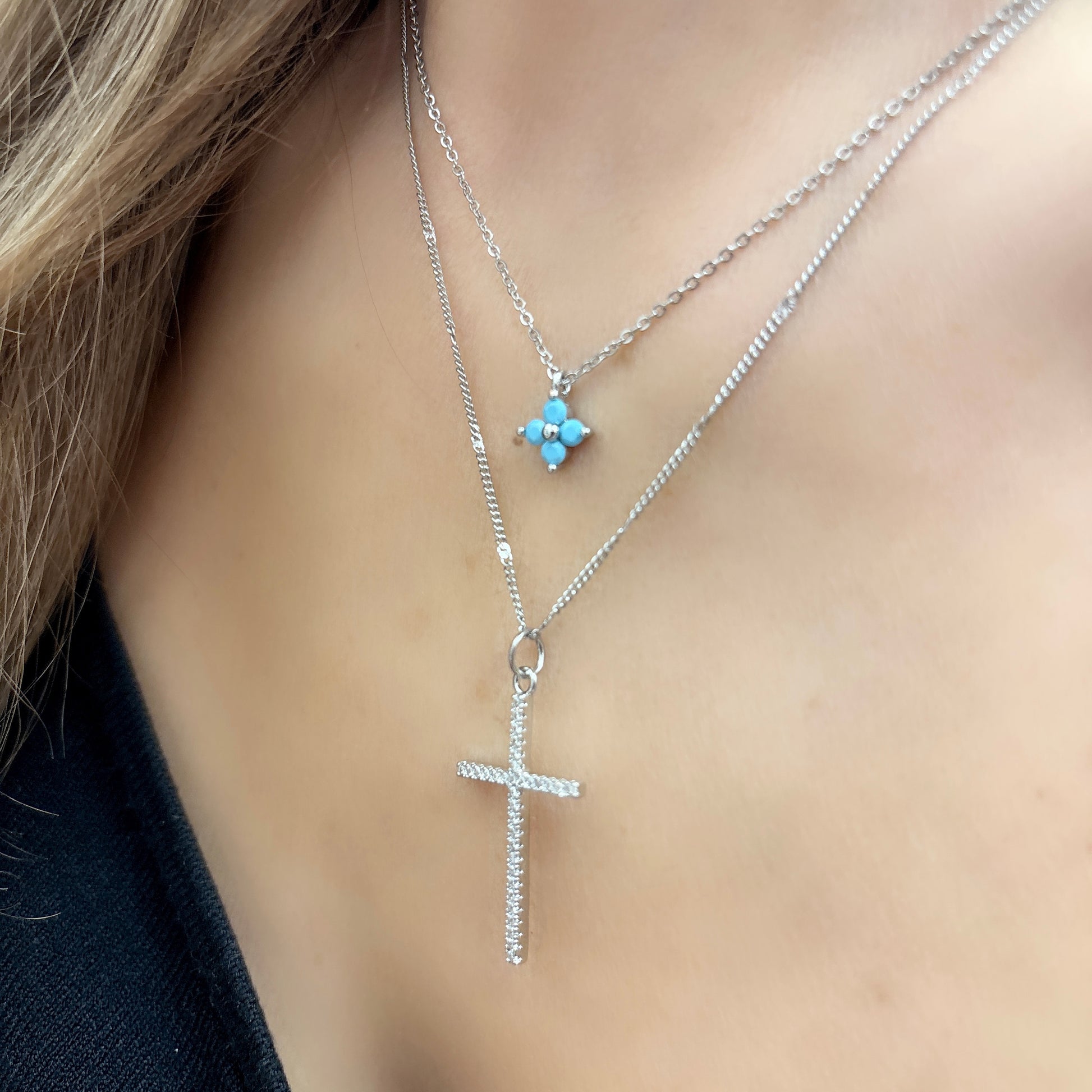 Sublimez votre style avec les COLLIERS ZENIA ! Ces magnifiques chaînes en acier inoxydable arborent une minuscule croix turquoise superposée à une délicate croix en oxyde de zirconium. Soyez à la fois élégante et confiante avec cet accessoire unique et plein de sens.