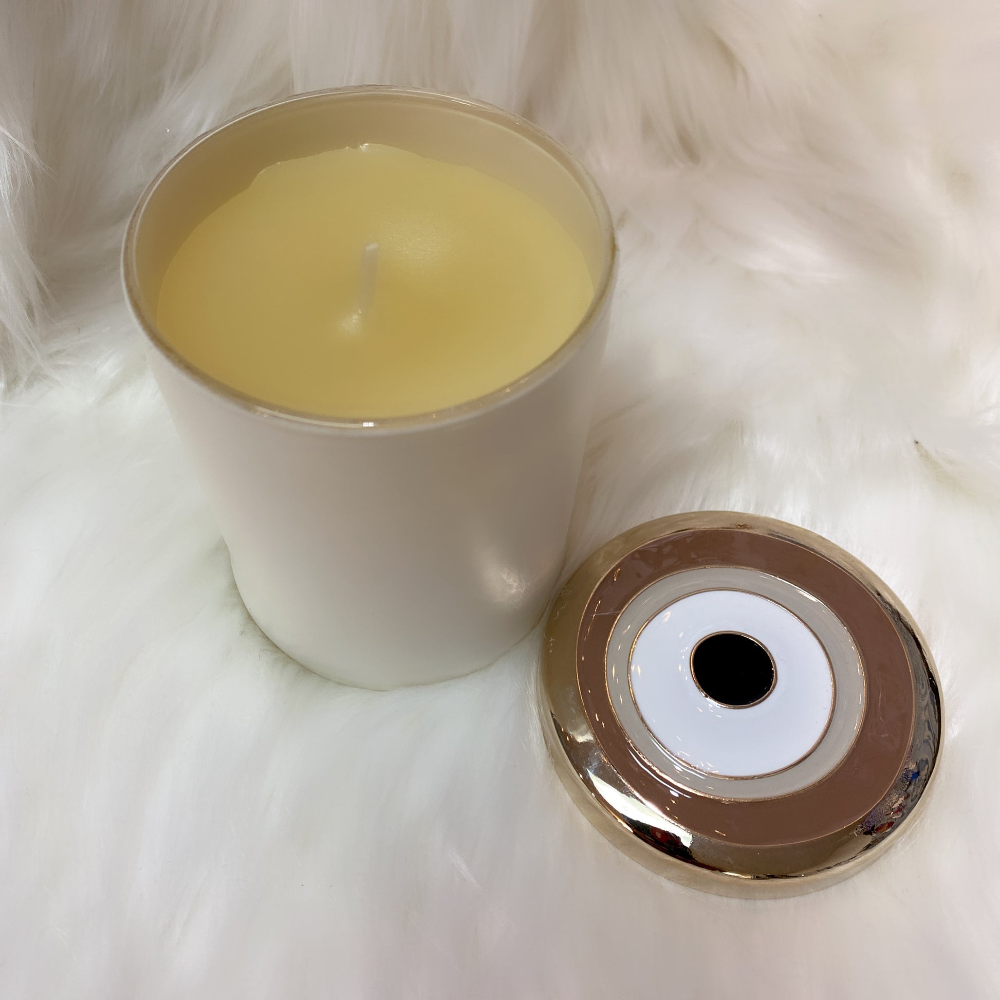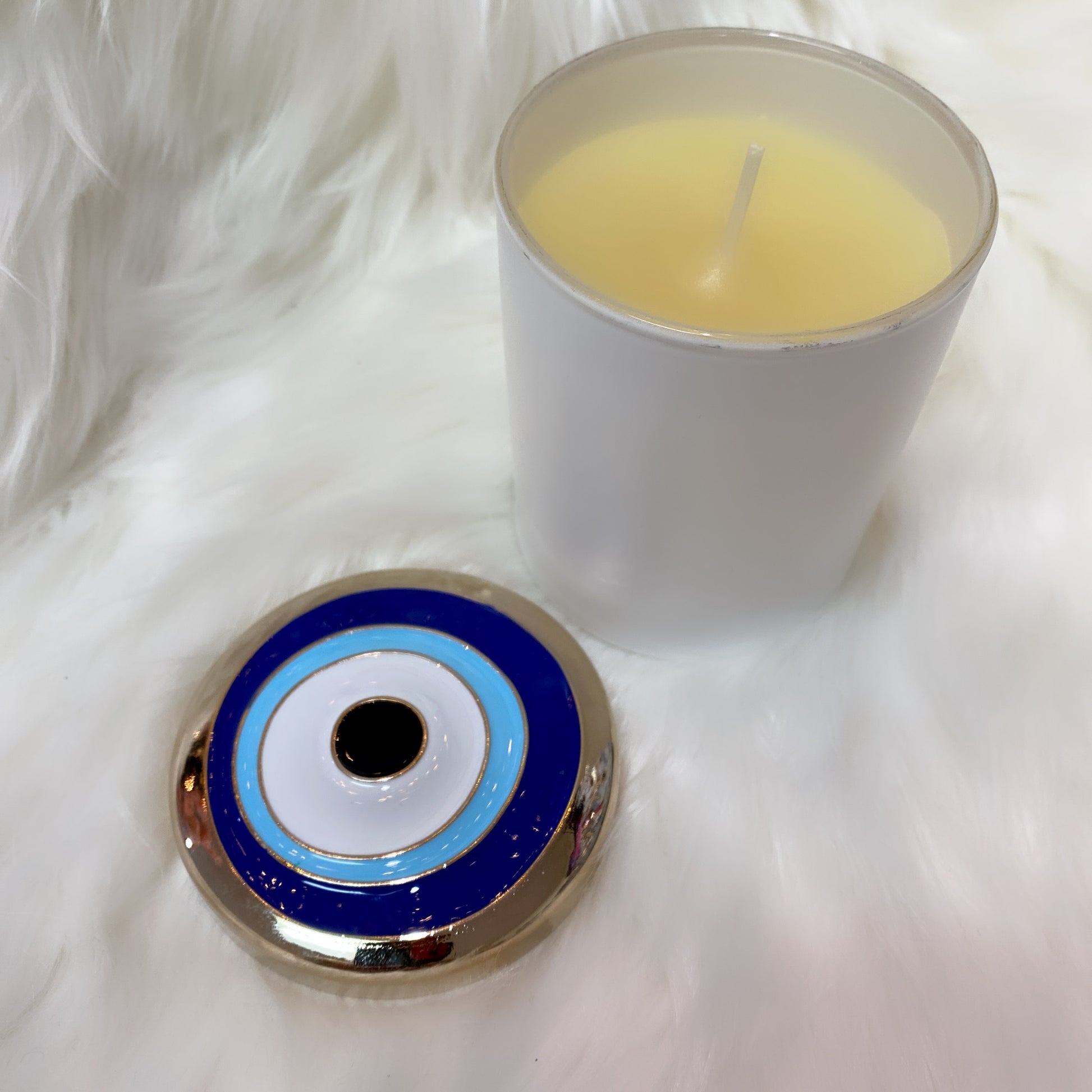 Beautiful scented candle with decorative evil eye design cover