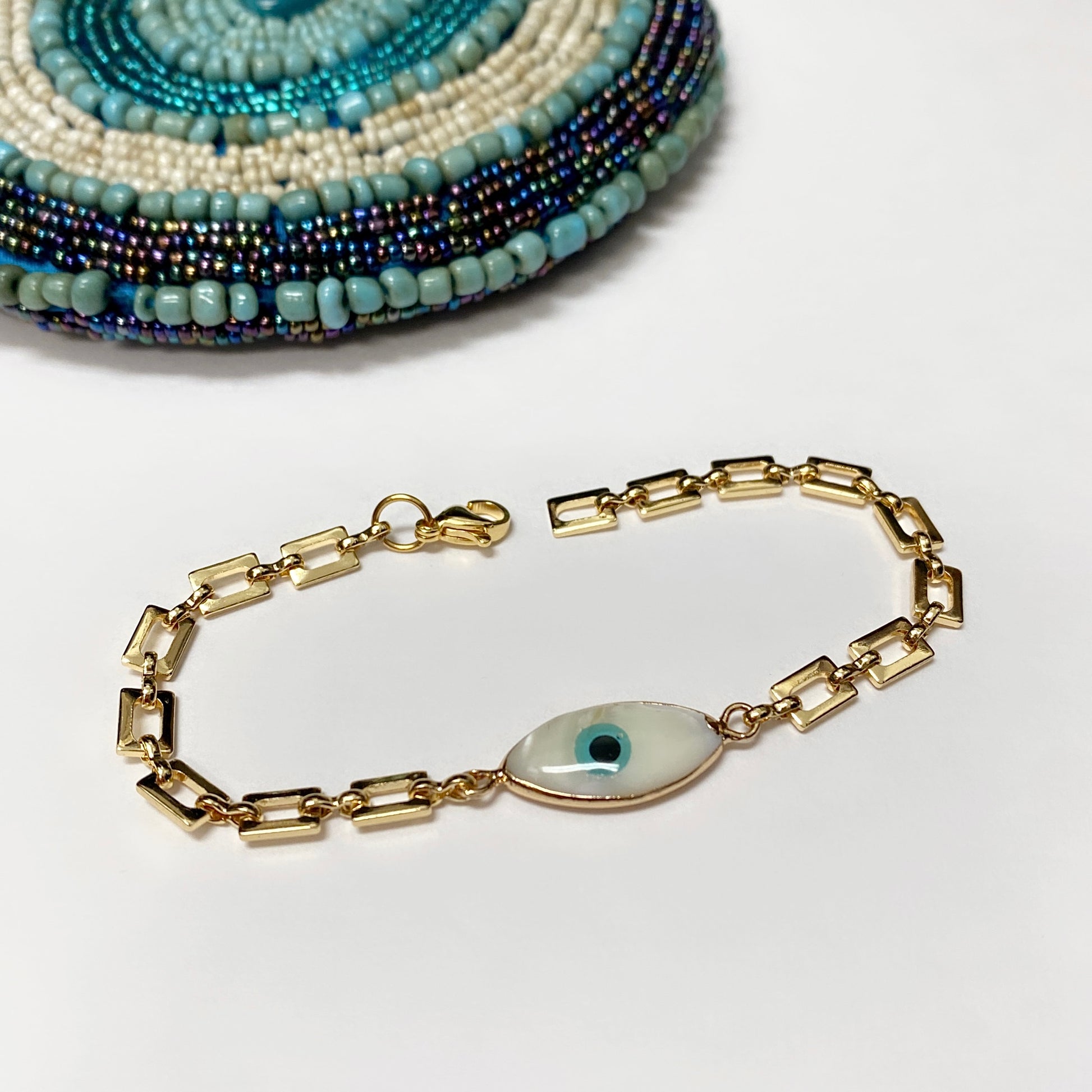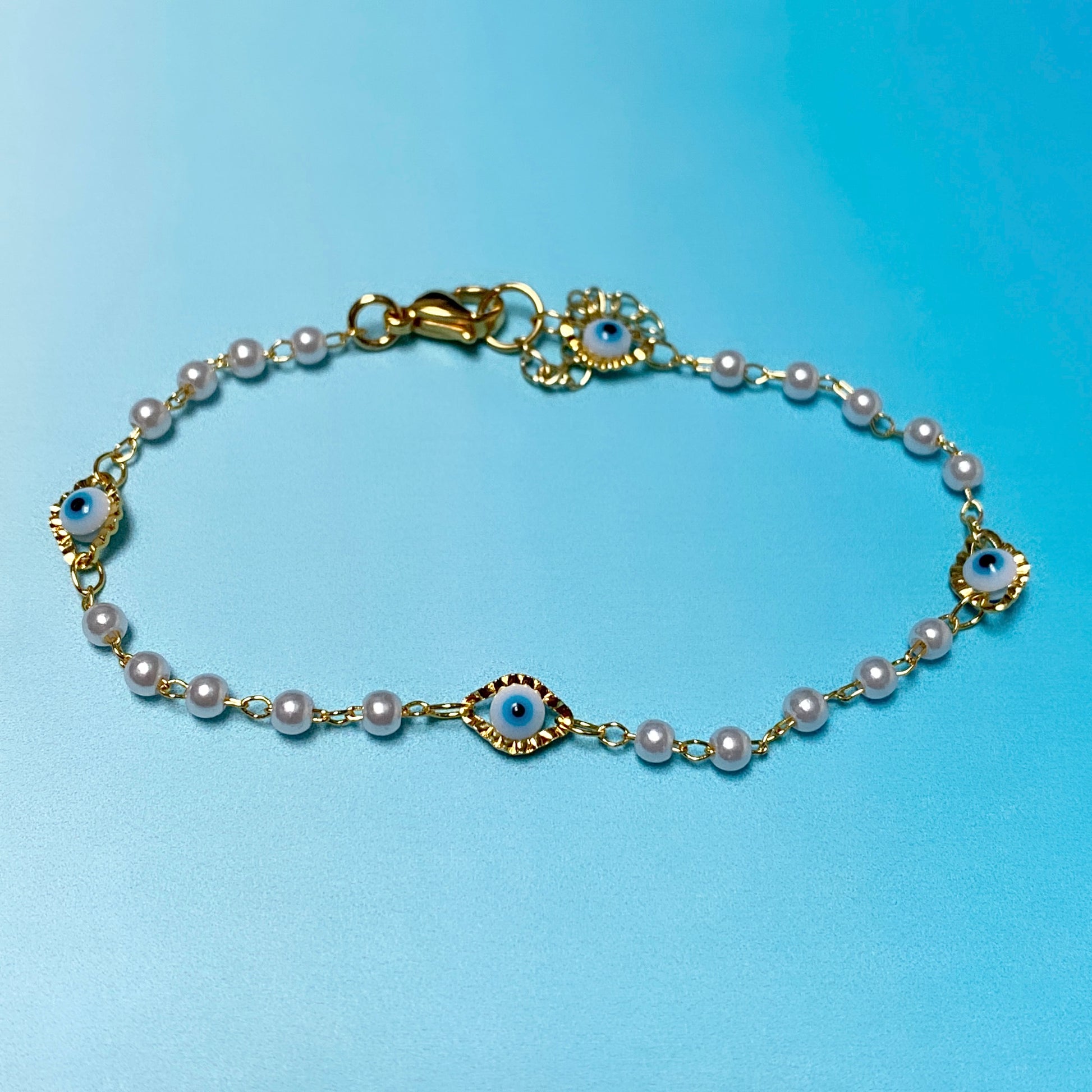 #1 Hematite gold plated 3mm bead & faux pearls with enamel eye stretch,