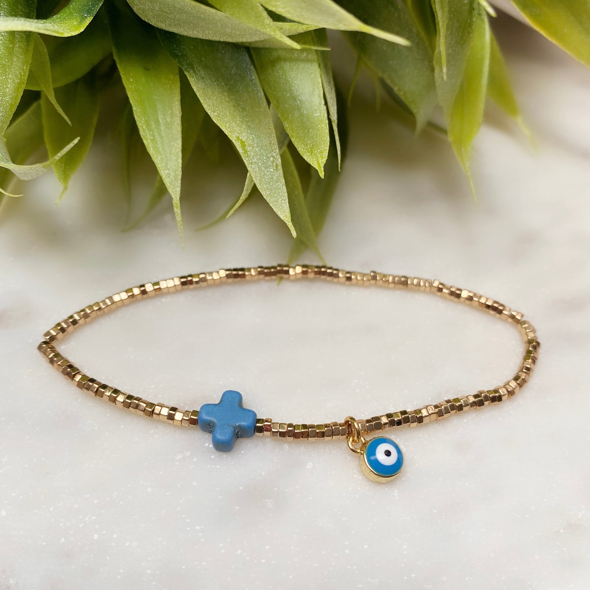#5 Hematite gold plated with Howlite cross and enamel eye (stretch)
