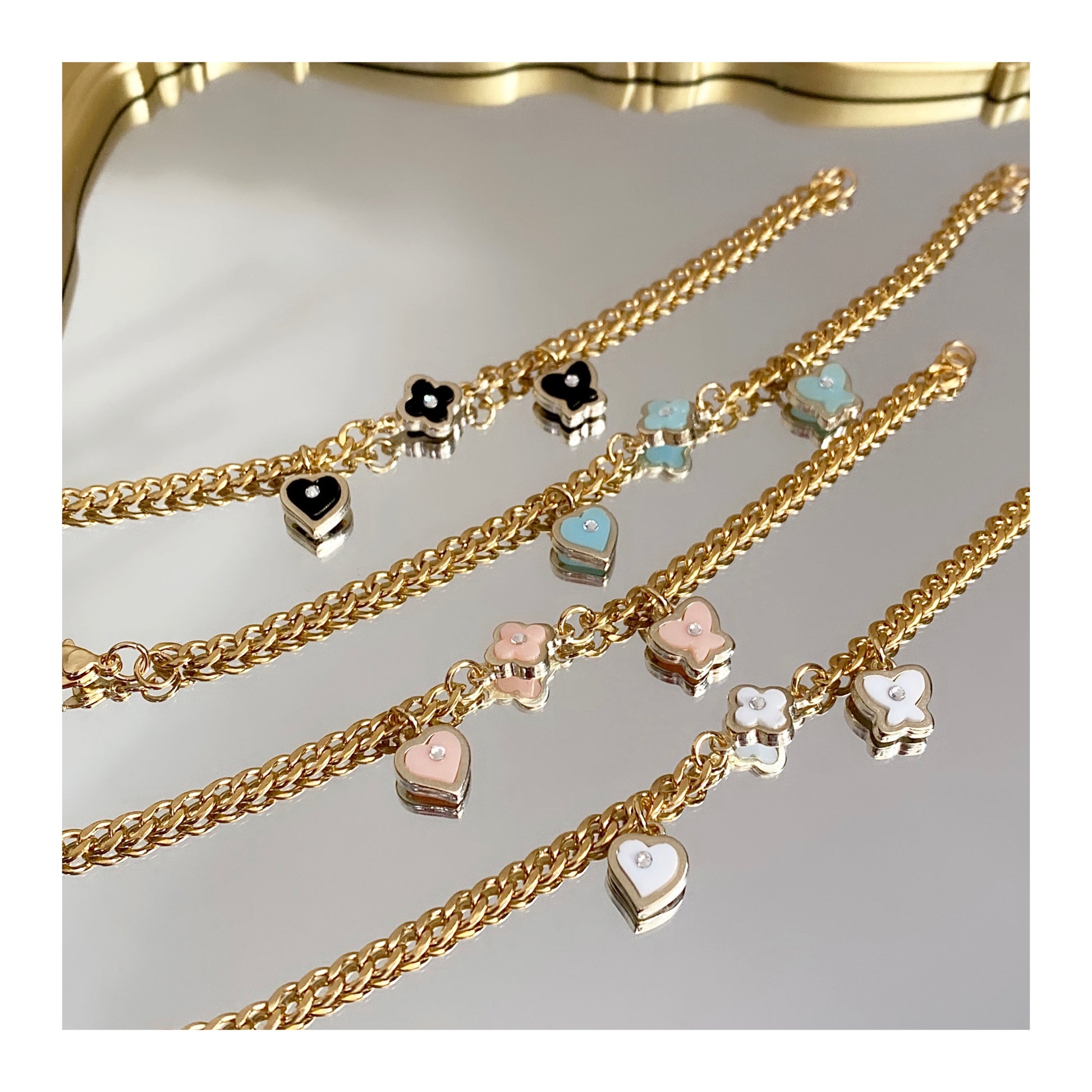 Stainless gold plated cuban link bracelet with plexi flower connector and dangling  plexi heart & butterfly charms.