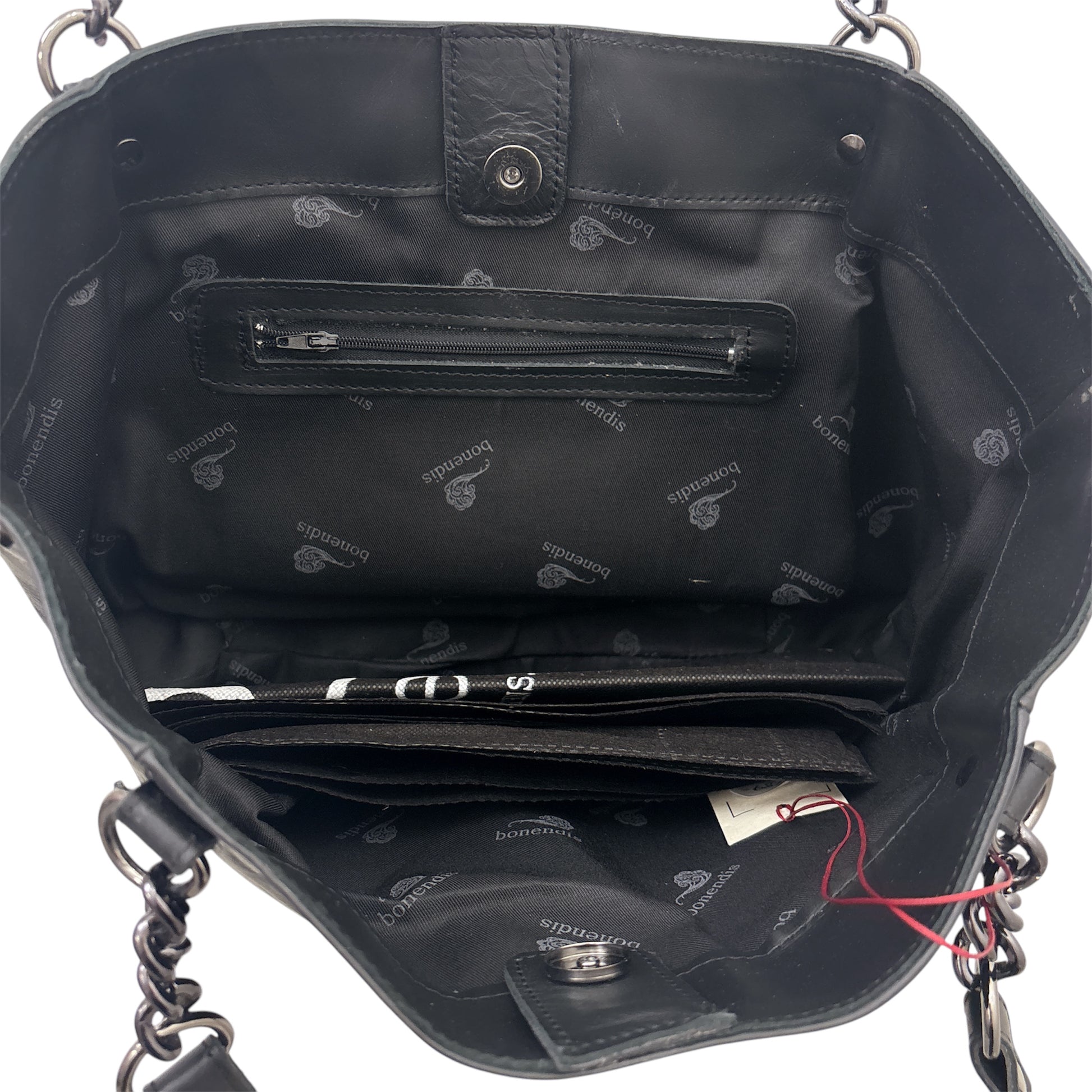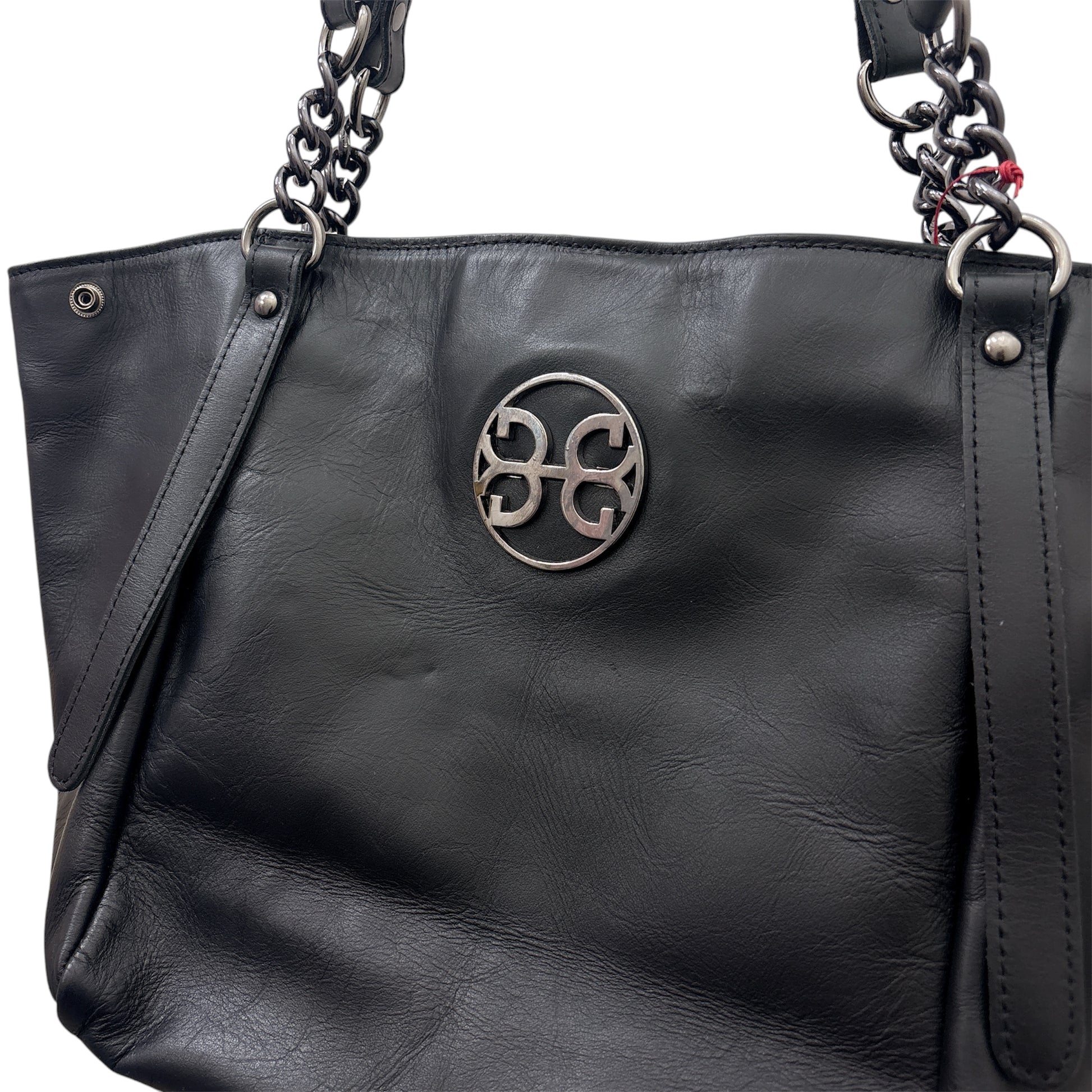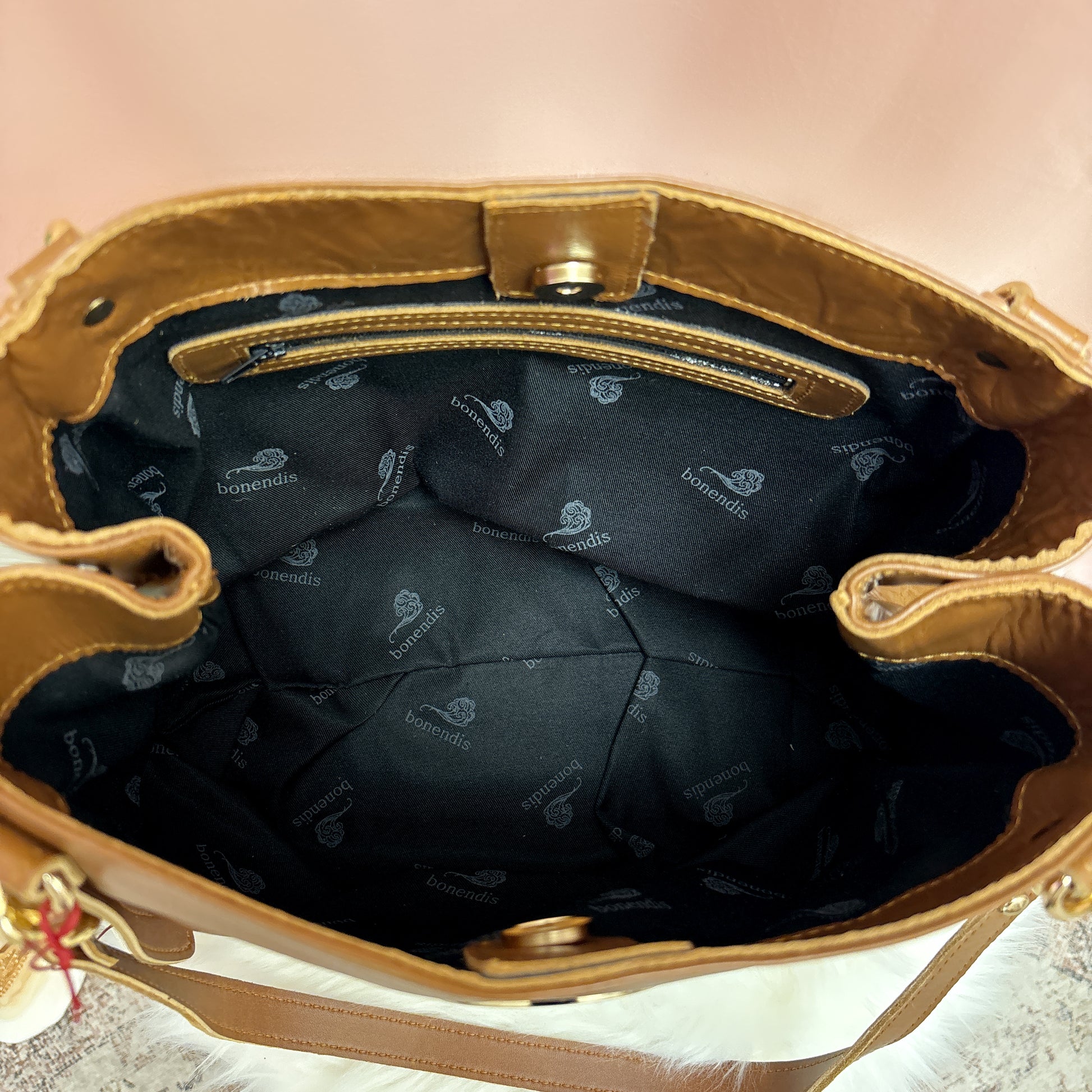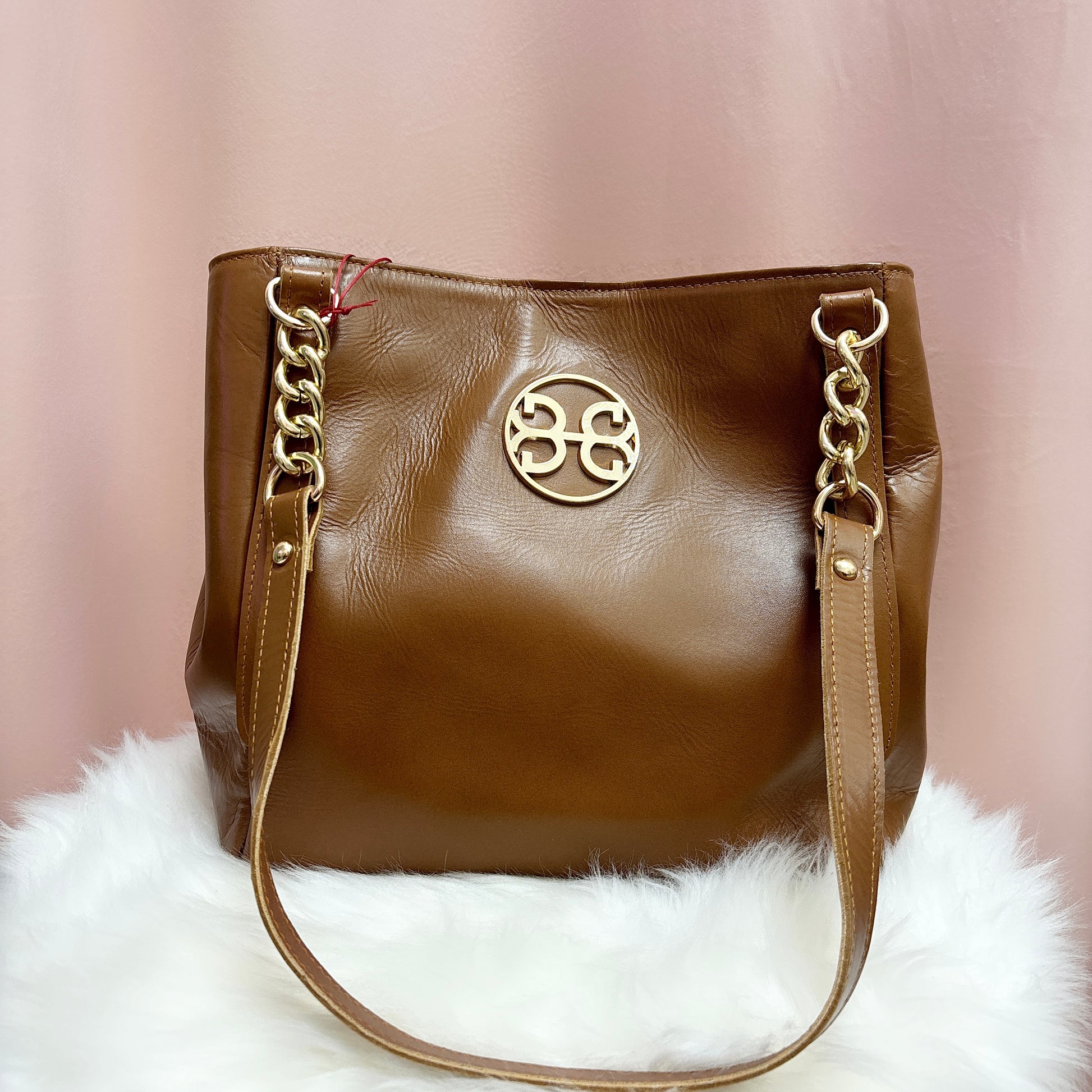 Indulge in luxury with the CAMIL LEATHER TOTE. Crafted from rich brown leather, this tote effortlessly expands on the sides for additional space or can be styled as a chic purse. The elegant chain embellishment on the leather straps adds a touch of sophistication. With its generous size, this tote is perfect for carrying all your essentials, making it the perfect accessory for any occasion. Elevate your style with the CAMIL LEATHER TOTE