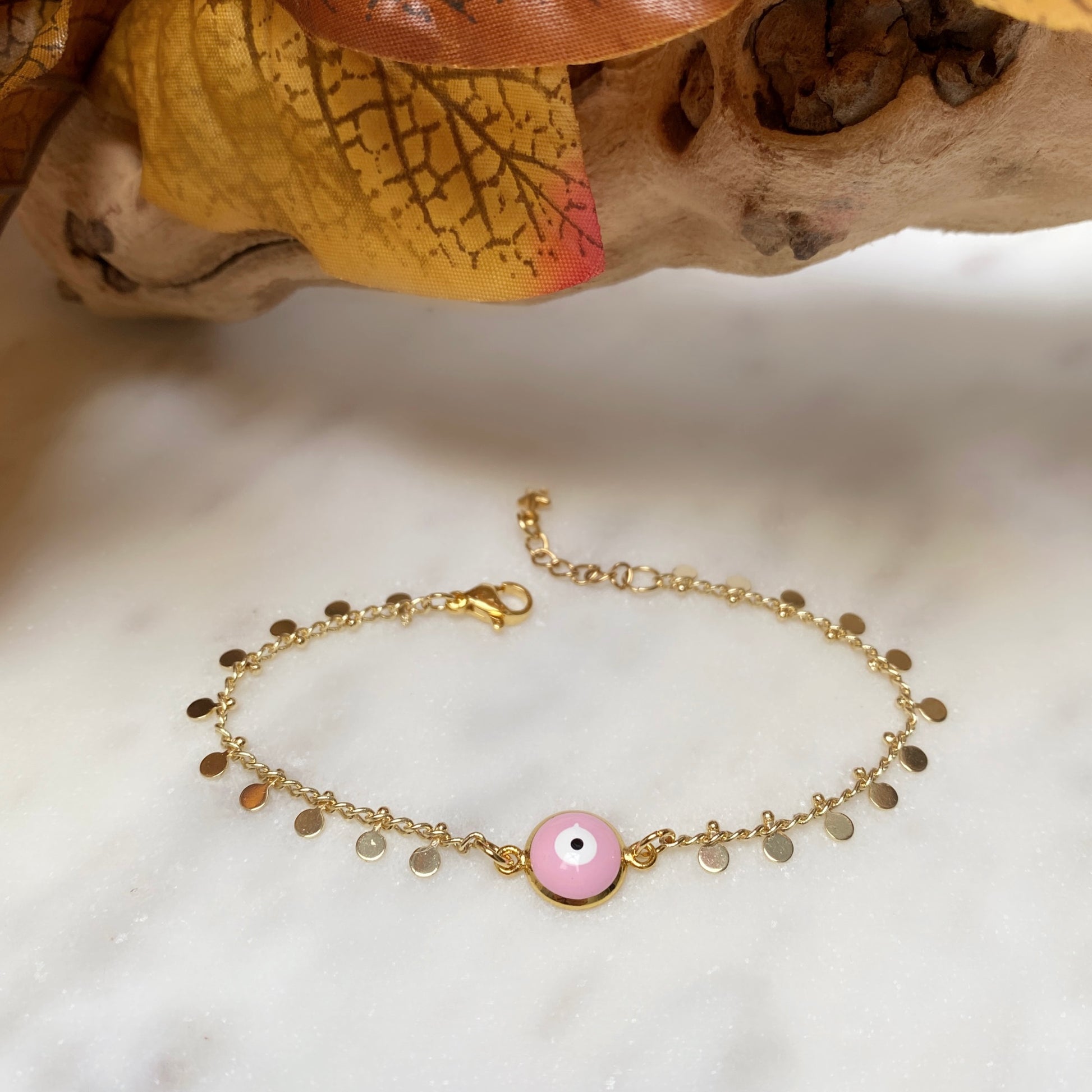 Brass chains with various embellishments in pink accents