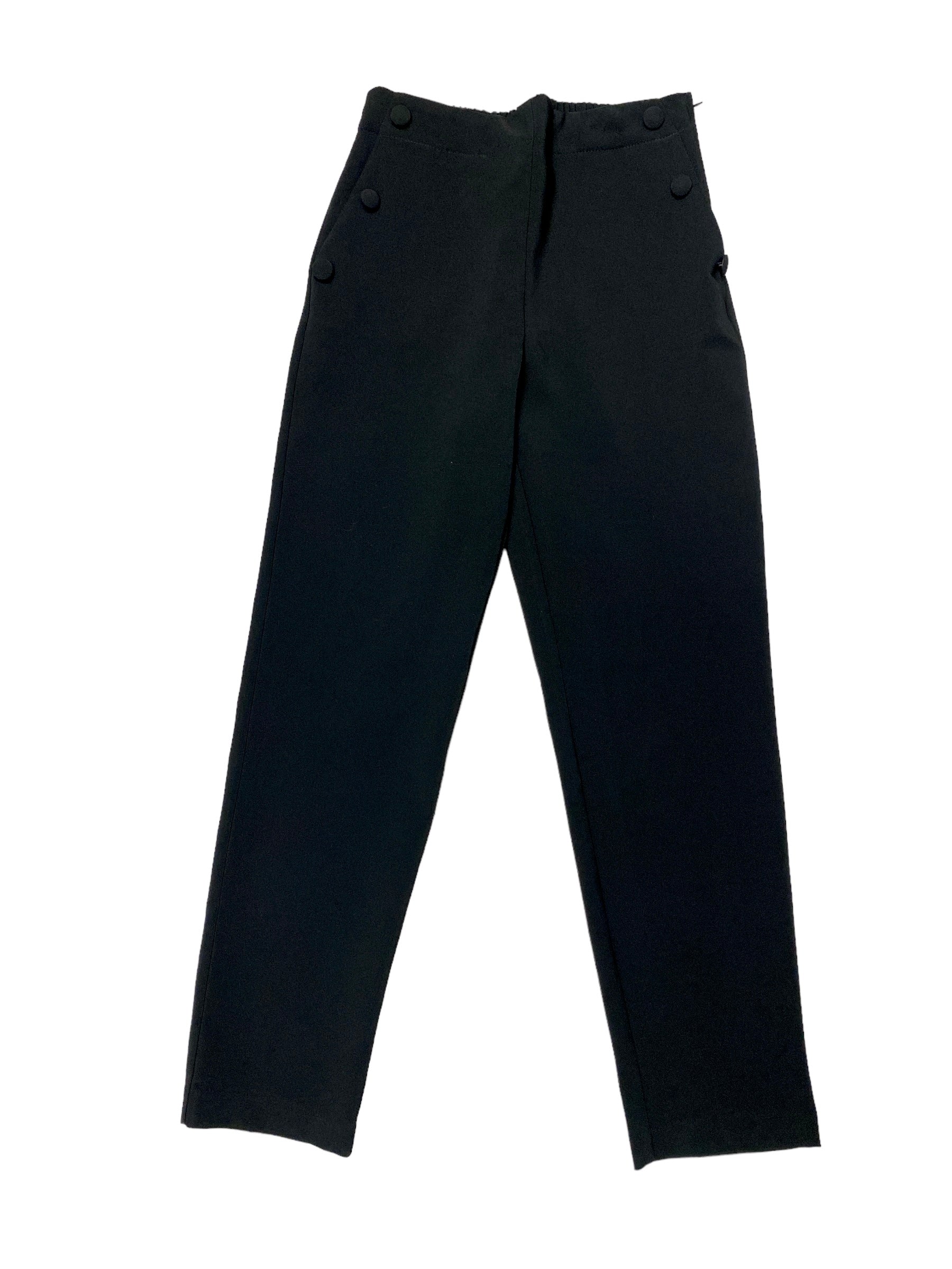Straight cut pant with buttons on each side, pockets, zipper on the side and elastic back. This pant fits amazing and is extremely comfortable