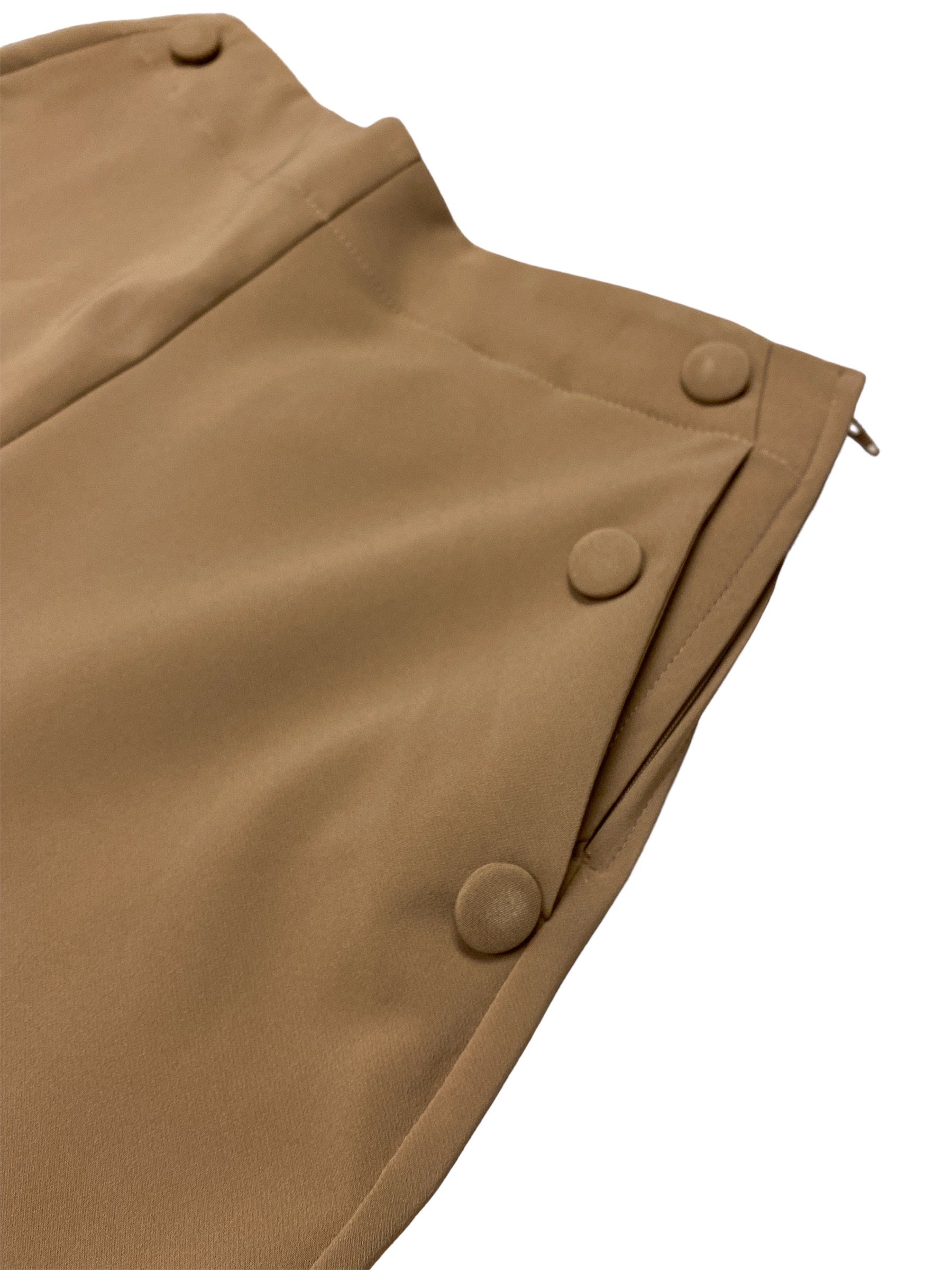 Straight cut pant with buttons on each side, pockets, zipper on the side and elastic back. This pant fits amazing and is extremely comfortable