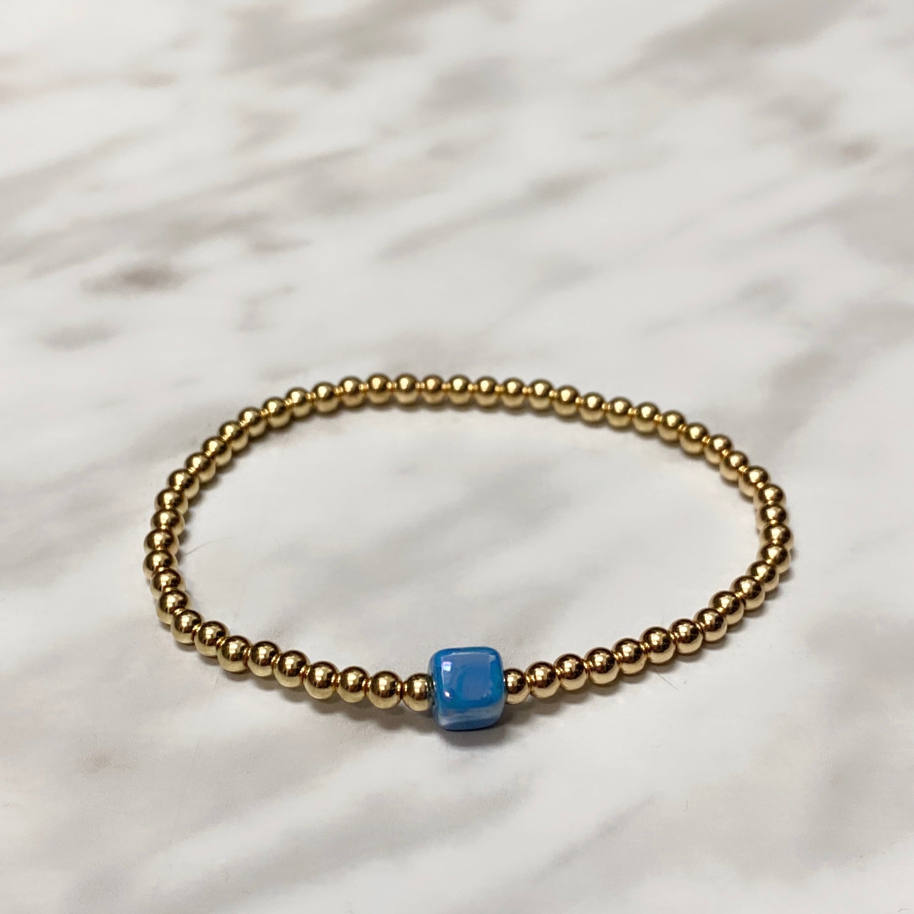 Hematite gold plated 3mm bead with blue ceramic cube centre (stretch)